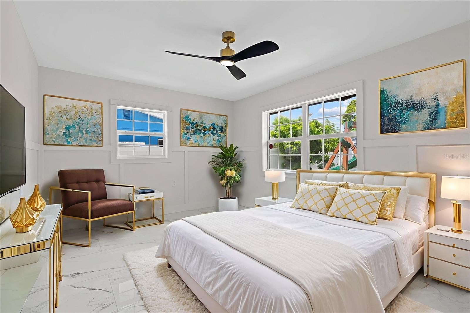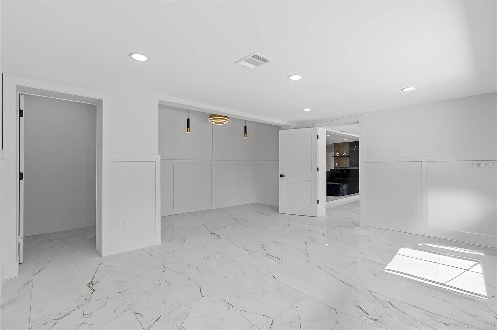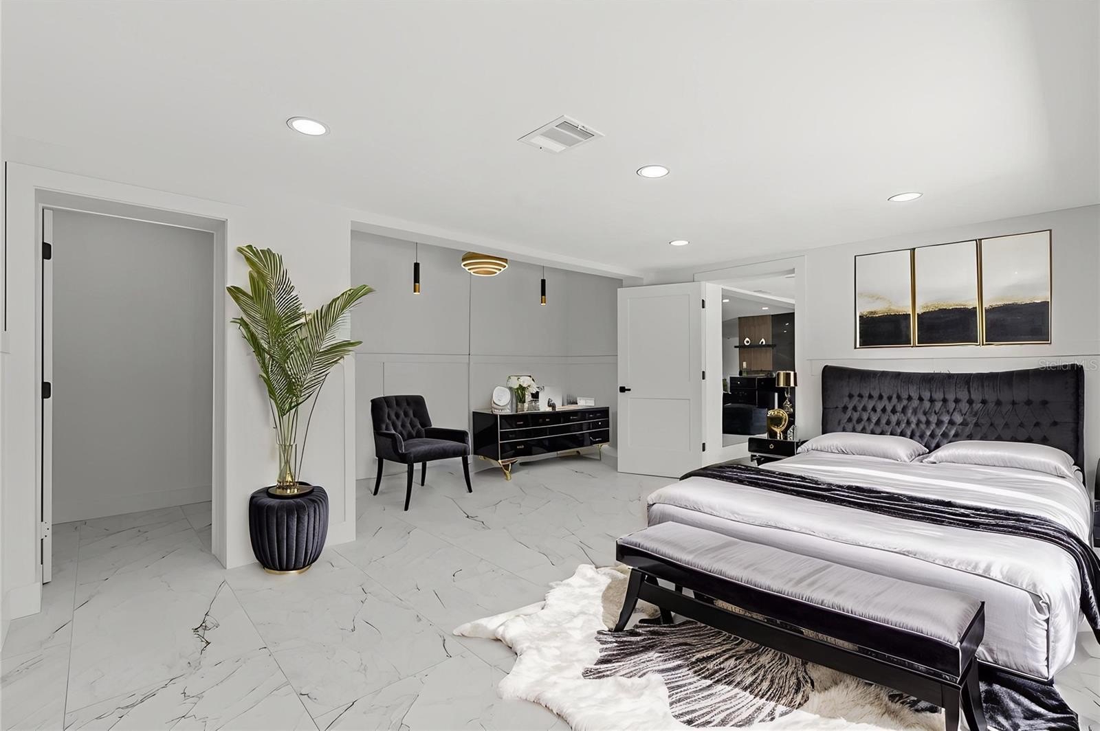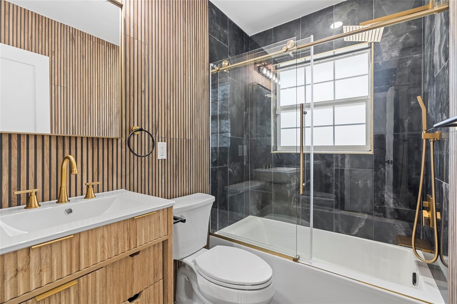 The primary suite boasts a large walk-in closet and tulum-inspired bath featuring dual vanities, diamond sinks, frameless shower doors, a dual rainfall shower with separate handle, and a custom LED niche for shampoo and conditioner. Two additional bedrooms with deep closets share a beautifully updated bath with modern tile and elegant gold accents. and a custom wet bar with wine cooler is perfect for entertaining.