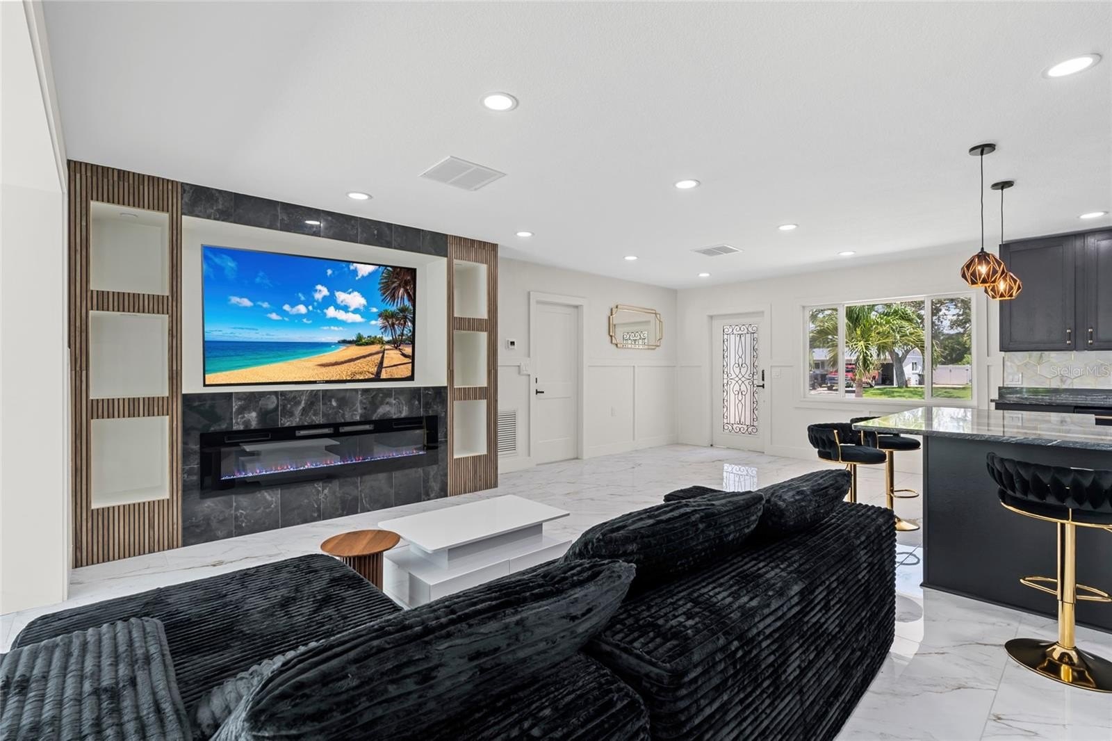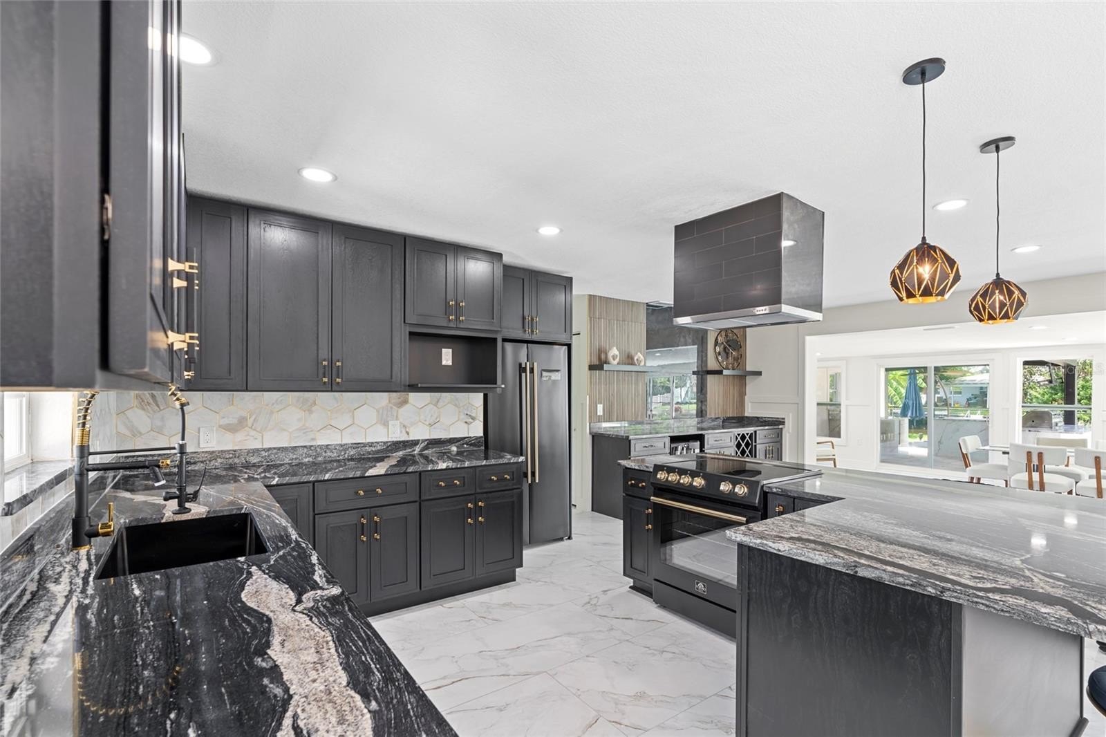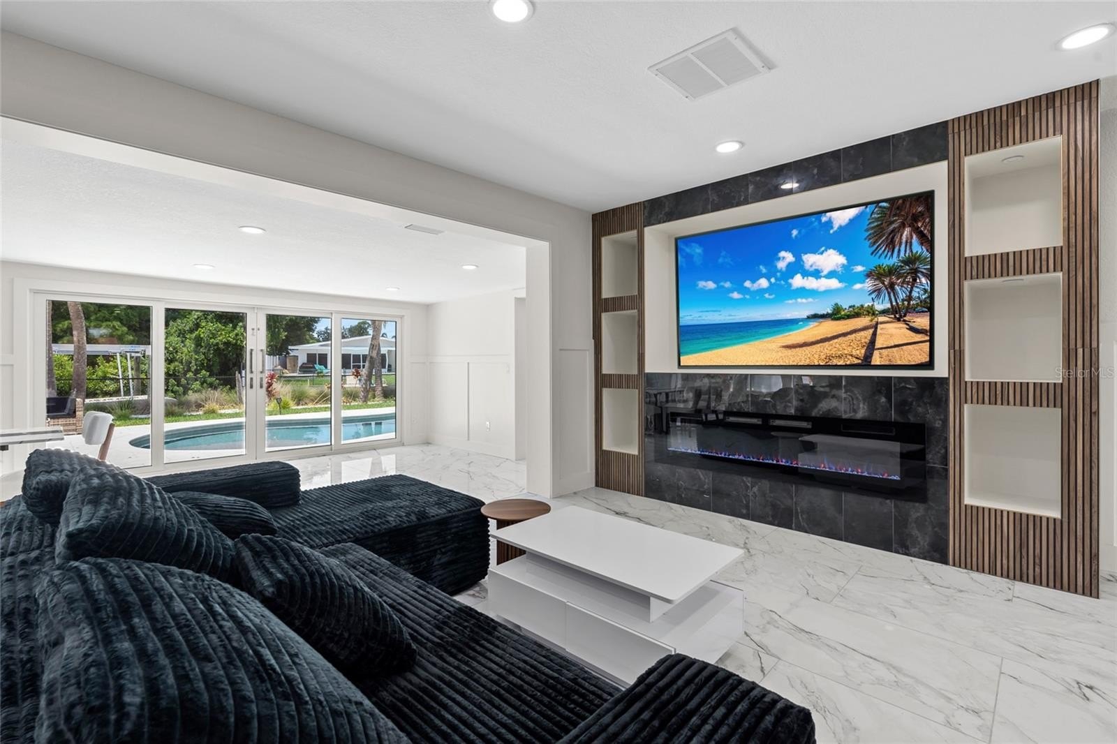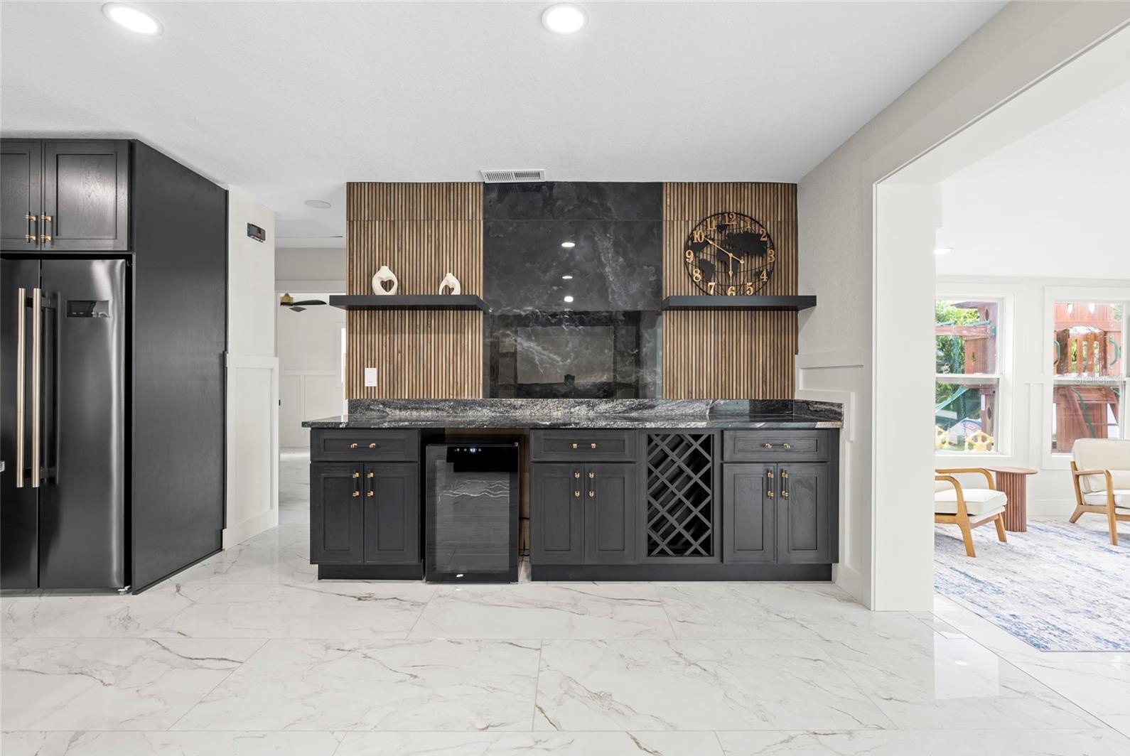 The chef’s kitchen features custom Lilly Anne cabinetry, granite countertops, premium Forno appliances, and a high-grade tile backsplash with striking gold accents. A custom wet bar with granite counters, wine racks, wine cooler, and extra cabinetry is ready for effortless entertaining. The living area centers around a built-in entertainment wall with recessed cubbies and an electric heated fireplace that invite cozy evenings with friends or quiet nights in. Just beyond, an enclosed Florida room stretches toward the water, creating a versatile space to dine, relax, or simply watch the sunlight dance across the pool.