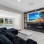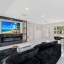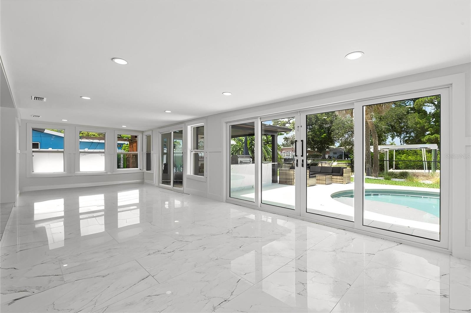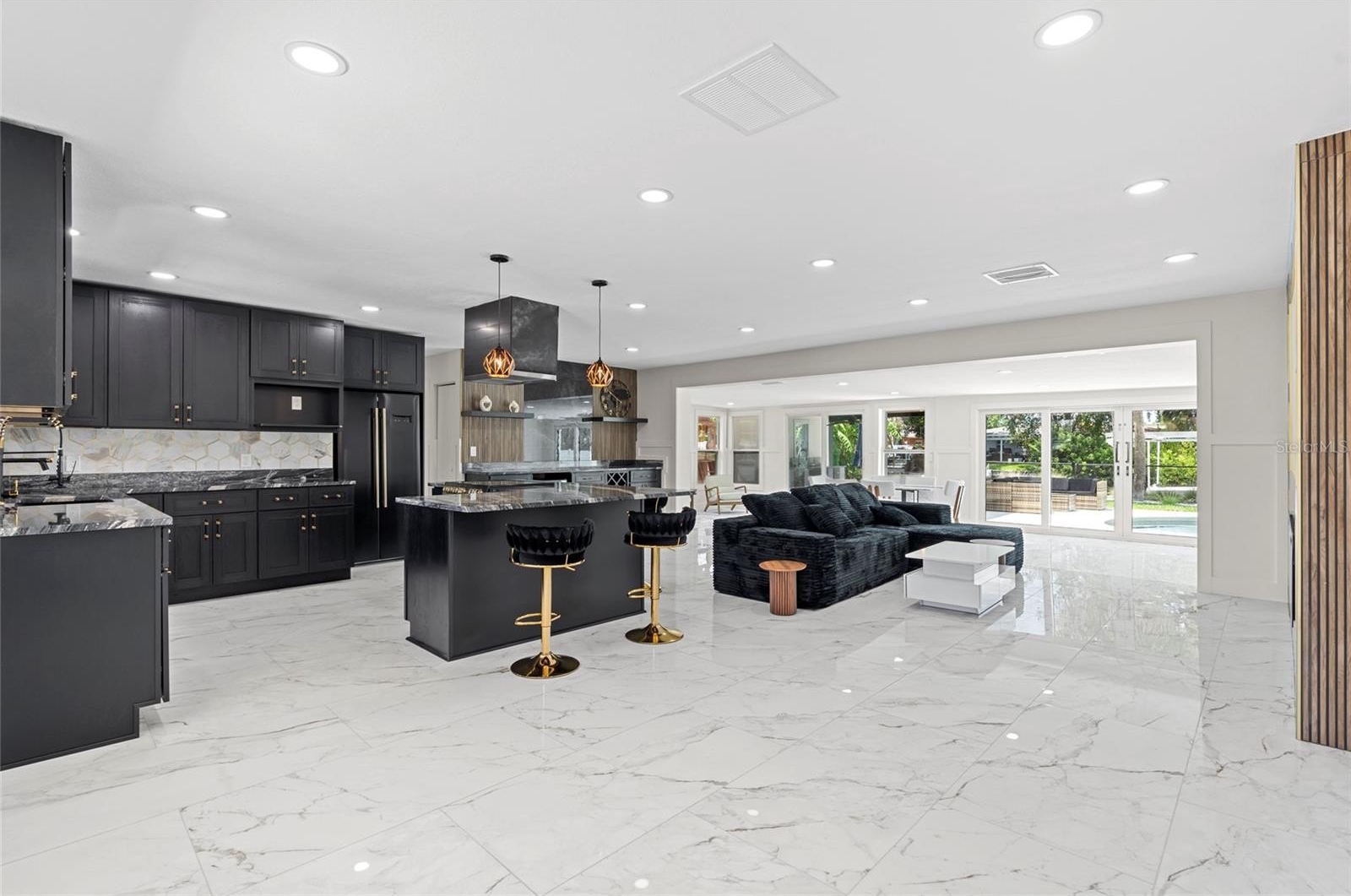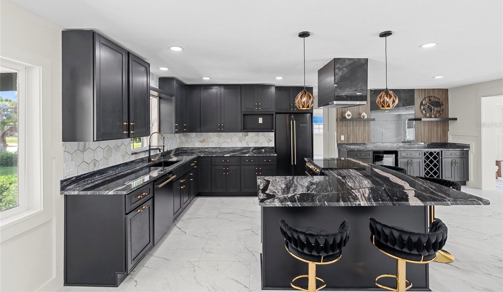 The chef’s kitchen features custom Lilly Anne cabinetry, granite countertops, premium Forno appliances, and a high-grade tile backsplash with striking gold accents. A custom wet bar with granite counters, wine racks, wine cooler, and extra cabinetry is ready for effortless entertaining. The living area centers around a built-in entertainment wall with recessed cubbies and an electric heated fireplace that invite cozy evenings with friends or quiet nights in. Just beyond, an enclosed Florida room stretches toward the water, creating a versatile space to dine, relax, or simply watch the sunlight dance across the pool.