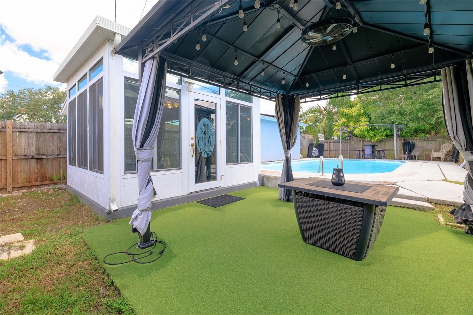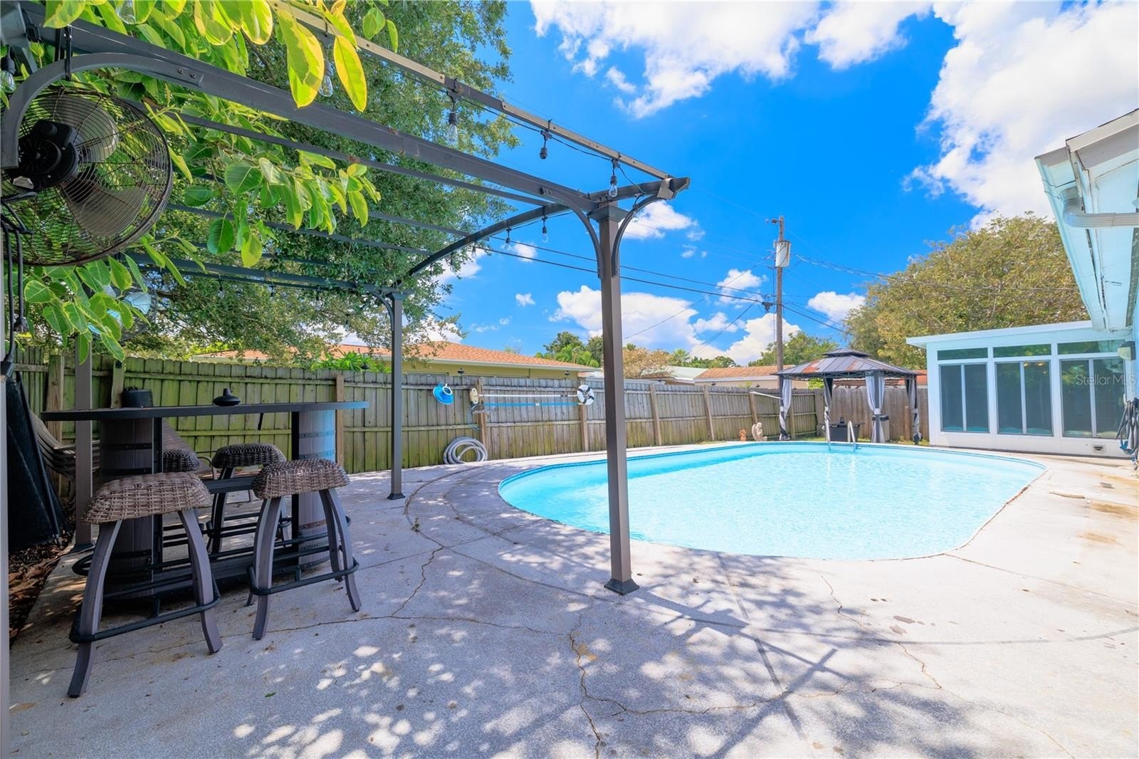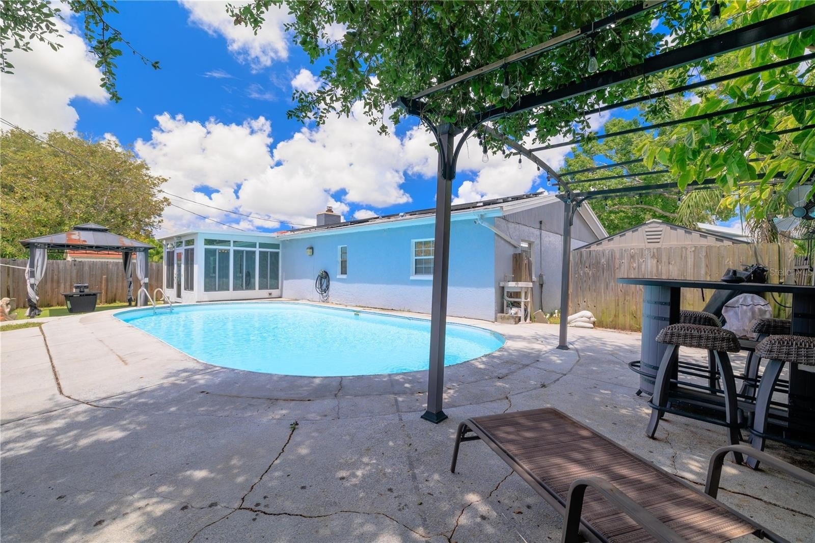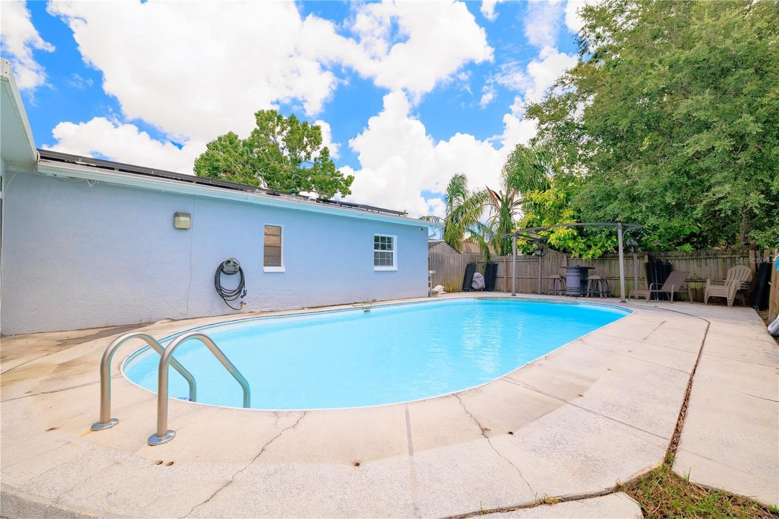 Welcome to this 3-bedroom, 2-bath block home in the heart of Pinellas Park, offering over 1,600 sq. ft. of living space including a versatile bonus room and sunroom. As you enter through the front door, you’re greeted by a beautiful kitchen with a built-in workspace, perfect for cooking and staying organized. The living area features a cozy fireplace, while the large bonus room and sunroom provide flexible space for a home office, playroom, or extra living area. Outdoors, enjoy the in-ground pool and low-maintenance yard, ideal for Florida living. The property also includes three storage sheds, with the main oversized shed (nearly the size of a one-car garage) conveniently accessible from the front yard. Additional updates include all new plumbing throughout, solar panels and roof for energy efficiency and long-term savings. This home has been lovingly cared for and is ready for its next chapter. Conveniently located near shopping, dining, and just a short drive to the beaches, downtown St. Pete, and Tampa International Airport, this home offers both comfort and convenience.