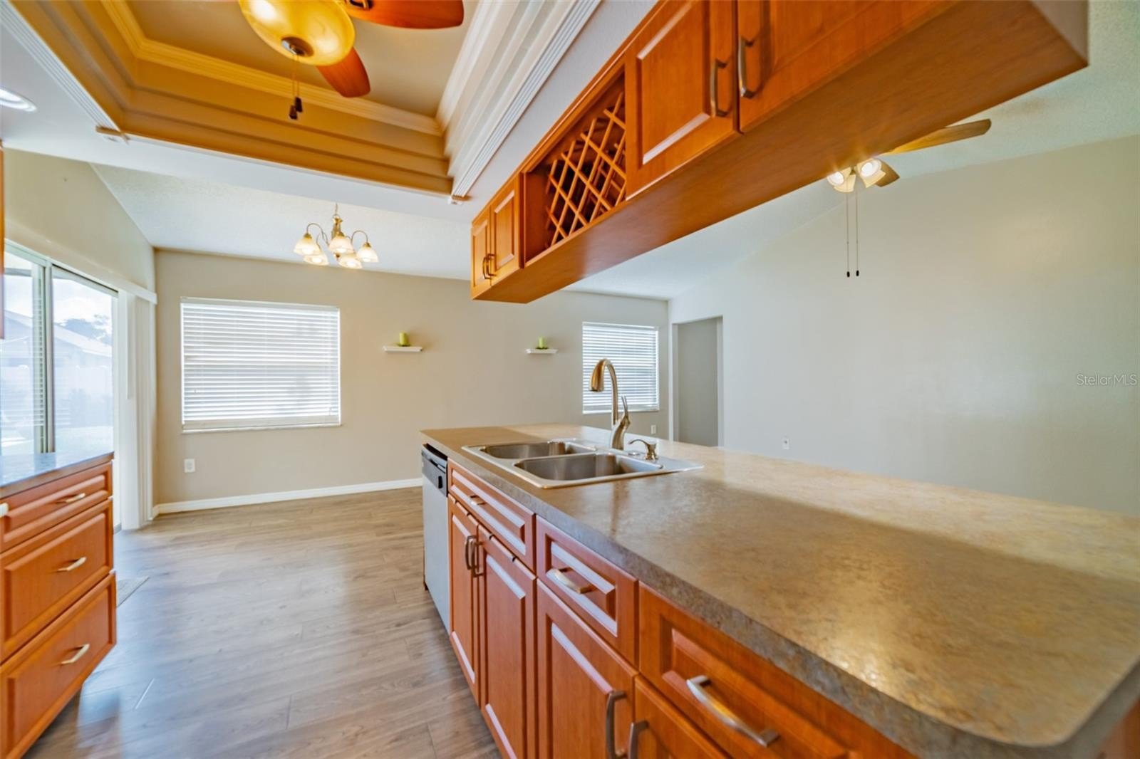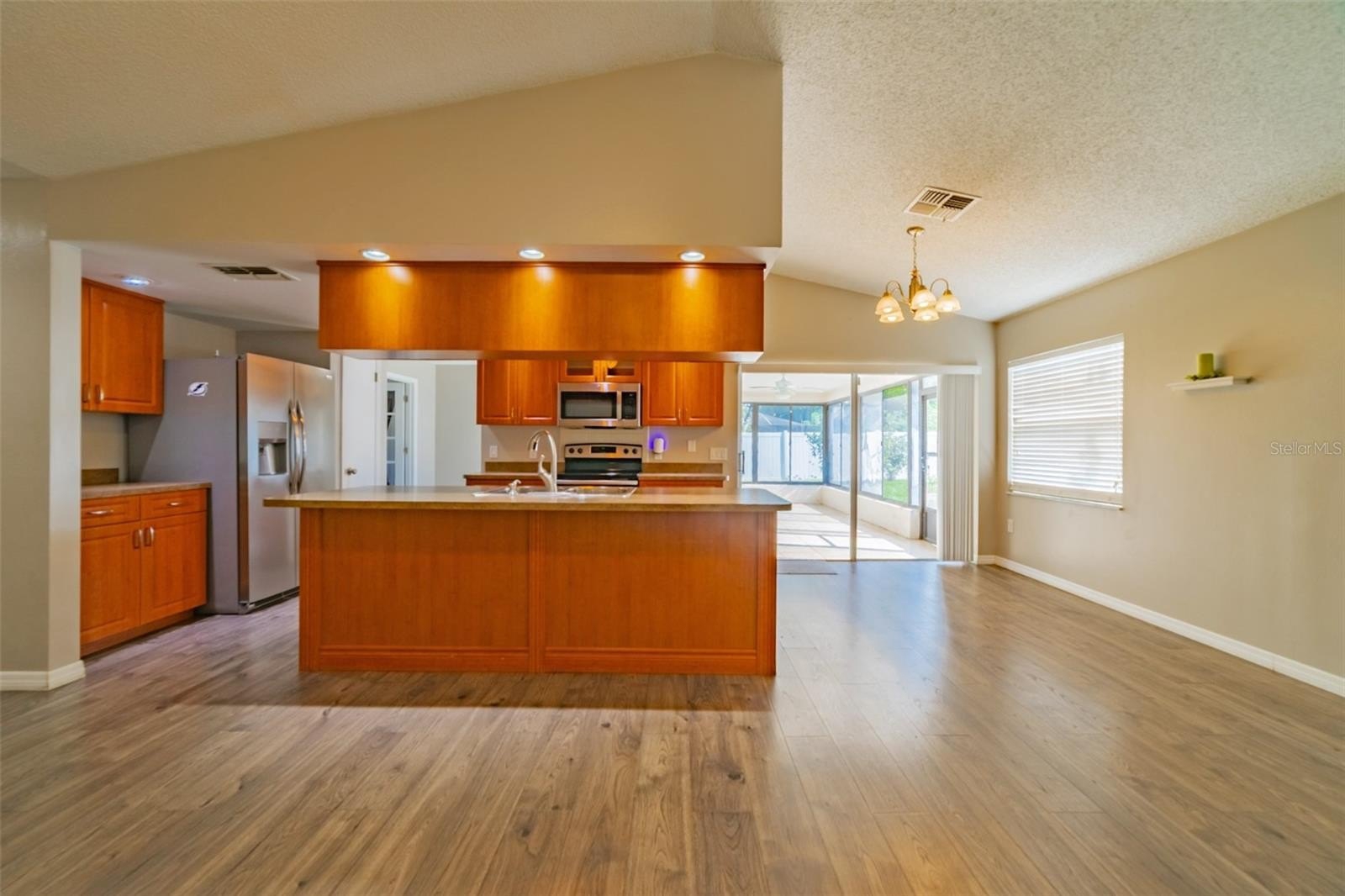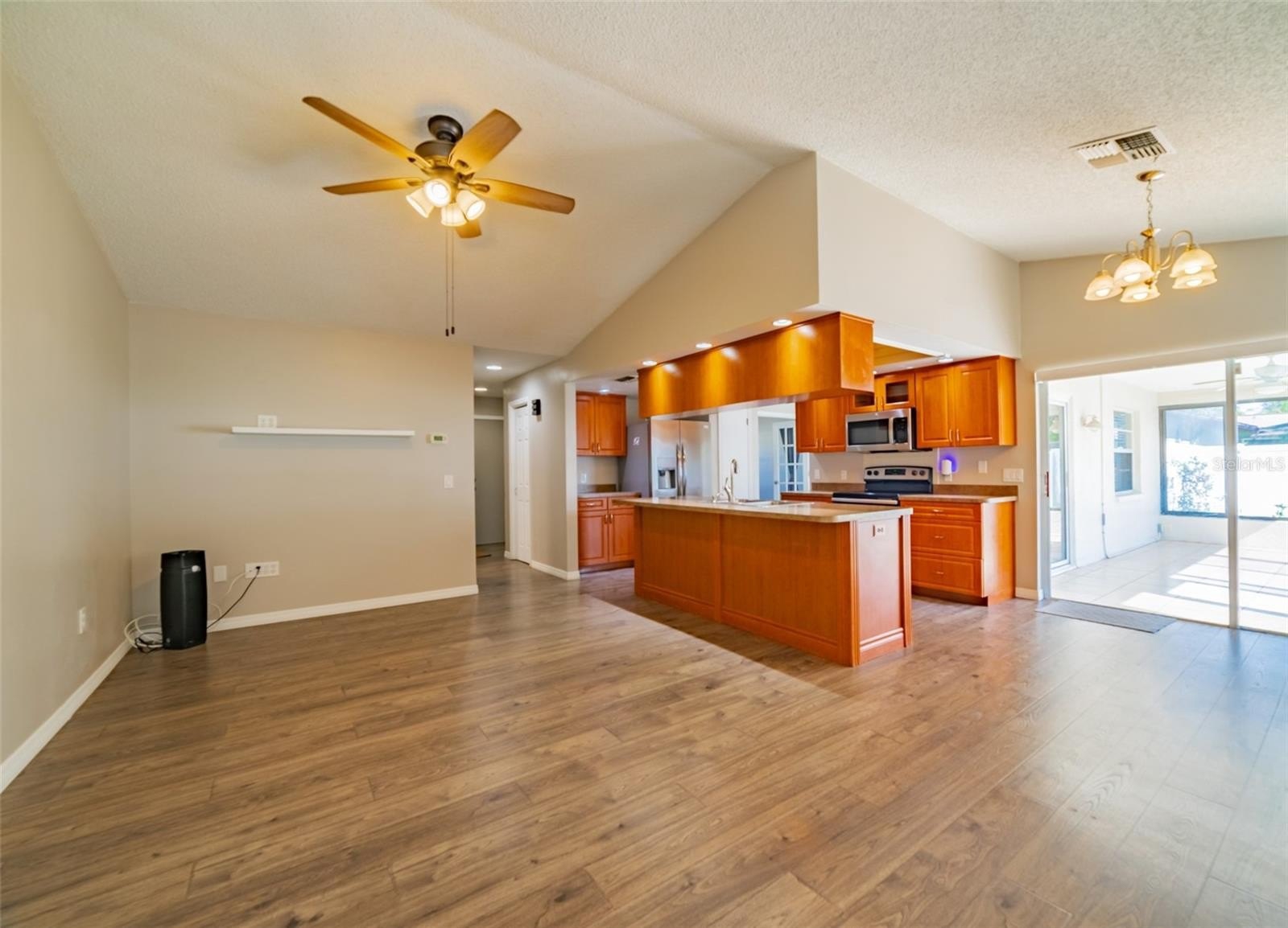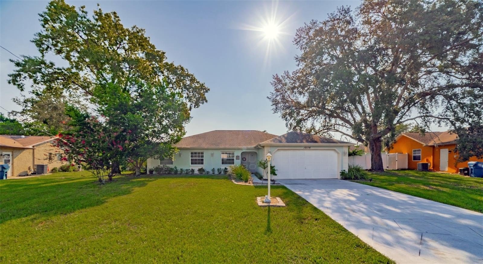 Charming and beautifully cared for three-bedroom, two-bath home situated in the heart of Spring Hill. This home features fresh paint and luxurious vinyl flooring throughout. The kitchen boasts a brand new stove, wooden cabinets, an island with a sink, and ample space for bar stools. Additionally, there is a closet pantry and a coffee bar area. This open-concept kitchen provides space for a cozy dining area and a family room. Adjacent to the kitchen is a flexible space that can serve as an extra dining area, an office, or a playroom, complete with sliding glass doors that open to an enclosed patio, which leads to a beautifully maintained oversized backyard featuring a newer PVC privacy fence. An outdoor patio includes a path that guides you to a fire pit area, all constructed with pavers, perfect for enjoying quiet evenings under the stars. The fence is adorned with mature plants including 2 blueberry bushes that produce fruit enhancing the view. All three bedrooms are generously sized, complete with closets, while the master suite includes its own spacious bathroom. Both bathrooms have been updated. On the way to the two-car garage, you will find the laundry room, which includes closet storage, a large laundry sink, and a washer and dryer, with extra space for shelving and more. This lovely home is conveniently located off Spring Hill Drive and is just a short distance from shopping, medical facilities, restaurants, a waterfront park, and the expressway leading to Tampa.