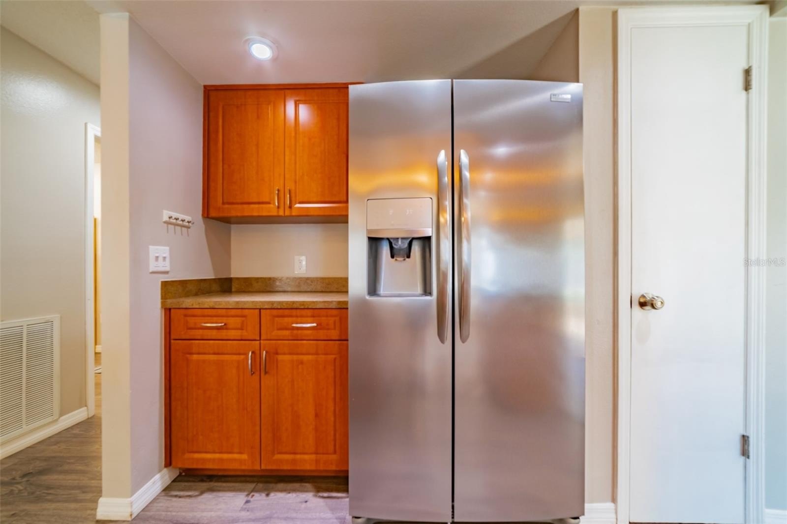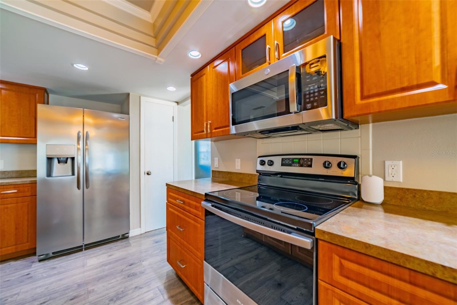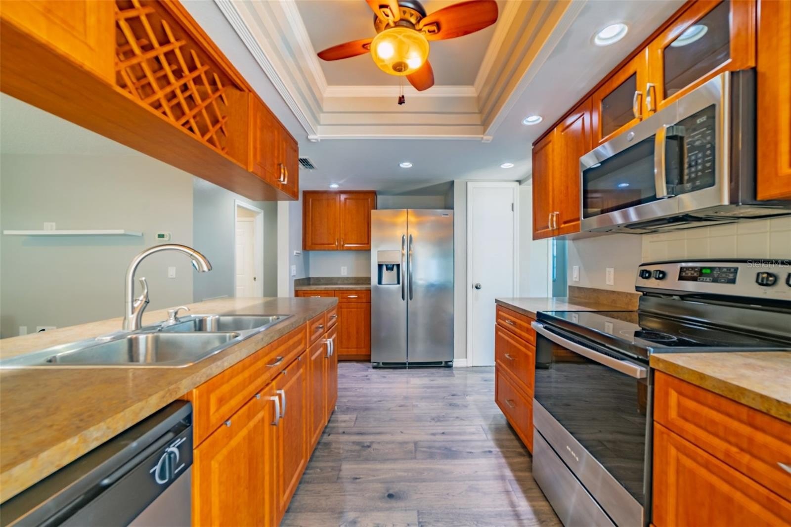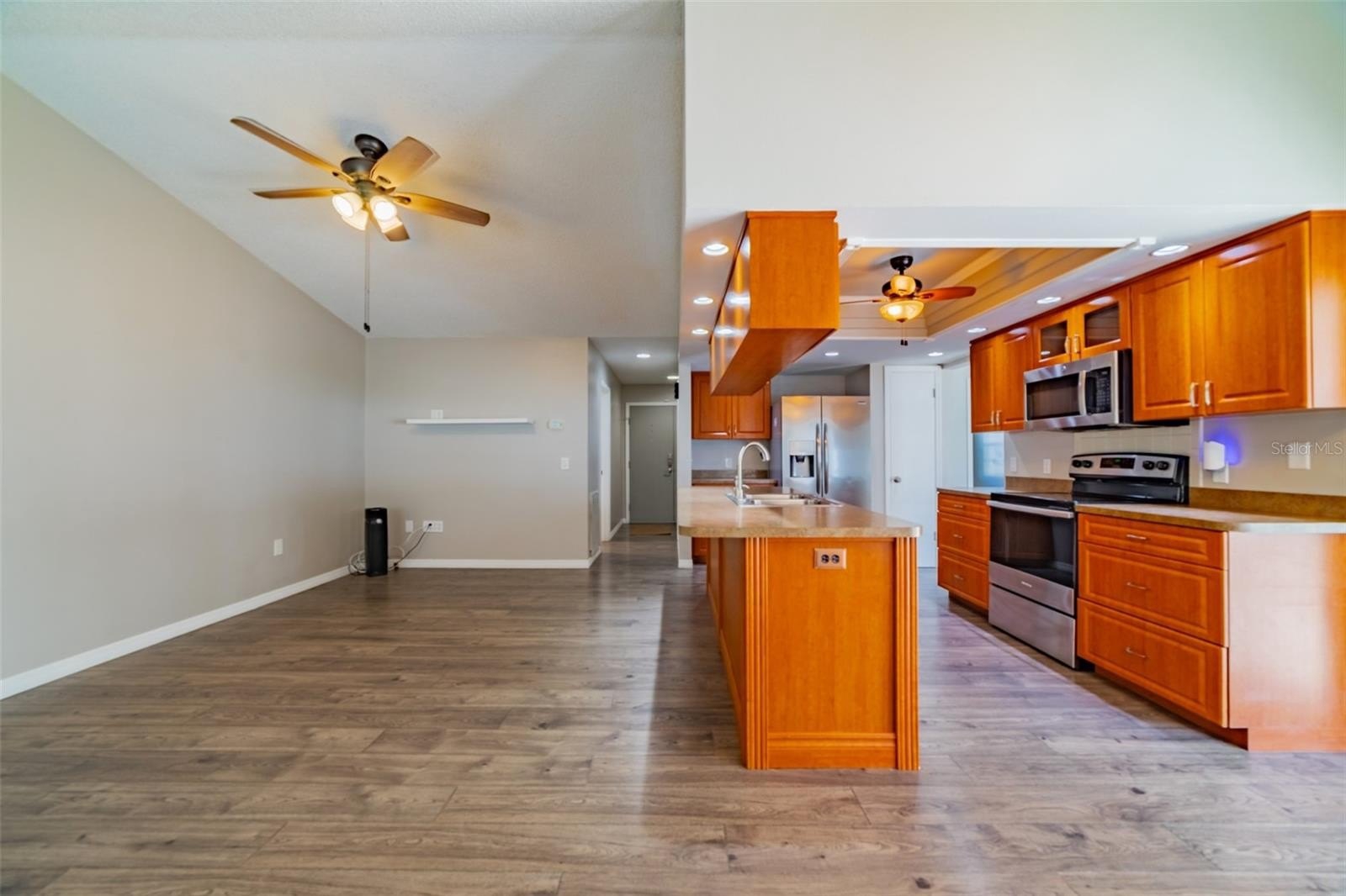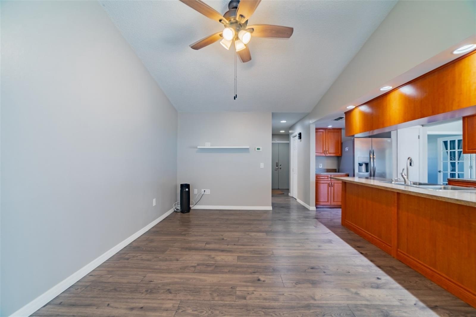 Charming and beautifully cared for three-bedroom, two-bath home situated in the heart of Spring Hill. This home features fresh paint and luxurious vinyl flooring throughout. The kitchen boasts a brand new stove, wooden cabinets, an island with a sink, and ample space for bar stools. Additionally, there is a closet pantry and a coffee bar area. This open-concept kitchen provides space for a cozy dining area and a family room. Adjacent to the kitchen is a flexible space that can serve as an extra dining area, an office, or a playroom, complete with sliding glass doors that open to an enclosed patio, which leads to a beautifully maintained oversized backyard featuring a newer PVC privacy fence. An outdoor patio includes a path that guides you to a fire pit area, all constructed with pavers, perfect for enjoying quiet evenings under the stars. The fence is adorned with mature plants including 2 blueberry bushes that produce fruit enhancing the view. All three bedrooms are generously sized, complete with closets, while the master suite includes its own spacious bathroom. Both bathrooms have been updated. On the way to the two-car garage, you will find the laundry room, which includes closet storage, a large laundry sink, and a washer and dryer, with extra space for shelving and more. This lovely home is conveniently located off Spring Hill Drive and is just a short distance from shopping, medical facilities, restaurants, a waterfront park, and the expressway leading to Tampa.