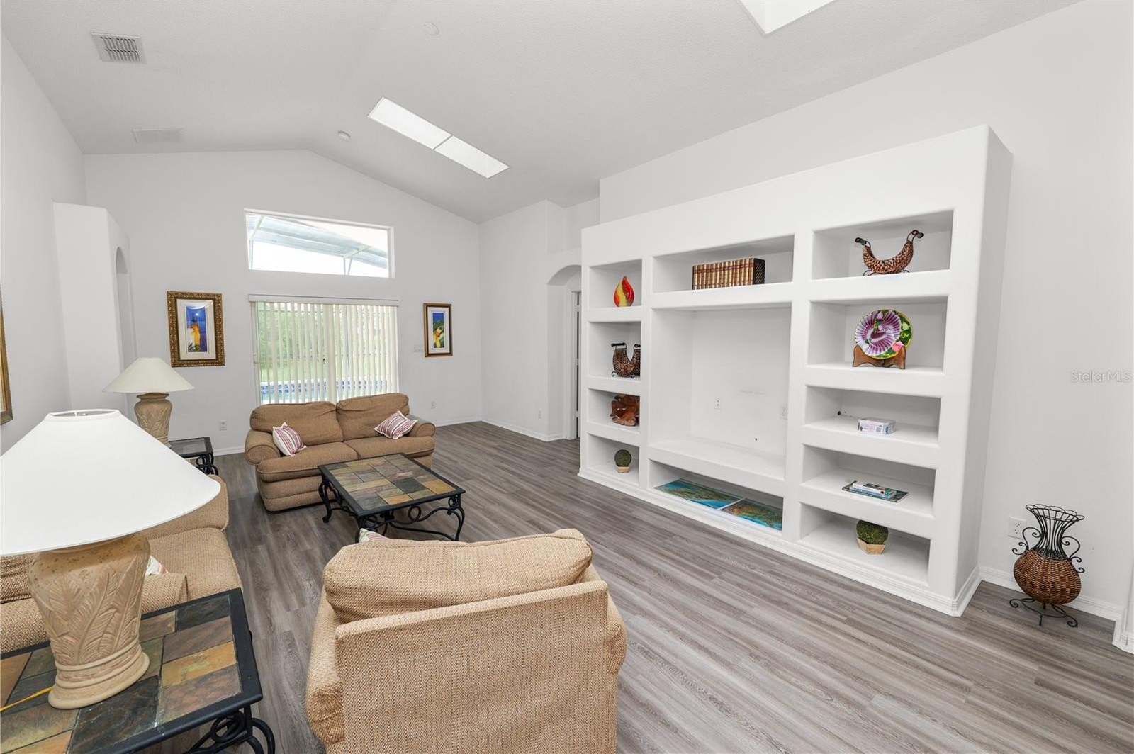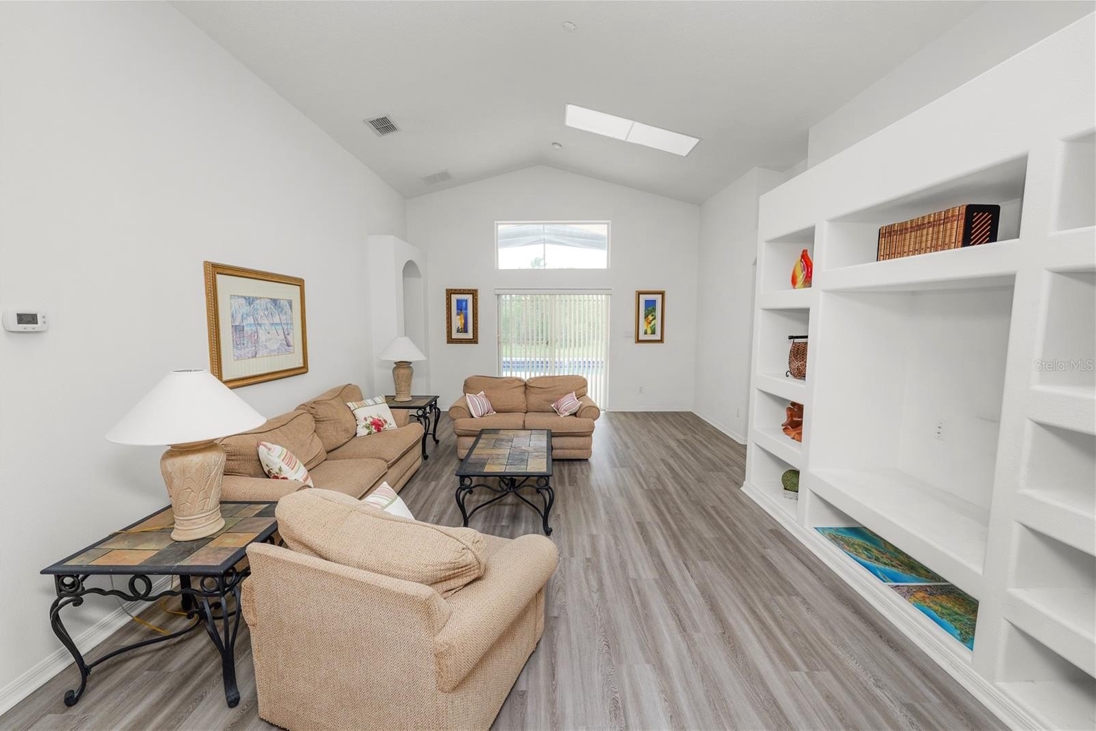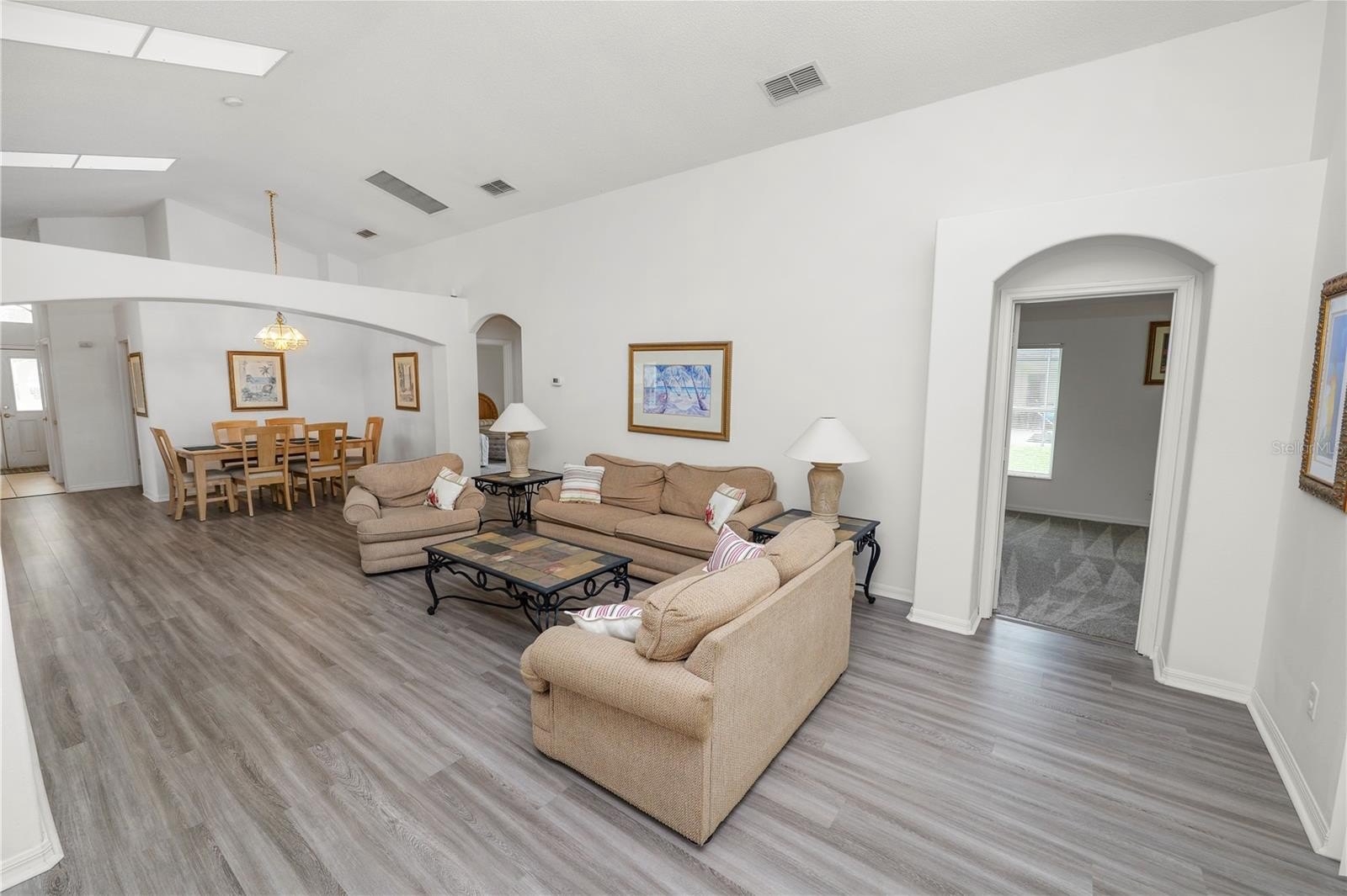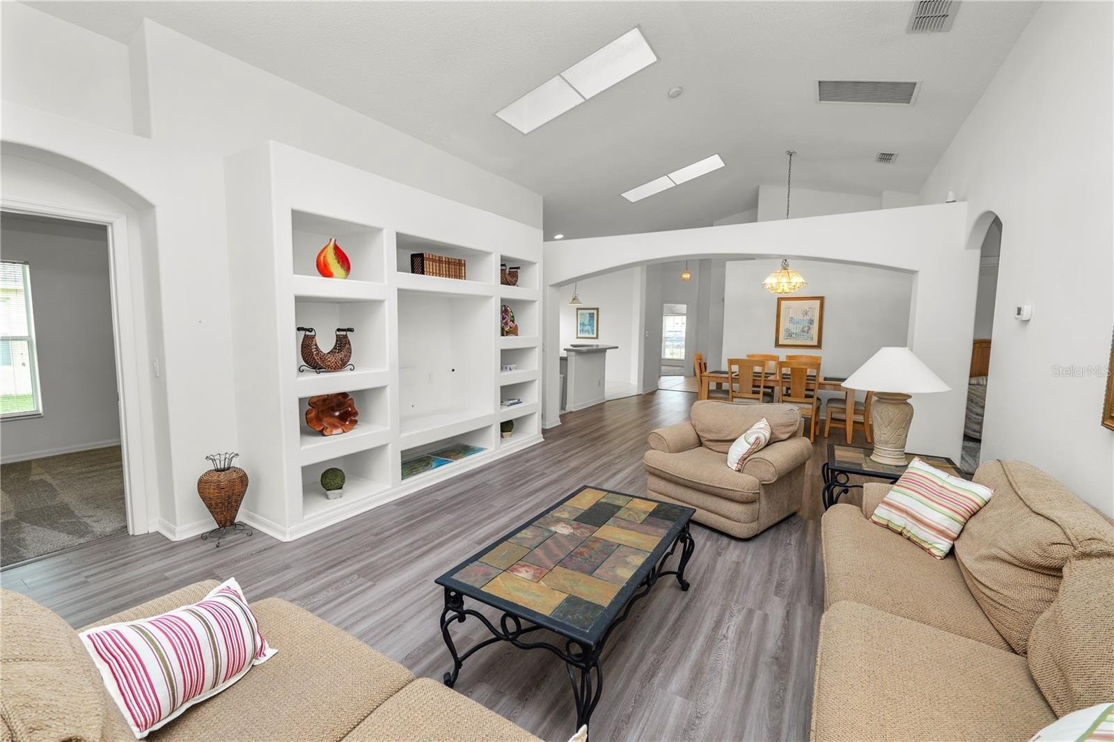 The home features new carpet and LVT flooring in 2024. Step inside to vaulted ceilings with a thoughtfully designed layout offering an effortless flow between the living, dining, and kitchen areas while natural light filters in through skylights, adding warmth and charm throughout the home.