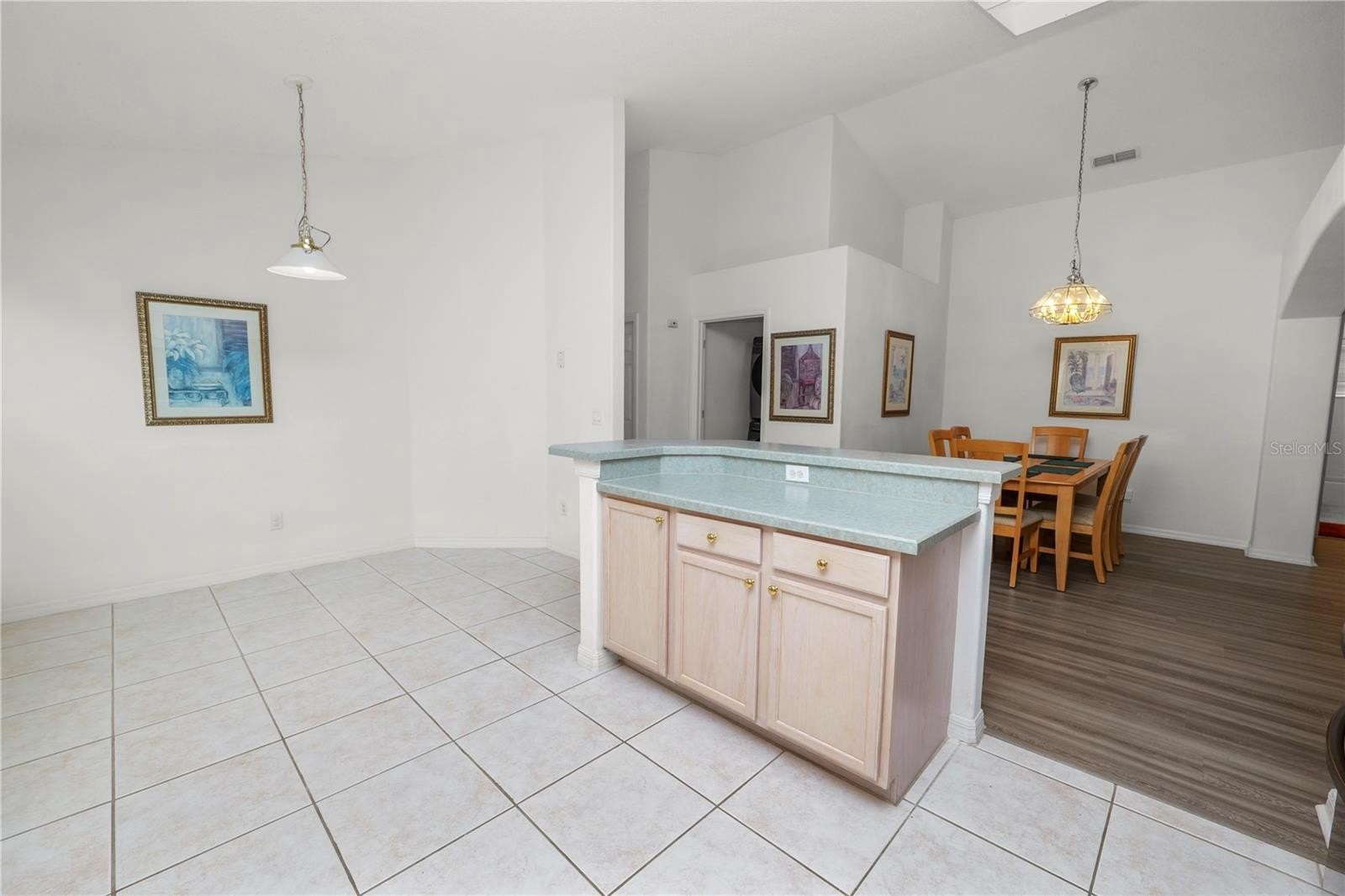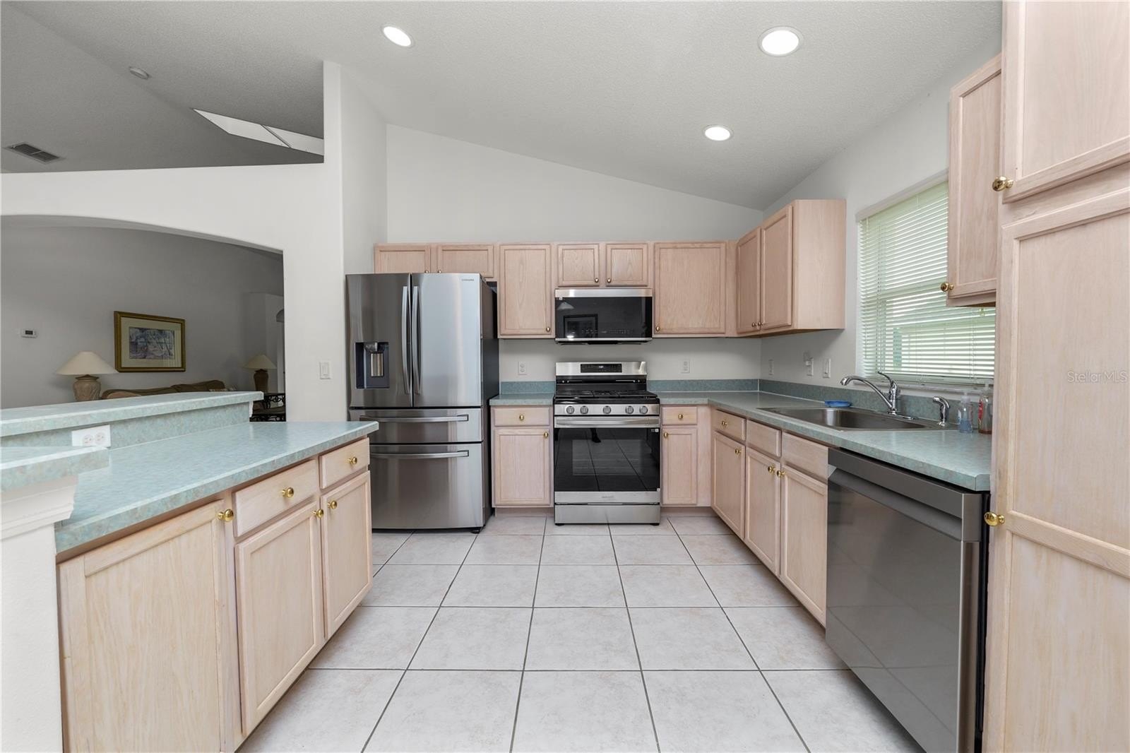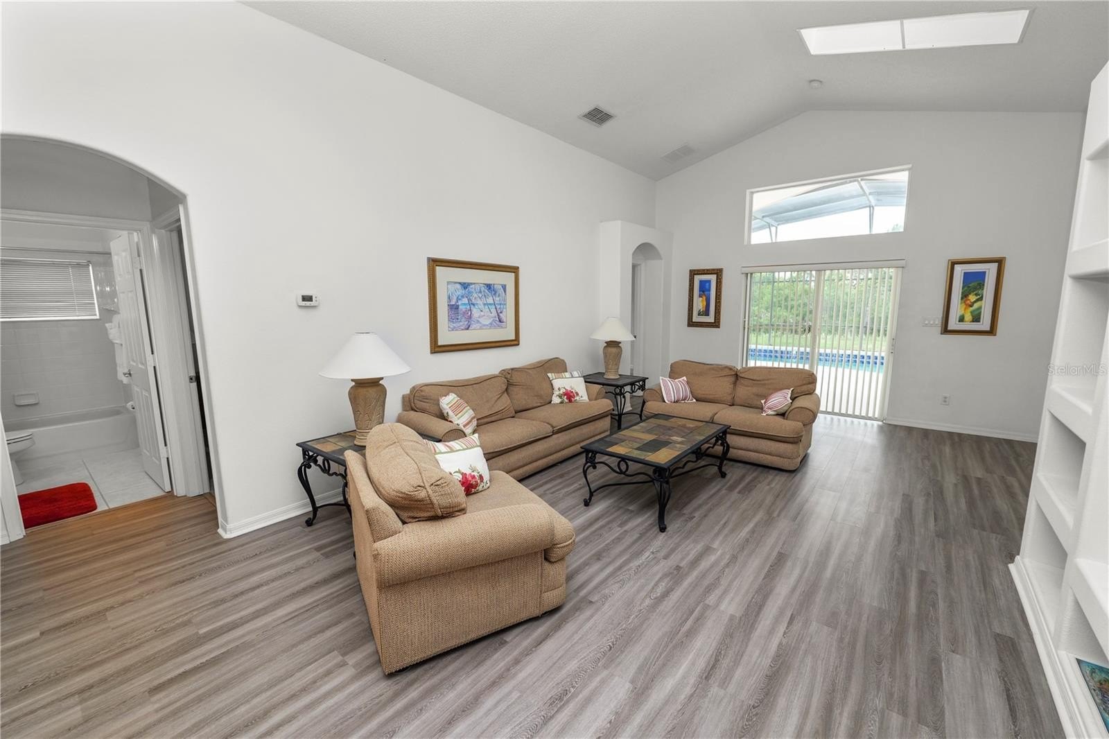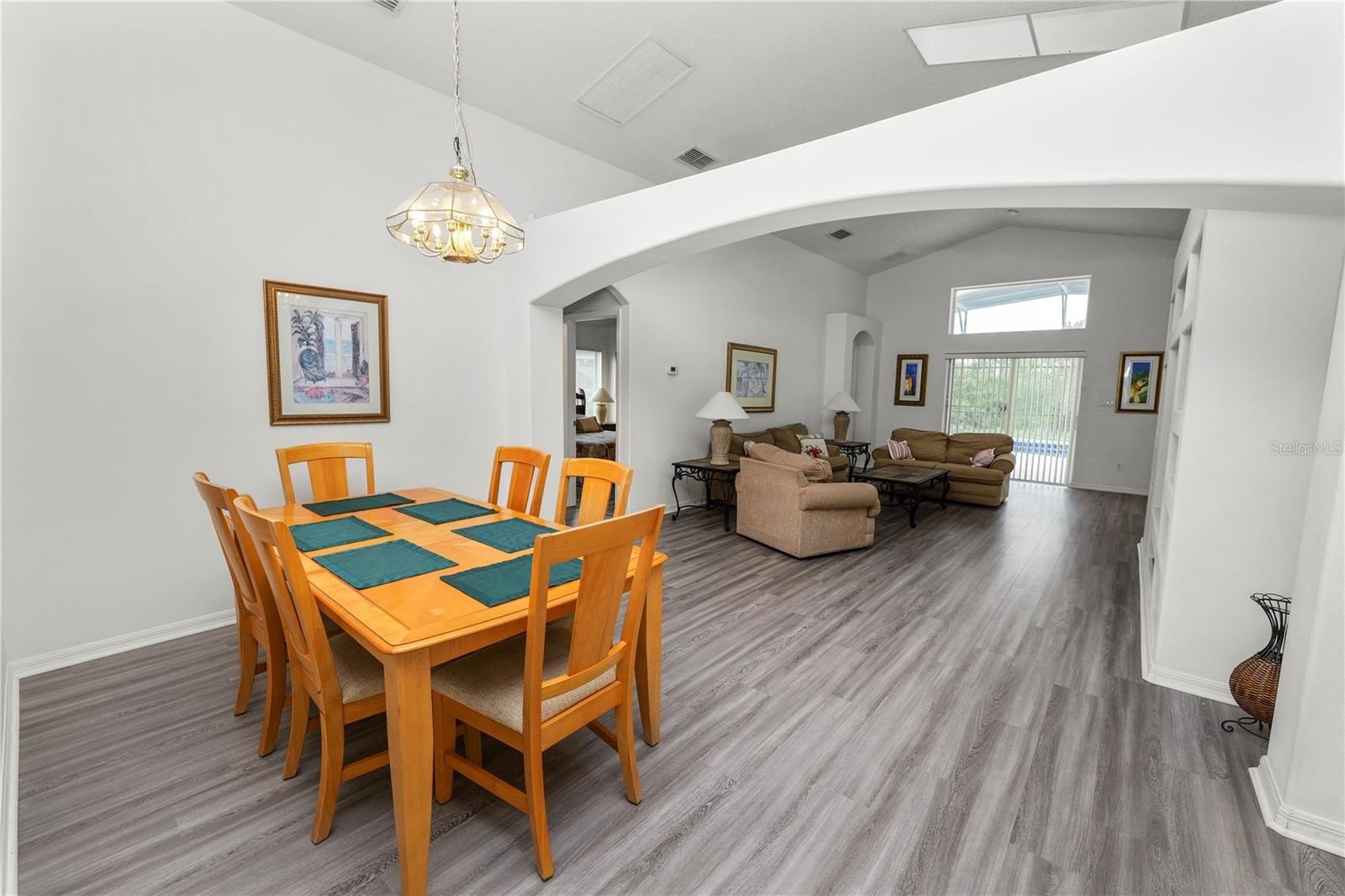The home features new carpet and LVT flooring in 2024. Step inside to vaulted ceilings with a thoughtfully designed layout offering an effortless flow between the living, dining, and kitchen areas while natural light filters in through skylights, adding warmth and charm throughout the home.