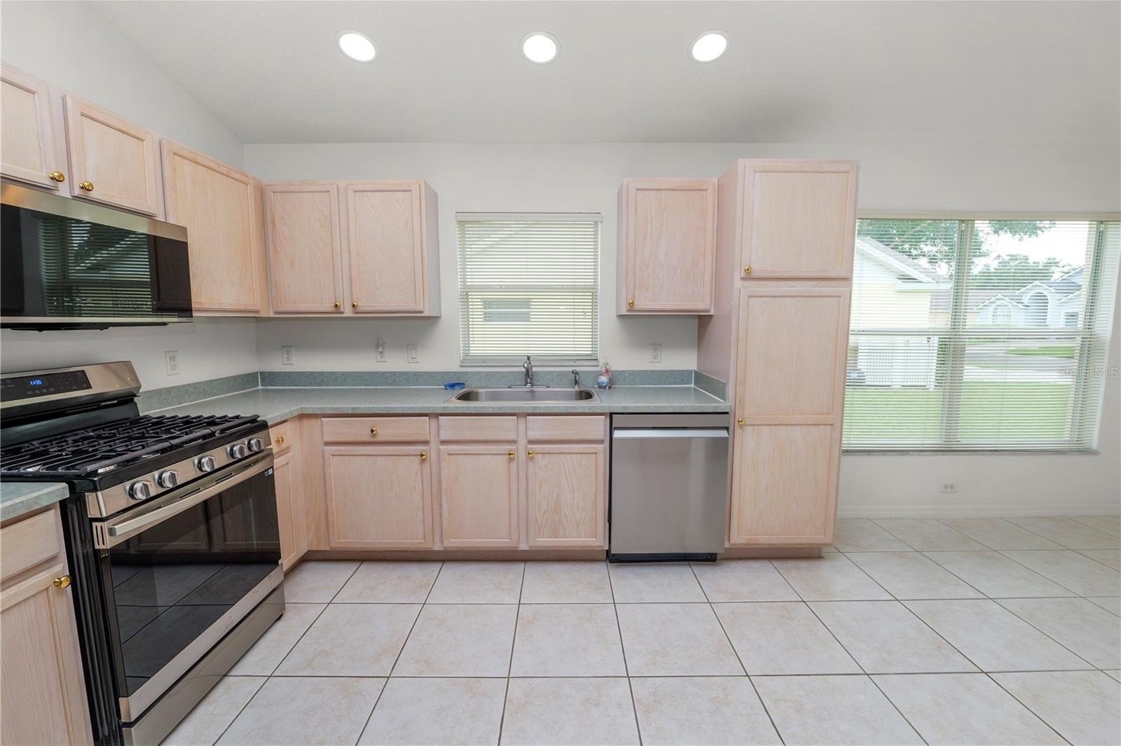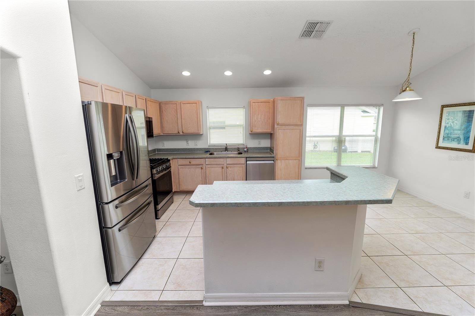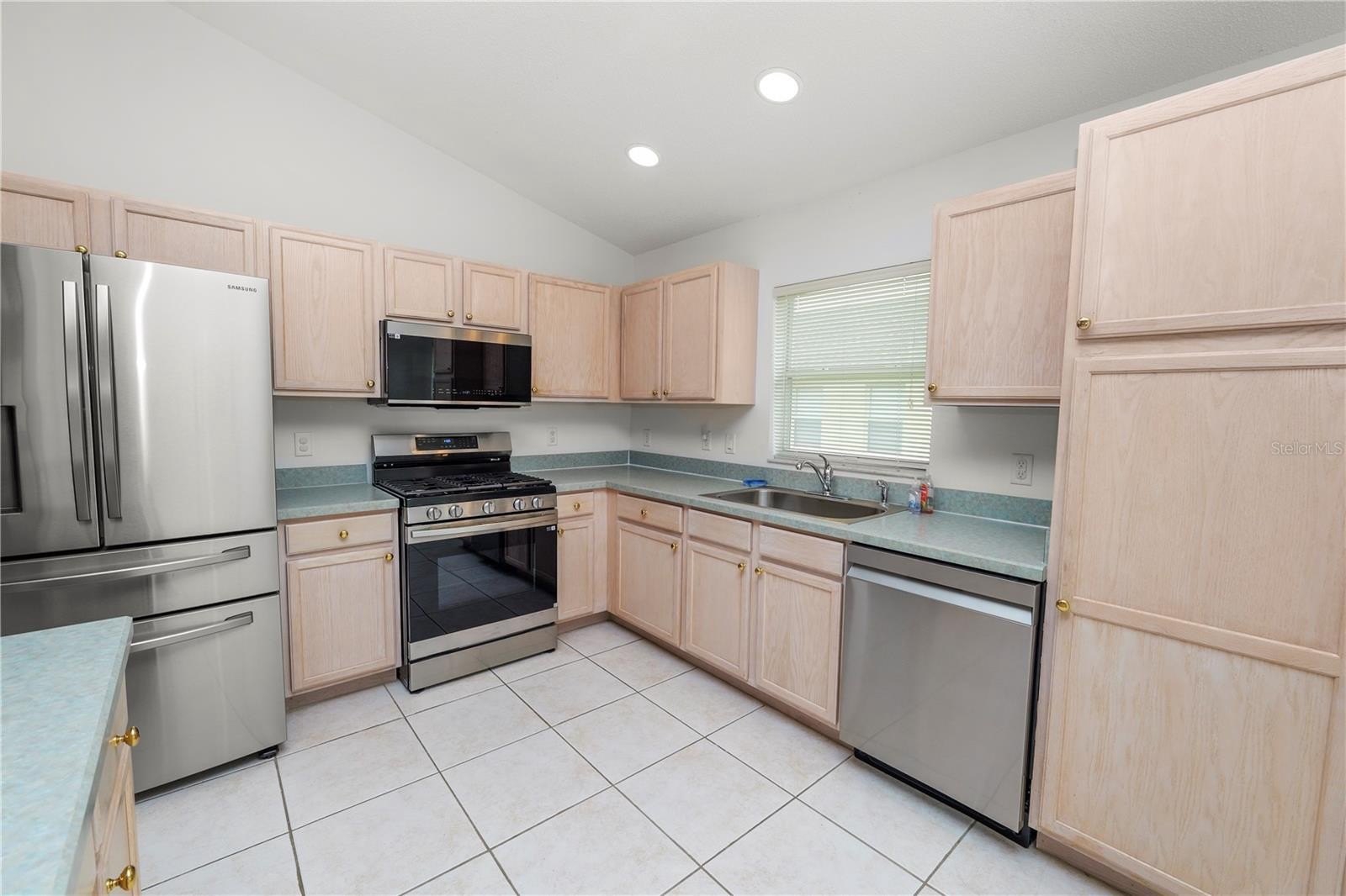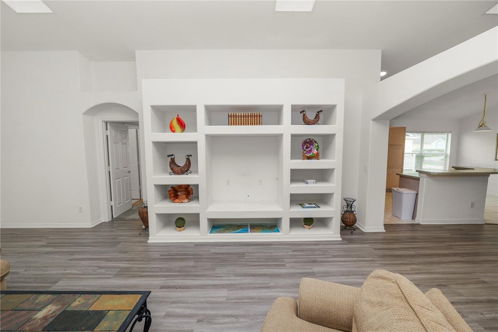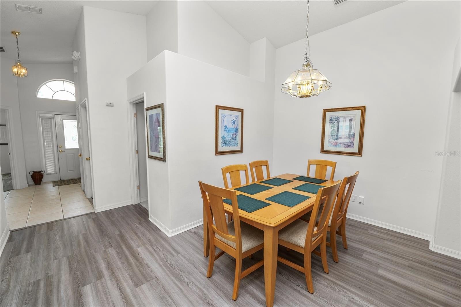 The home features new carpet and LVT flooring in 2024. Step inside to vaulted ceilings with a thoughtfully designed layout offering an effortless flow between the living, dining, and kitchen areas while natural light filters in through skylights, adding warmth and charm throughout the home.