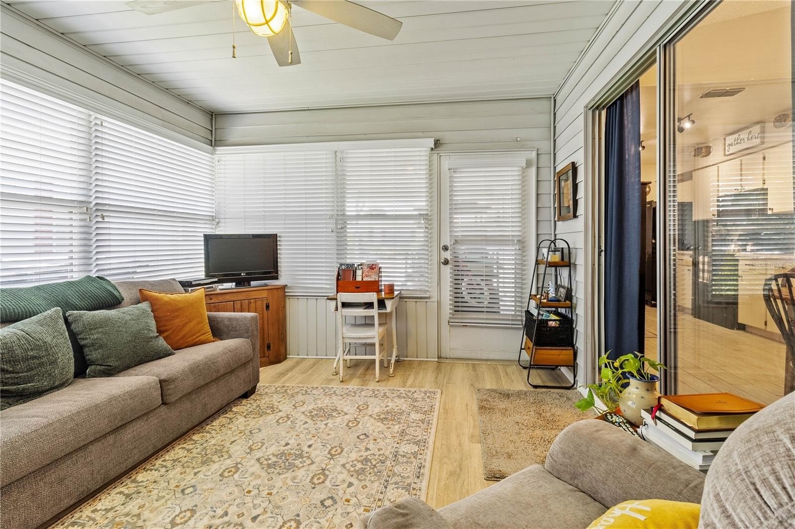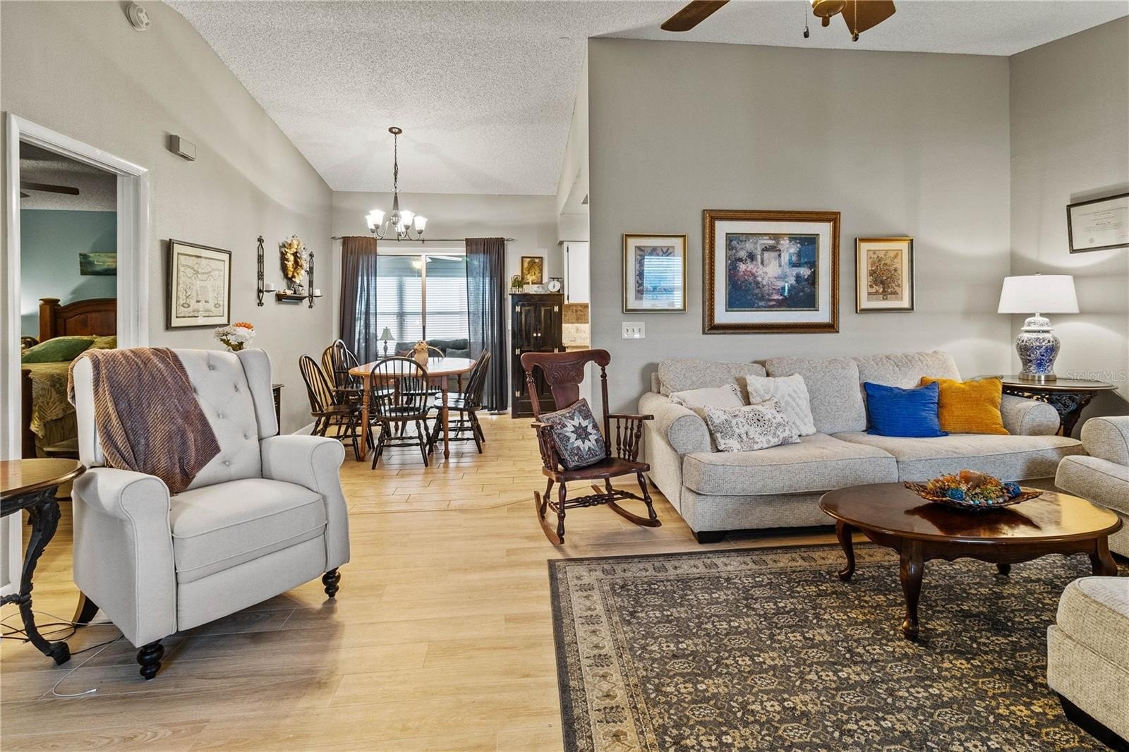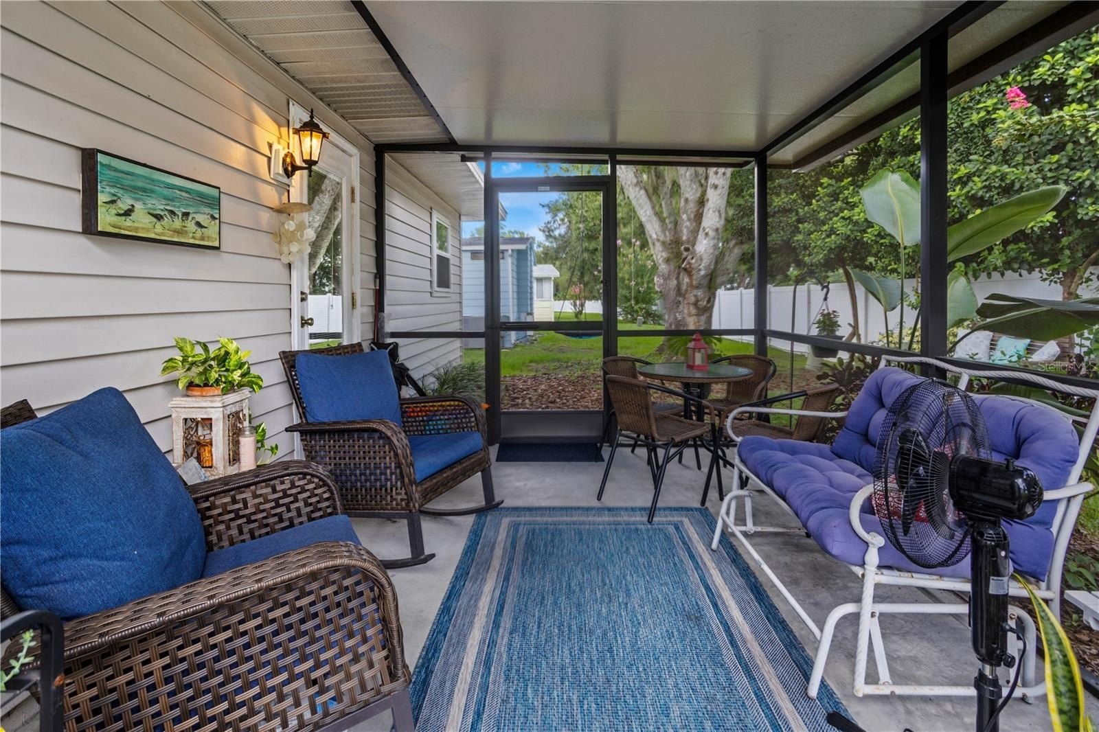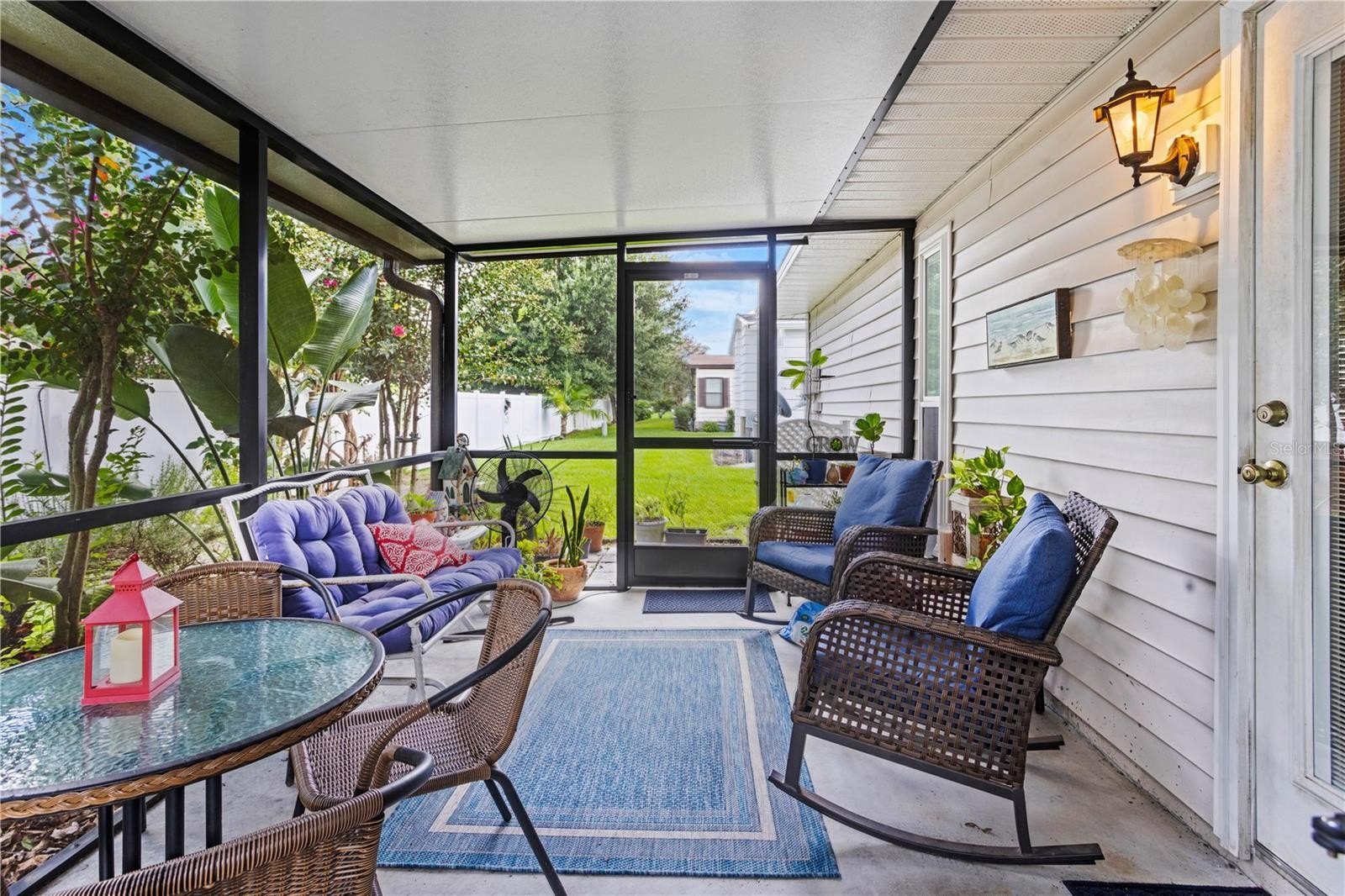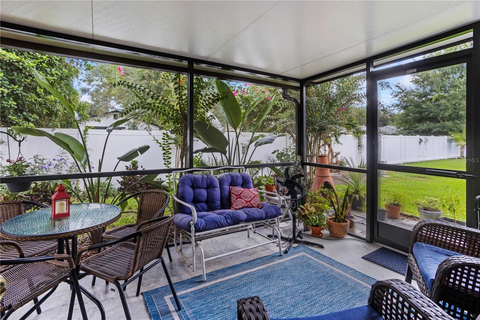 Extremely well-kept Greenbrier model located on an exterior lot in the desirable 55+ gated community of the Colonnades. This 2-bedroom, 2-bathroom home features updated tile in the kitchen and dining areas, along with vinyl plank flooring in the living room and bonus space. The roof, windows, and A/C have all been replaced within the past five years. Bright and spacious throughout, the home includes a private lanai off the primary bedroom that overlooks a lush, landscaped backyard.