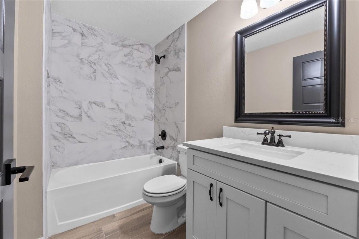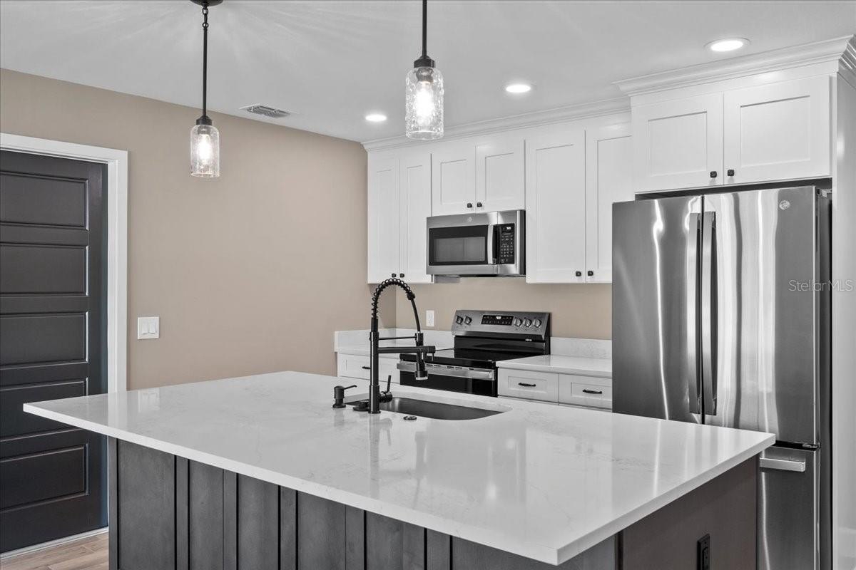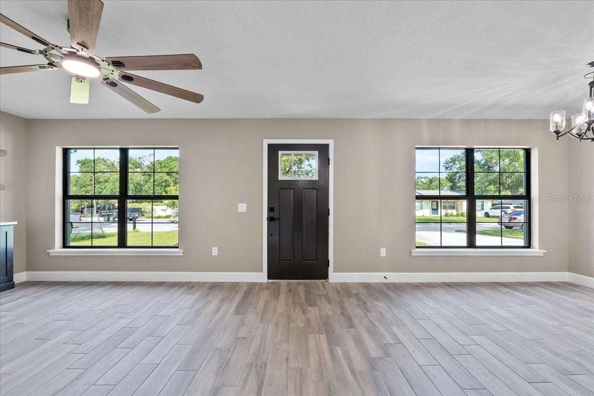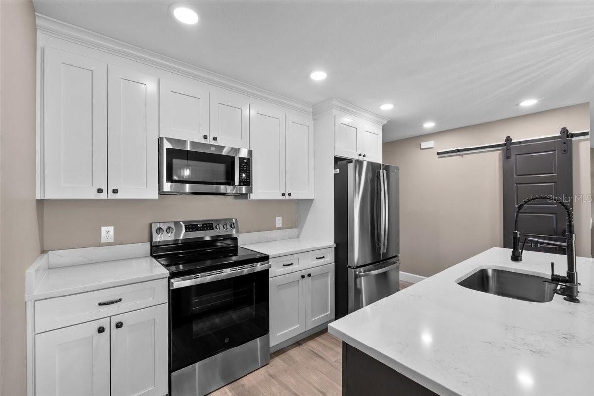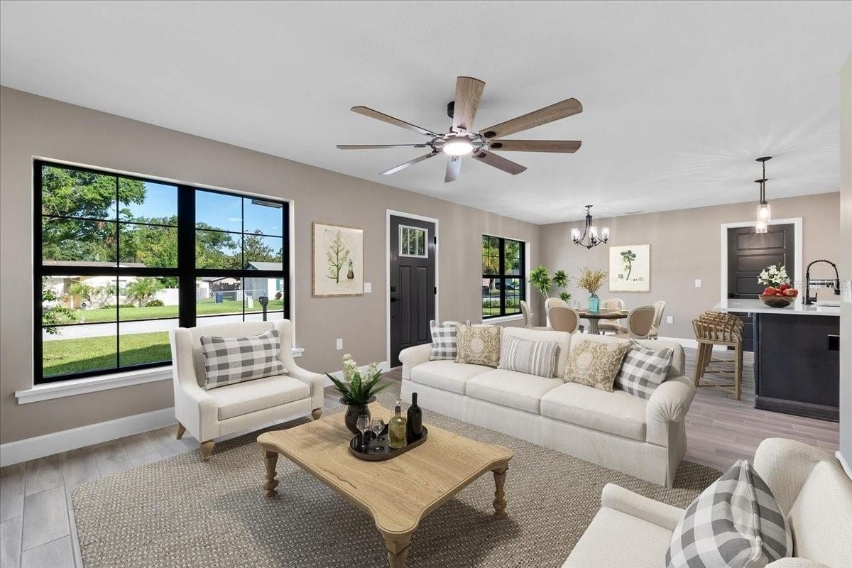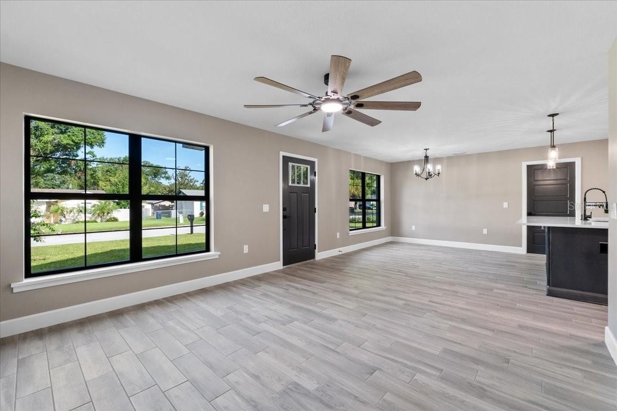 One or more photo(s) has been virtually staged. **Stunning New Construction Home in Auburndale built by Integrity Homes and Construction, Inc.!** Whether you're a First-Time Home Buyer, Retiree or just downsizing this is the home for you! This beautifully designed three-bedroom, two-bath gem offers over 1,300+ square feet of luxurious living space, and it has never been lived in—just completed and ready for you to make it your own. Step inside to discover an inviting open floor plan adorned with elegant wood-look ceramic tile flooring throughout. The spacious living room features a cozy electric fireplace, complemented by stylish built-ins, creating the perfect ambiance for relaxation and entertaining. The heart of this home is the stunning kitchen, boasting classic white shaker cabinets with crown molding, gleaming granite countertops, and brand new stainless steel GE appliances. A charming barn door pantry adds a touch of farmhouse flair, making this kitchen both functional and aesthetically pleasing. Retreat to the large master bedroom, complete with an en suite bathroom that exudes luxury. Enjoy the spa-like experience with beehive tile flooring in the shower, rain shower head, floor-to-ceiling ceramic tile in shower, dual sinks, and a nice walk-in closet. The guest bath also boasts granite counter tops and floor to ceiling tile in the tub/shower. Additional highlights include an inside laundry room for added convenience, ceiling fans in all rooms for comfort, and the bonus of no backyard neighbors, providing a sense of privacy and tranquility. Close to the Polk County Parkway, Schools, Shopping and Restaurants. Don't miss this opportunity to own a brand-new home in a desirable location. Schedule your showing today and experience the perfect blend of modern living and farmhouse charm!