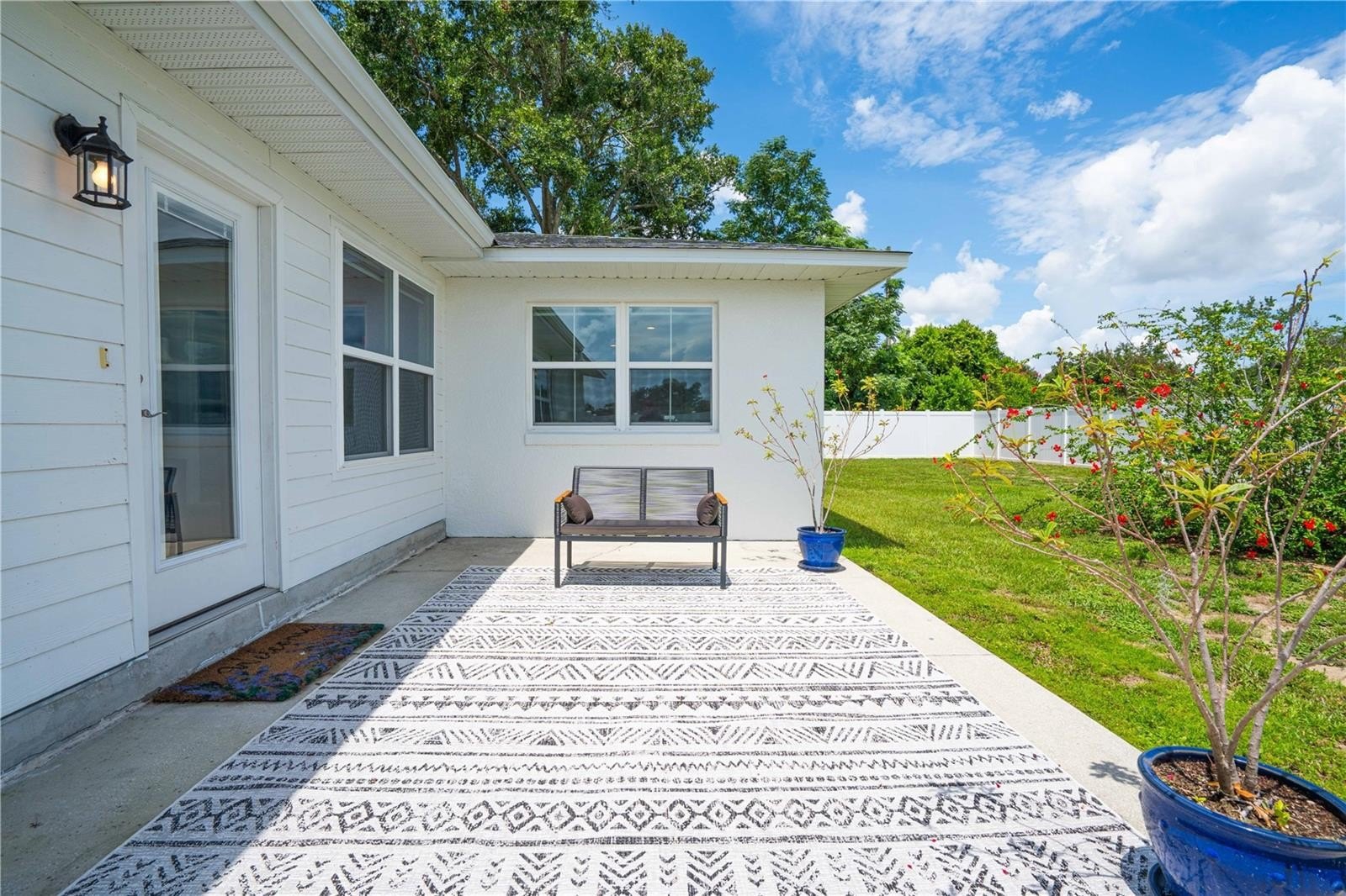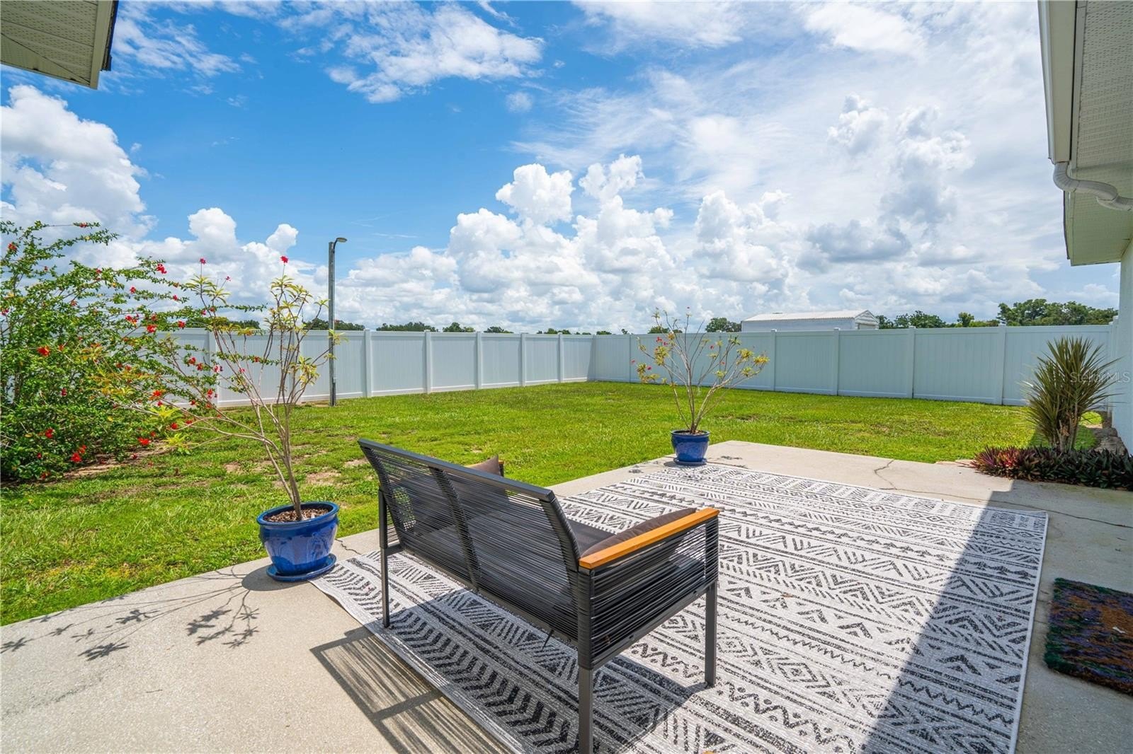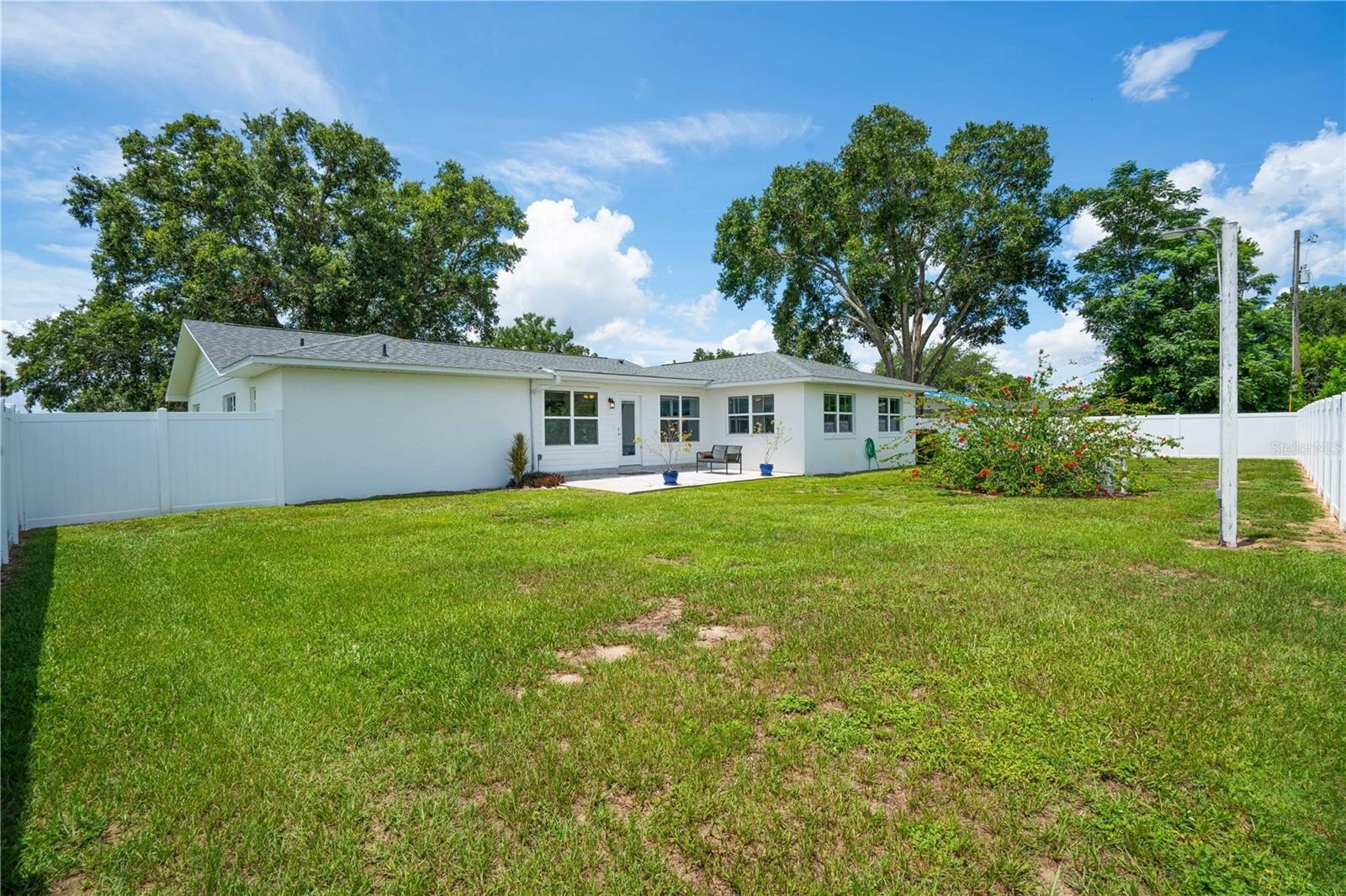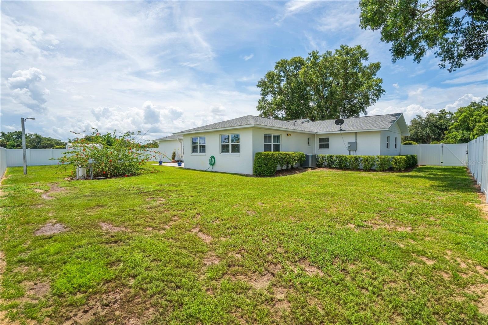 white vinyl fully fenced in backyard with gate (2024), RainBird irrigation system