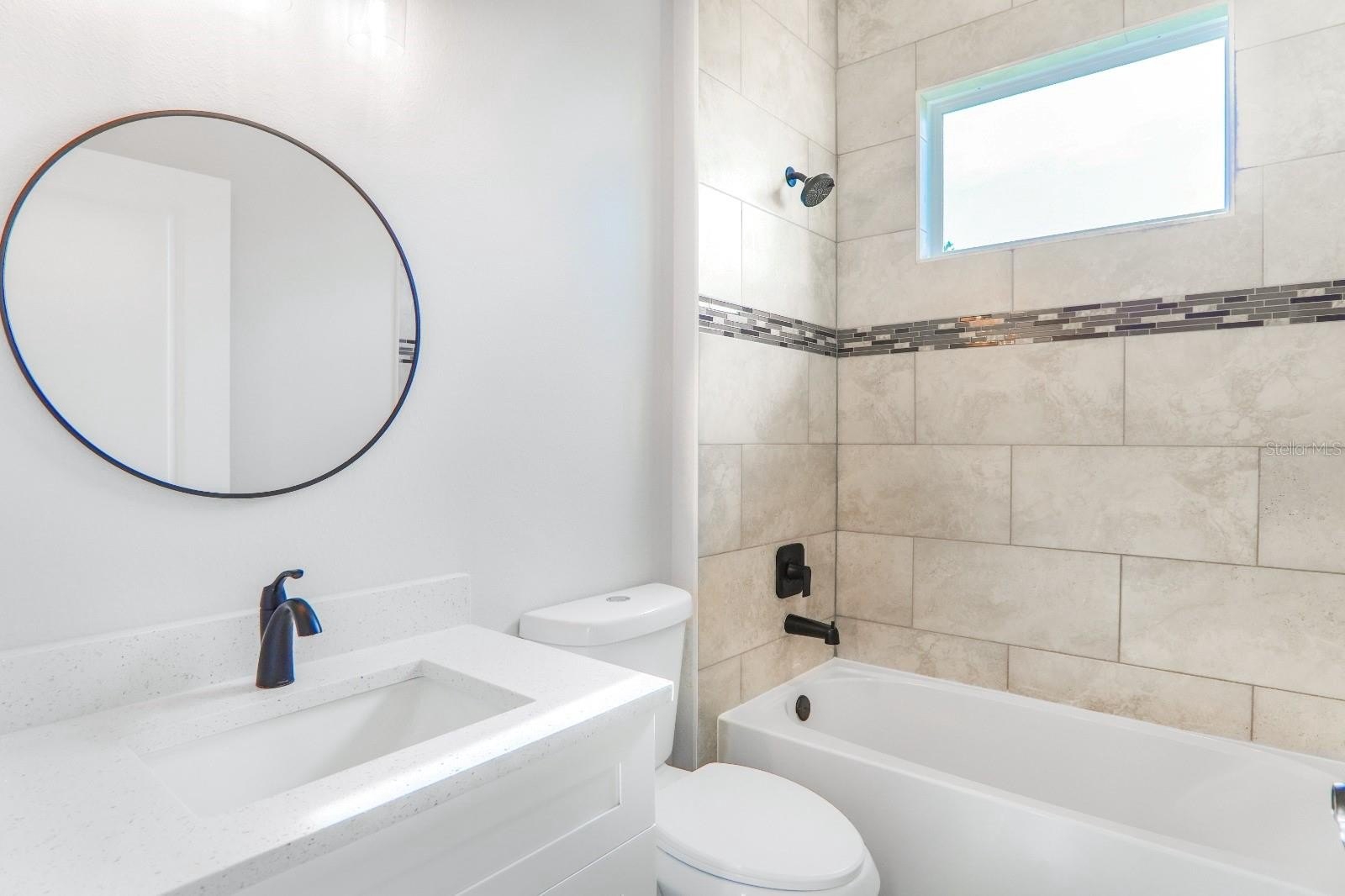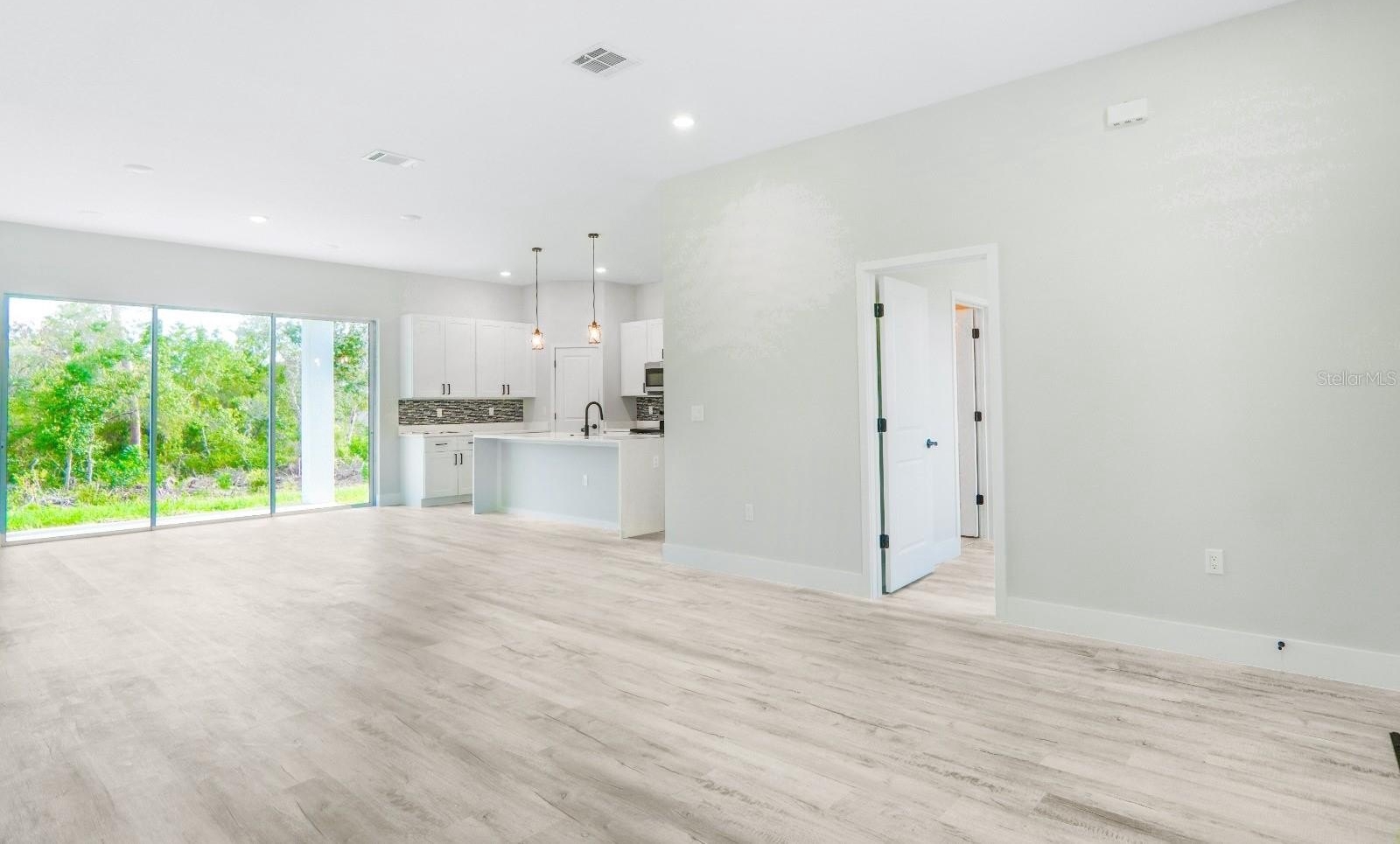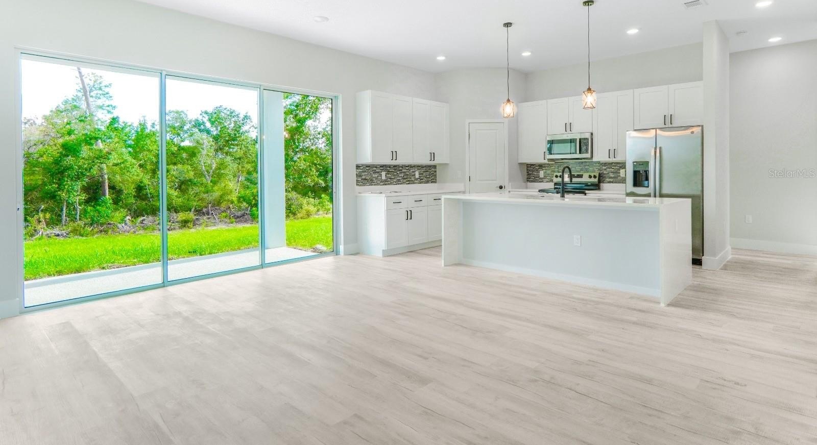 The gourmet kitchen features a waterfall quartz island, 42” shaker cabinets, a stylish backsplash, and flows seamlessly into the living area, bathed in natural light thanks to a three-panel sliding glass door that opens to a covered lanai — the perfect space to unwind or entertain.