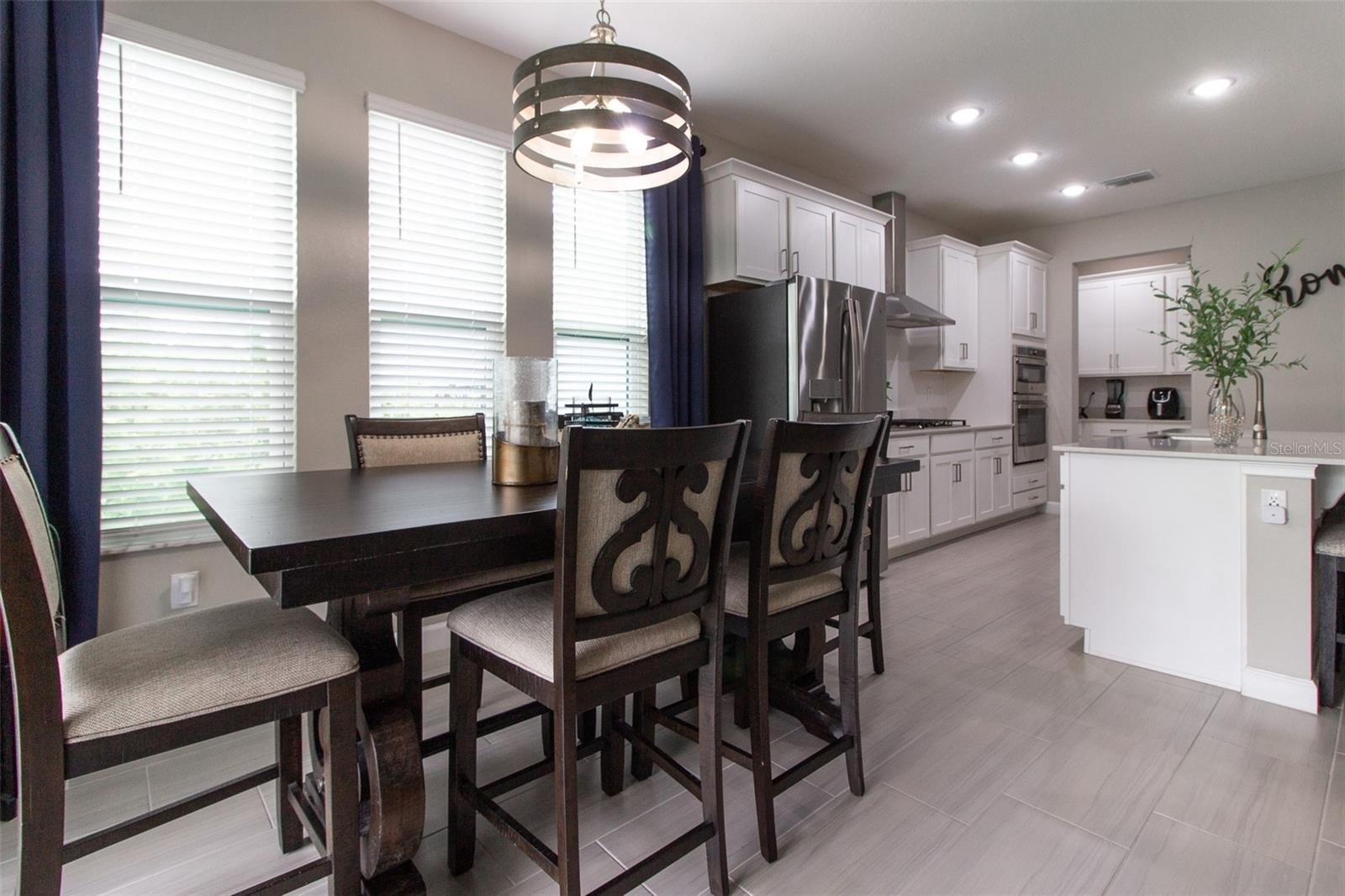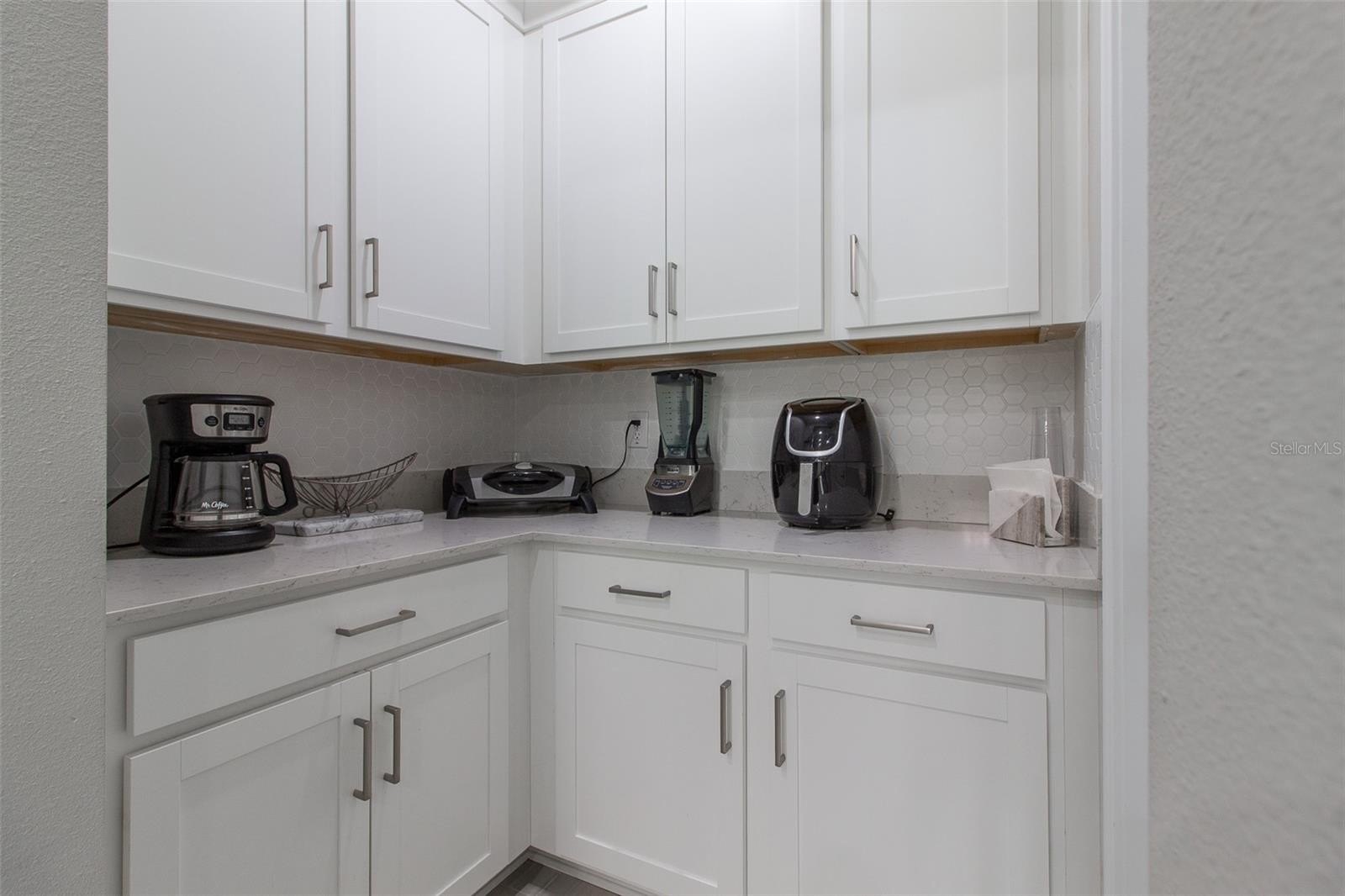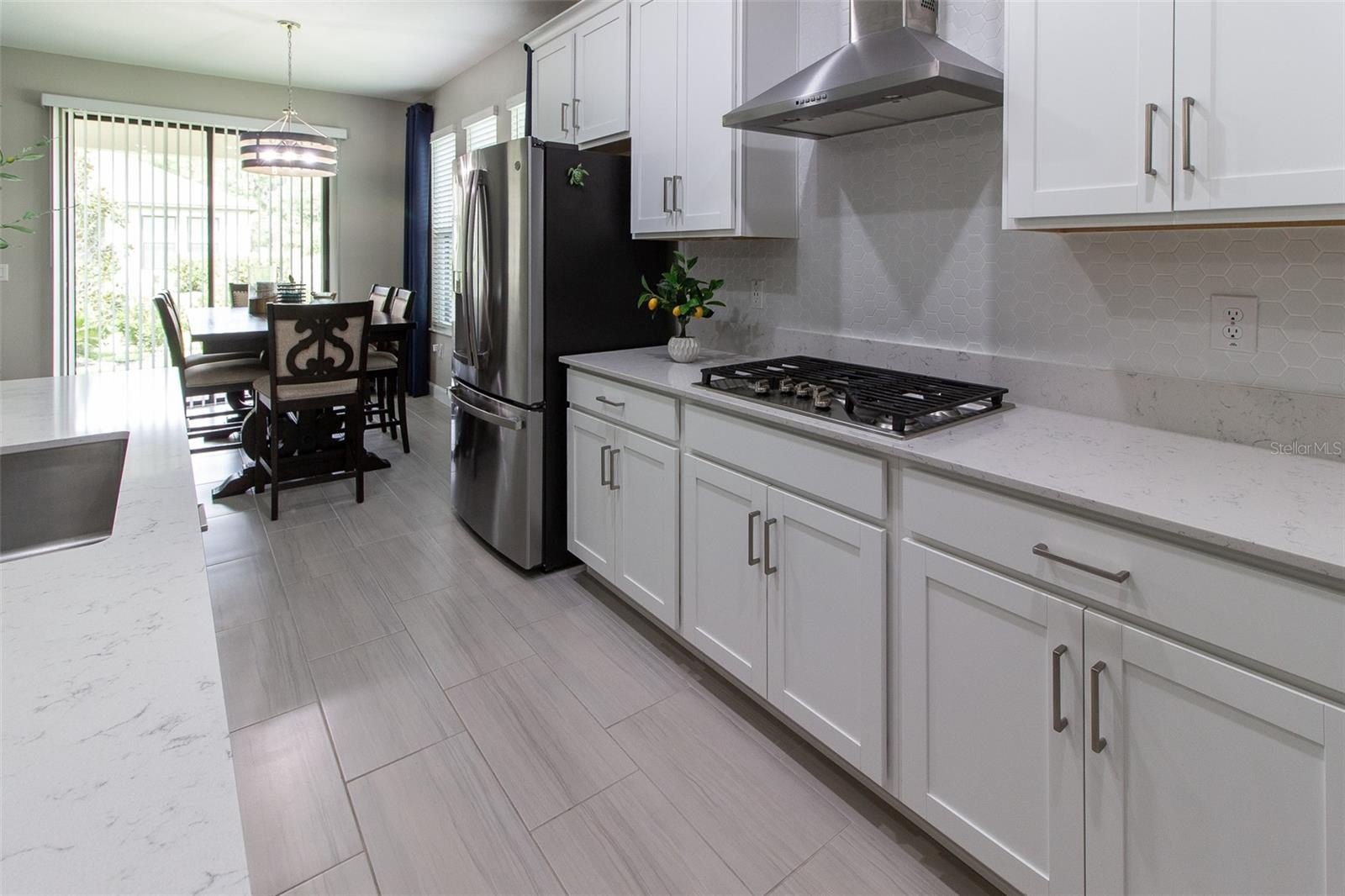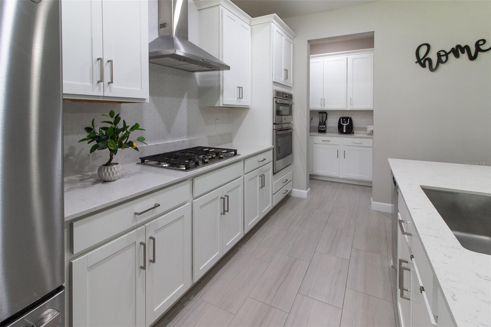 This 4-bedroom, 3-bath home offers a bright and open layout with tall ceilings and a wide foyer with light tile flooring. The private entry features a tall front door that opens to a well-designed floorplan. The living room is open and comfortable with a tray ceiling and upgraded ceiling fans. Outside, a covered paved patio looks out over a beautifully maintained yard with mature trees and landscaping. A fire pit creates a great space for relaxing or entertaining, and a Dyna-Glo stainless gas grill with side griddle and canopy is included. Two bedrooms share a full bath with a double-sink vanity and a separate room for the tub, shower, and toilet. The third bedroom has its own bathroom with a large walk-in shower featuring classic subway tile and a glass door. The primary suite easily fits a king-size bed and additional furniture, and includes a walk-in closet and a private bath with double sinks, a wide walk-in shower with a frosted window, and a private water closet. The kitchen is the centerpiece of the home, with quartz countertops, a large island that seats four, and GE appliances including a 5-burner gas range with stainless hood, wall oven, built-in microwave, and large refrigerator with ice and water dispensers. A deep farmers sink, beverage counter with wine cooler, and hexagon tile backsplash add style and function. The butler’s pantry offers generous cabinetry and counter space, and there’s an enclosed pantry for extra storage.