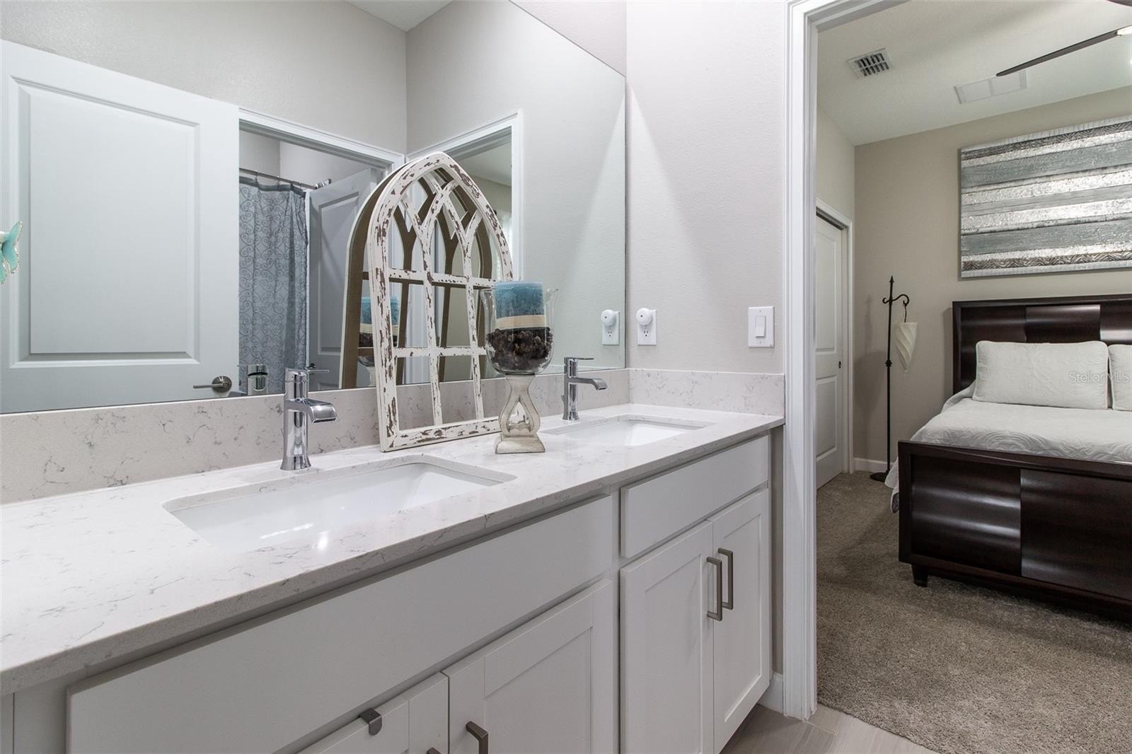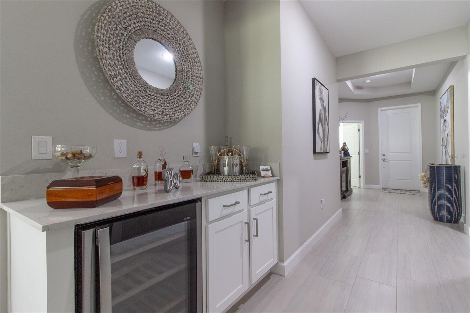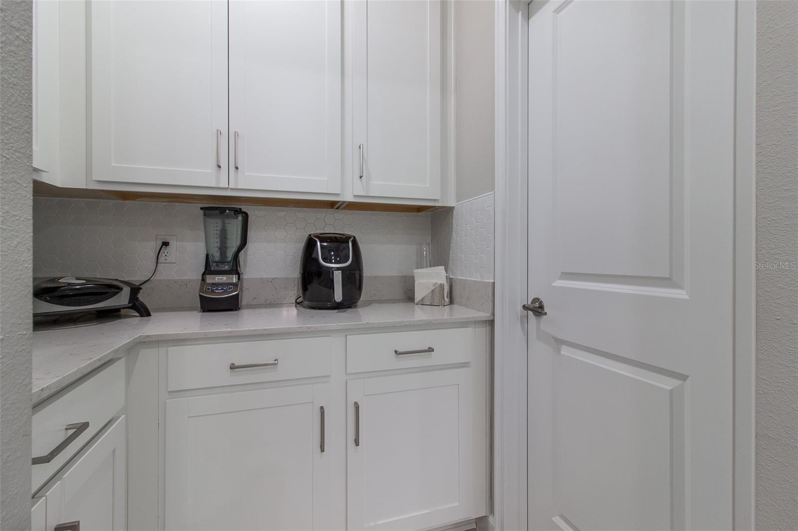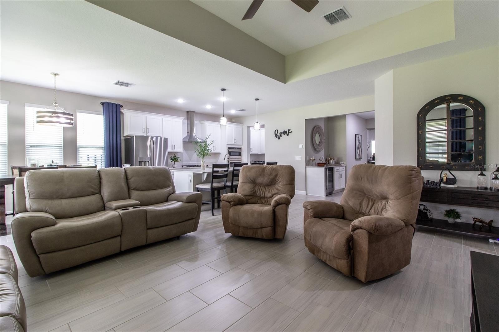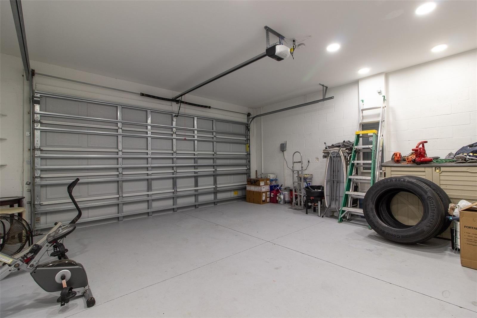 This 4-bedroom, 3-bath home offers a bright and open layout with tall ceilings and a wide foyer with light tile flooring. The private entry features a tall front door that opens to a well-designed floorplan. The living room is open and comfortable with a tray ceiling and upgraded ceiling fans. Outside, a covered paved patio looks out over a beautifully maintained yard with mature trees and landscaping. A fire pit creates a great space for relaxing or entertaining, and a Dyna-Glo stainless gas grill with side griddle and canopy is included. Two bedrooms share a full bath with a double-sink vanity and a separate room for the tub, shower, and toilet. The third bedroom has its own bathroom with a large walk-in shower featuring classic subway tile and a glass door. The primary suite easily fits a king-size bed and additional furniture, and includes a walk-in closet and a private bath with double sinks, a wide walk-in shower with a frosted window, and a private water closet. The kitchen is the centerpiece of the home, with quartz countertops, a large island that seats four, and GE appliances including a 5-burner gas range with stainless hood, wall oven, built-in microwave, and large refrigerator with ice and water dispensers. A deep farmers sink, beverage counter with wine cooler, and hexagon tile backsplash add style and function. The butler’s pantry offers generous cabinetry and counter space, and there’s an enclosed pantry for extra storage.