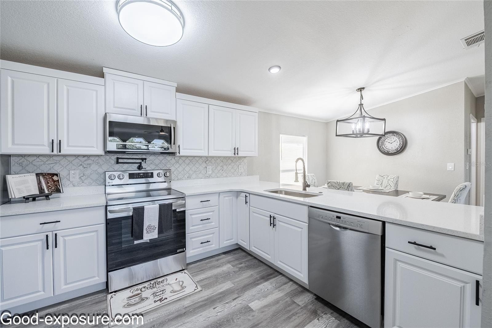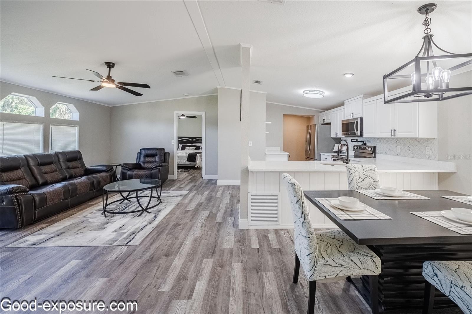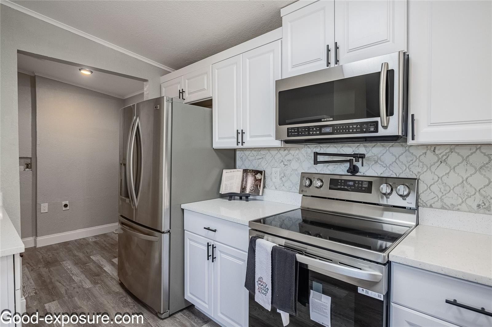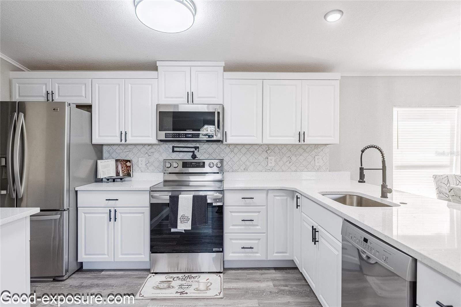 **ALERT**PRICE IMPROVEMENT**This new listing offers USDA, FHA, VA, Conventional, and Cash! Welcome to 7259 Dove Meadow Trail – A Fully Renovated Retreat on a Spacious, Private Lot! Nestled on a large lot in popular North Lakeland. This beautifully updated home offers the perfect blend of modern style, serene outdoor space, and everyday comfort. Interior Highlights: Step into an open-concept layout with new luxury vinyl plank flooring throughout. The designer kitchen is a chef’s dream – featuring new white cabinets, sleek black hardware, pot filler, quartz countertops, a nice modern backsplash, and new stainless steel appliances, including, range, dishwasher, a built-in microwave and large fridge. Entertain with ease from the eat-in dining area and bar-style countertop overlooking the kitchen/dining room. Relax in a cozy yet sophisticated living room, complete with a stylish ceiling fan and large windows letting in natural light. The primary suite offers peaceful privacy with a spacious walk-in closet and a spa-like bathroom featuring a walk-in tiled shower, double vanity, matte black fixtures, and updated lighting. Exterior & Land is situated on a private, almost 1 acre lot, surrounded by beautiful mature trees, open grassy areas, and partial wooded views — ideal for nature lovers, gardening, or adding future amenities. Enjoy morning coffee or evening sunsets on the charming front porch deck with bold black railings, giving this home modern curb appeal. Ample space for expansion, RV/boat parking, or even a workshop. Located in North Lakeland, this property offers easy commutes via nearbyI-4 to both Tampa and Orlando. Shopping & Groceries Walmart, Publix, Winn-Dixie, and Lakeland Square Mall (approx. 10-15 min drive). Dining Access to restaurants ranging from local diners to national chains along US-98. Schools Zoned for well-rated Polk County public schools; nearby private school options as well. The home has several recreation options such as Lake Gibson, parks, walking trails, and golf courses (e.g. Sandpiper Golf & Country Club). Quiet Community Low traffic area, ideal for peaceful living while still close to town. No HOA, giving you more freedom and flexibility. This move-in-ready home offers the best of both worlds – a peaceful, oversized lot with all the modern upgrades inside. Whether you’re a first-time buyer, downsizing, or looking for land with flexibility, 7259 Dove Meadow Trail is a must-see gem! Schedule your private showing today – this rare find won’t last long!