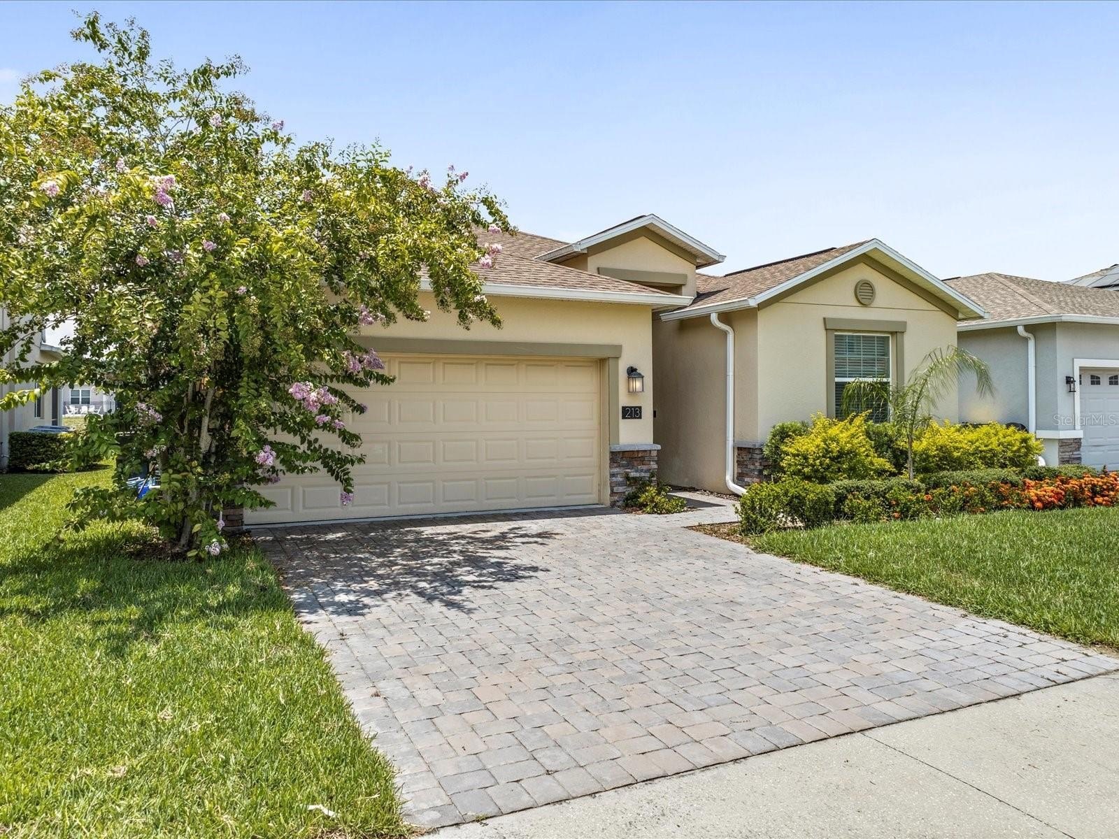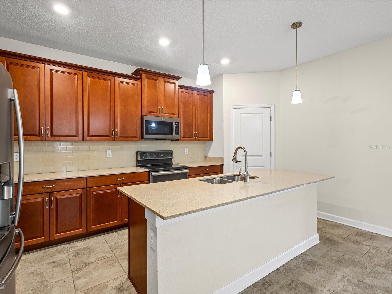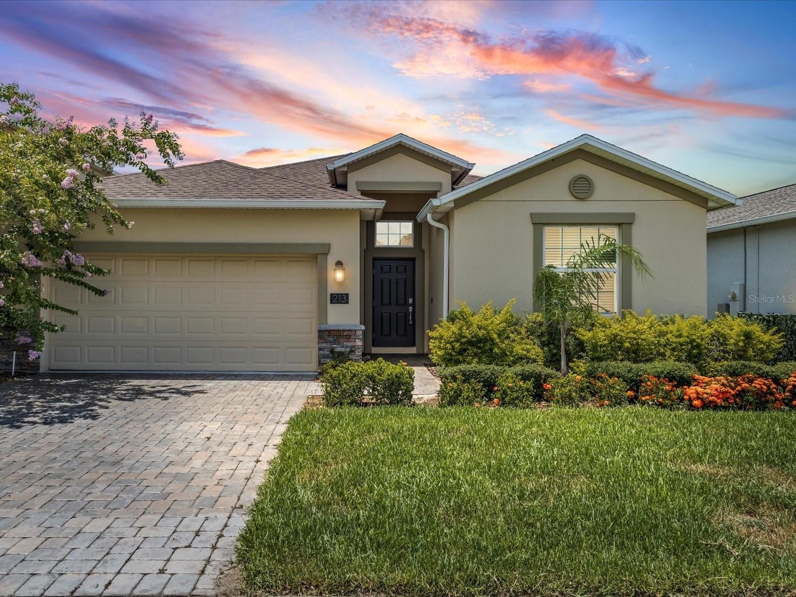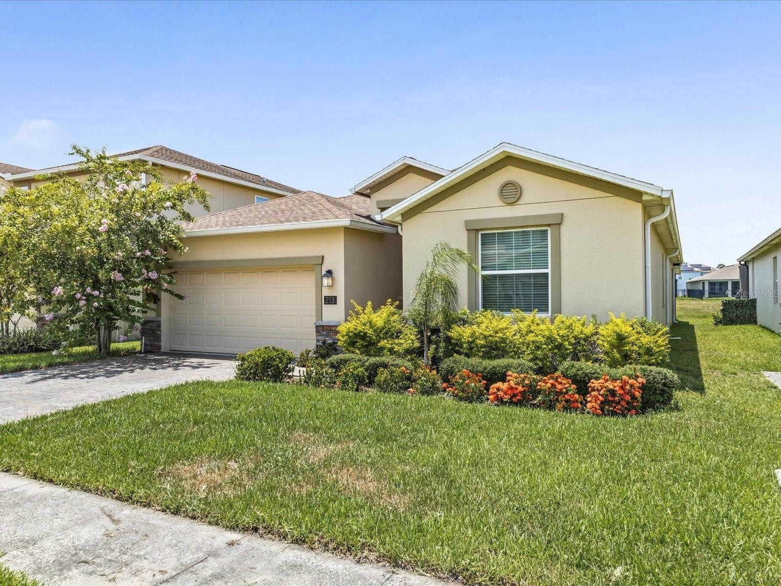 Situated on a premium lot with tranquil pond views, the home features an open-concept floor plan, energy-efficient construction, and upscale finishes throughout. Highlights include 42” solid wood cabinetry, elegant quartz countertops in the kitchen and bathrooms, crown molding, and a large covered lanai perfect for relaxing or entertaining with a view of the pond.