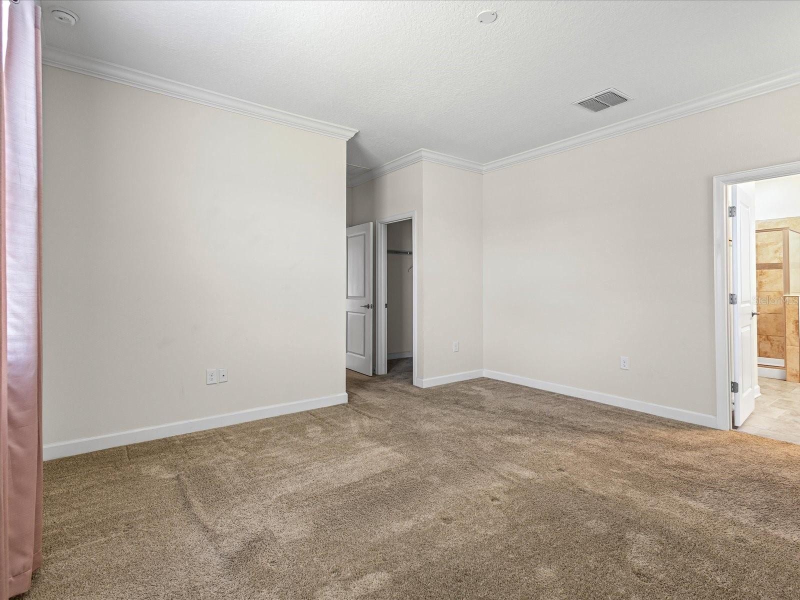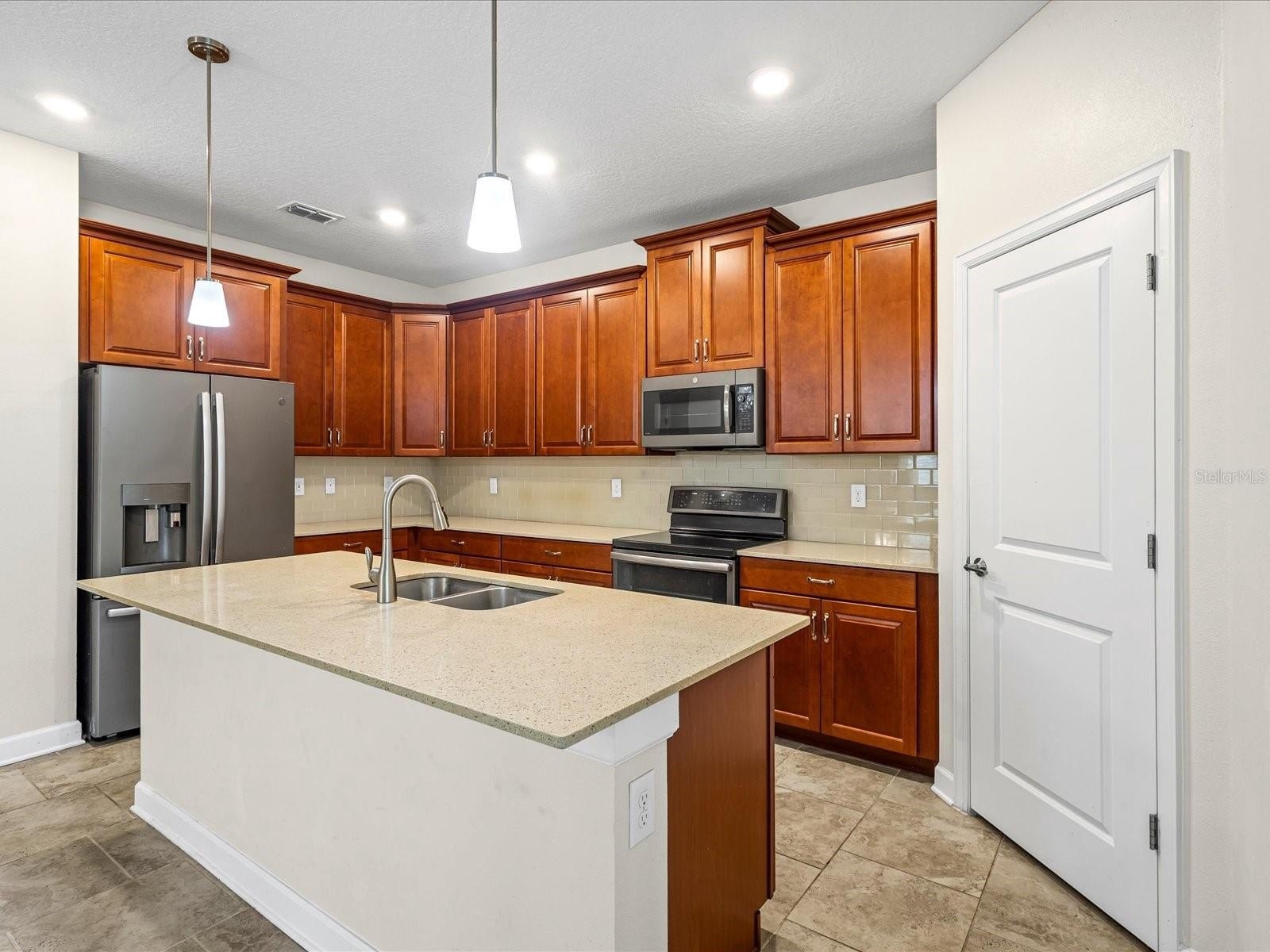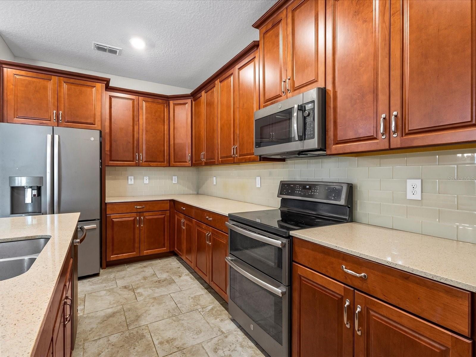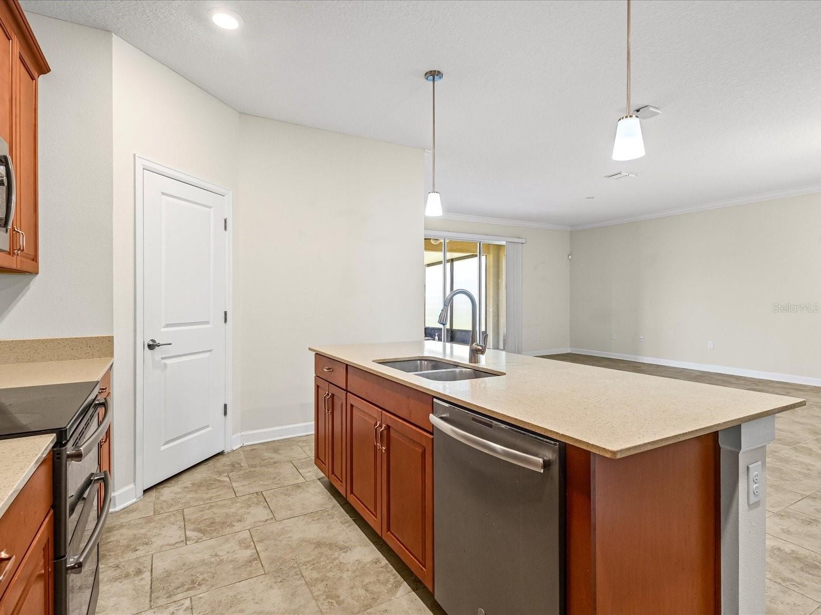 Situated on a premium lot with tranquil pond views, the home features an open-concept floor plan, energy-efficient construction, and upscale finishes throughout. Highlights include 42” solid wood cabinetry, elegant quartz countertops in the kitchen and bathrooms, crown molding, and a large covered lanai perfect for relaxing or entertaining with a view of the pond.