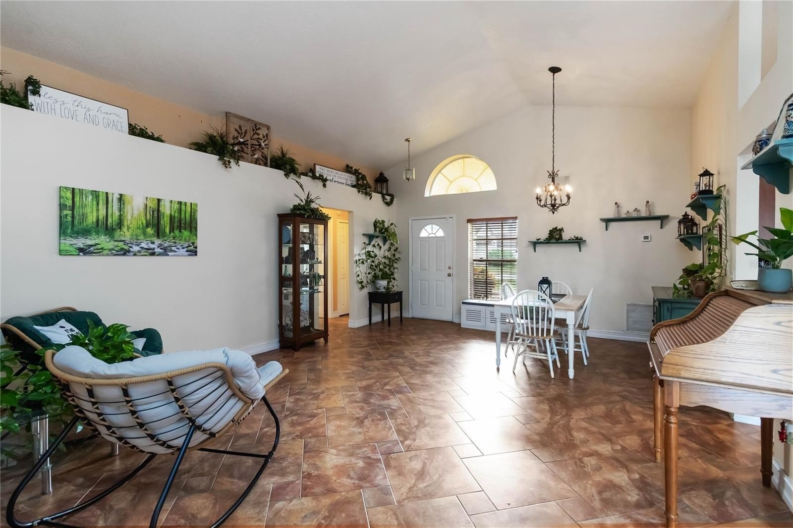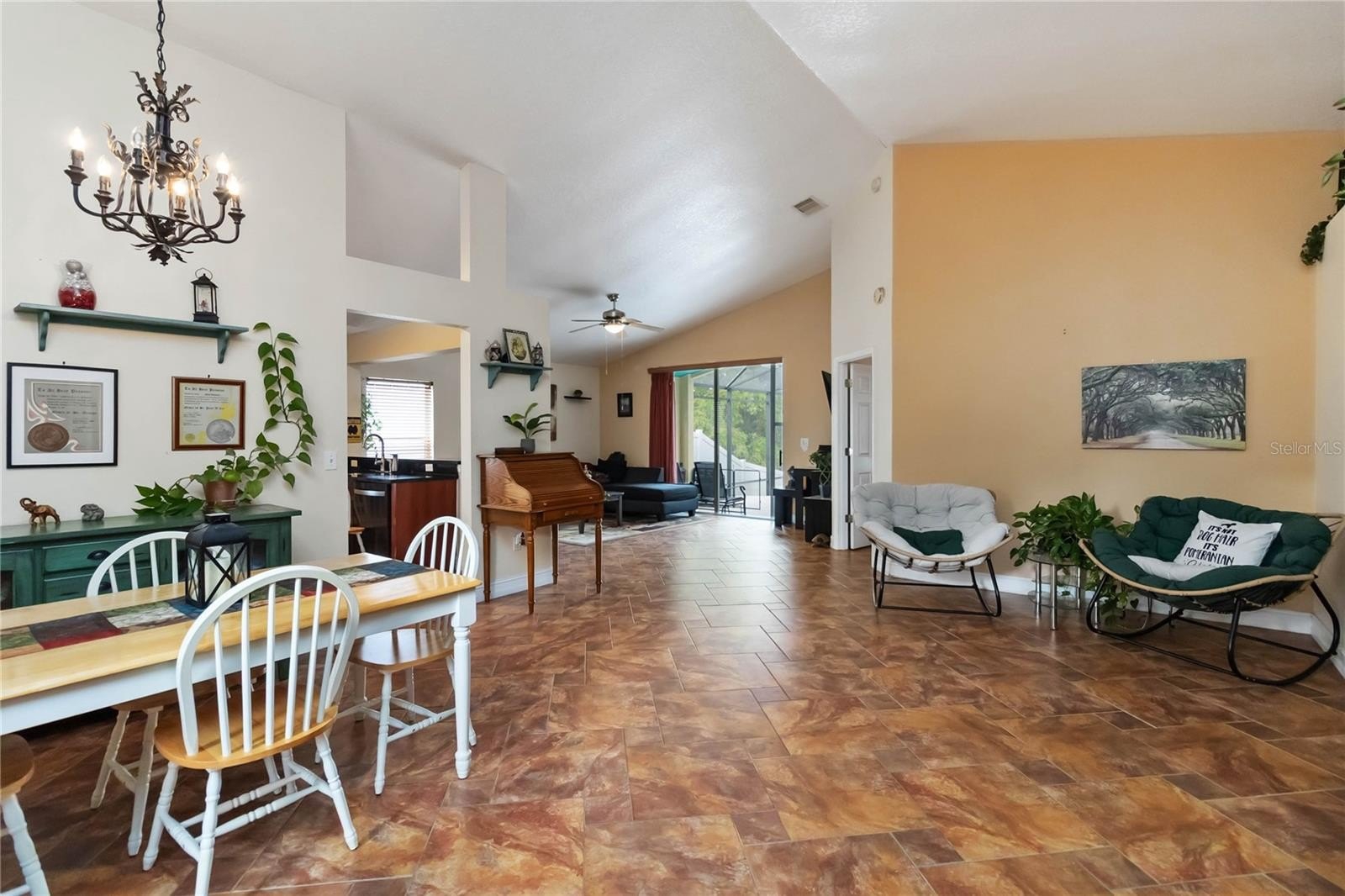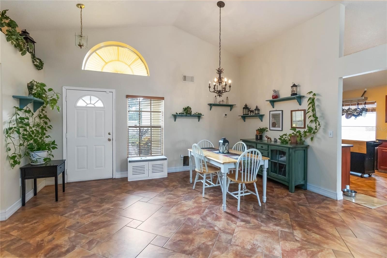 Step inside to find a bright, open layout with vaulted ceilings and abundant natural light. The formal living and dining rooms welcome you at the entry, while just to the right, two secondary bedrooms share a full bath and linen closet.