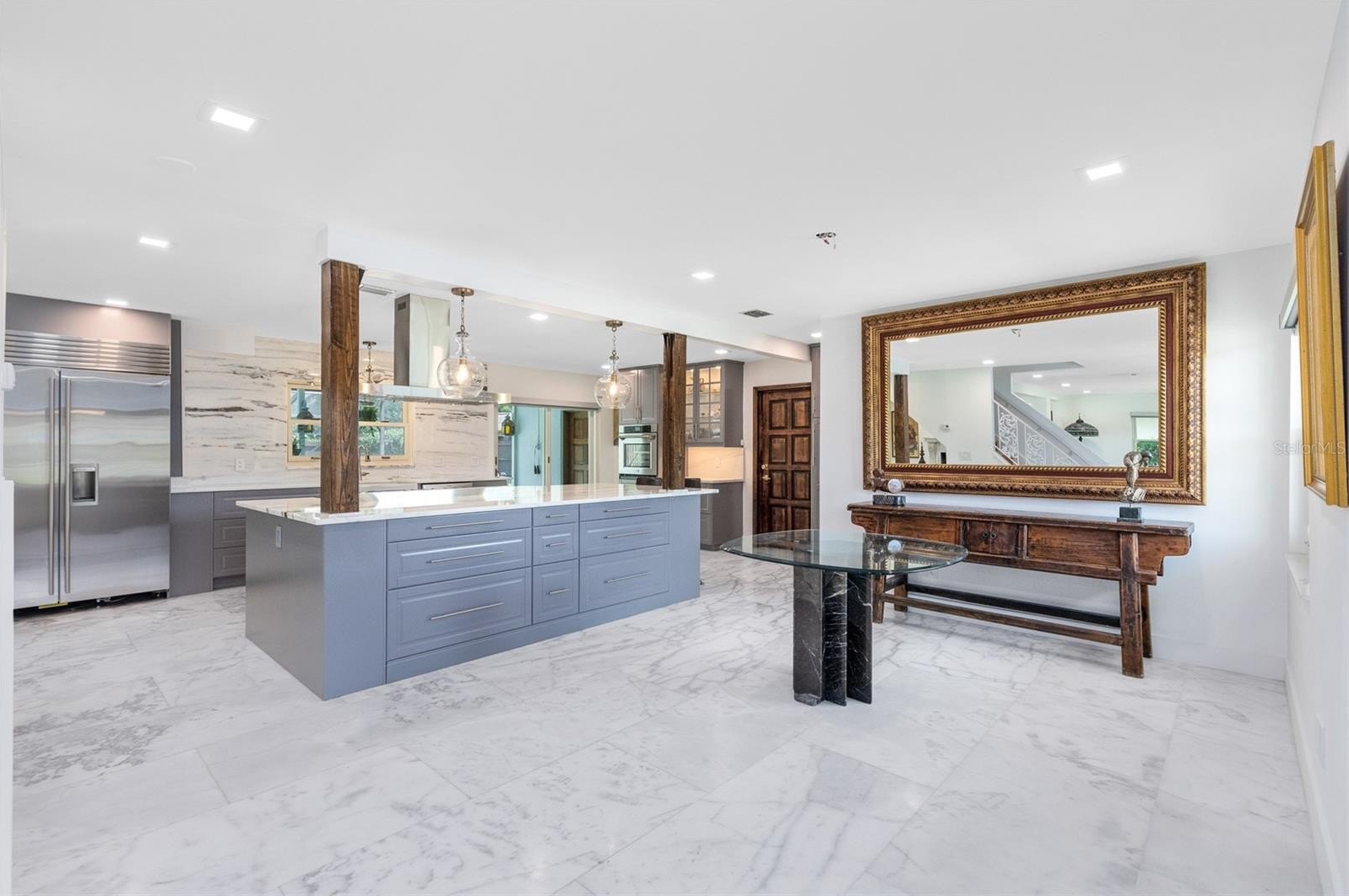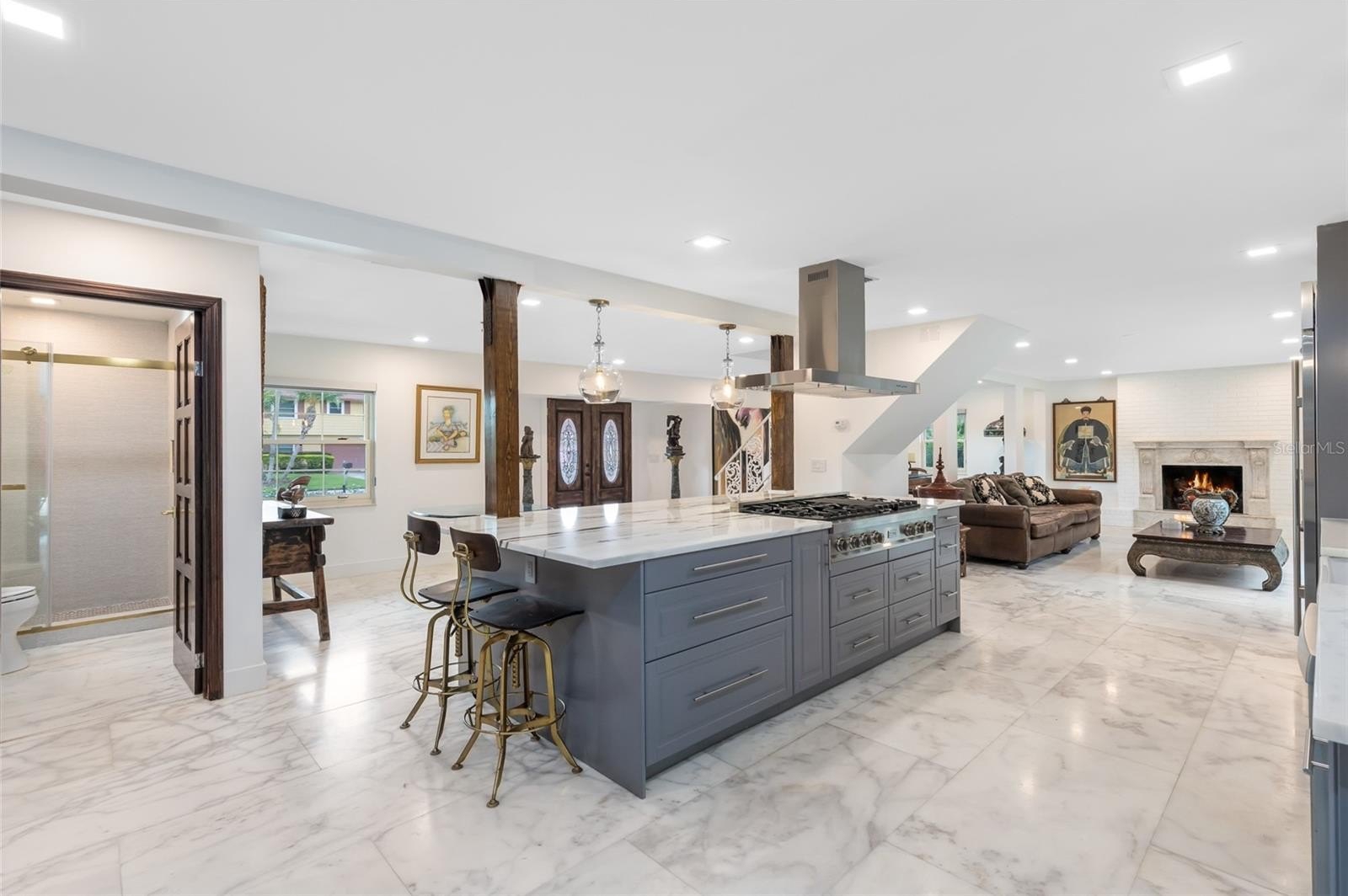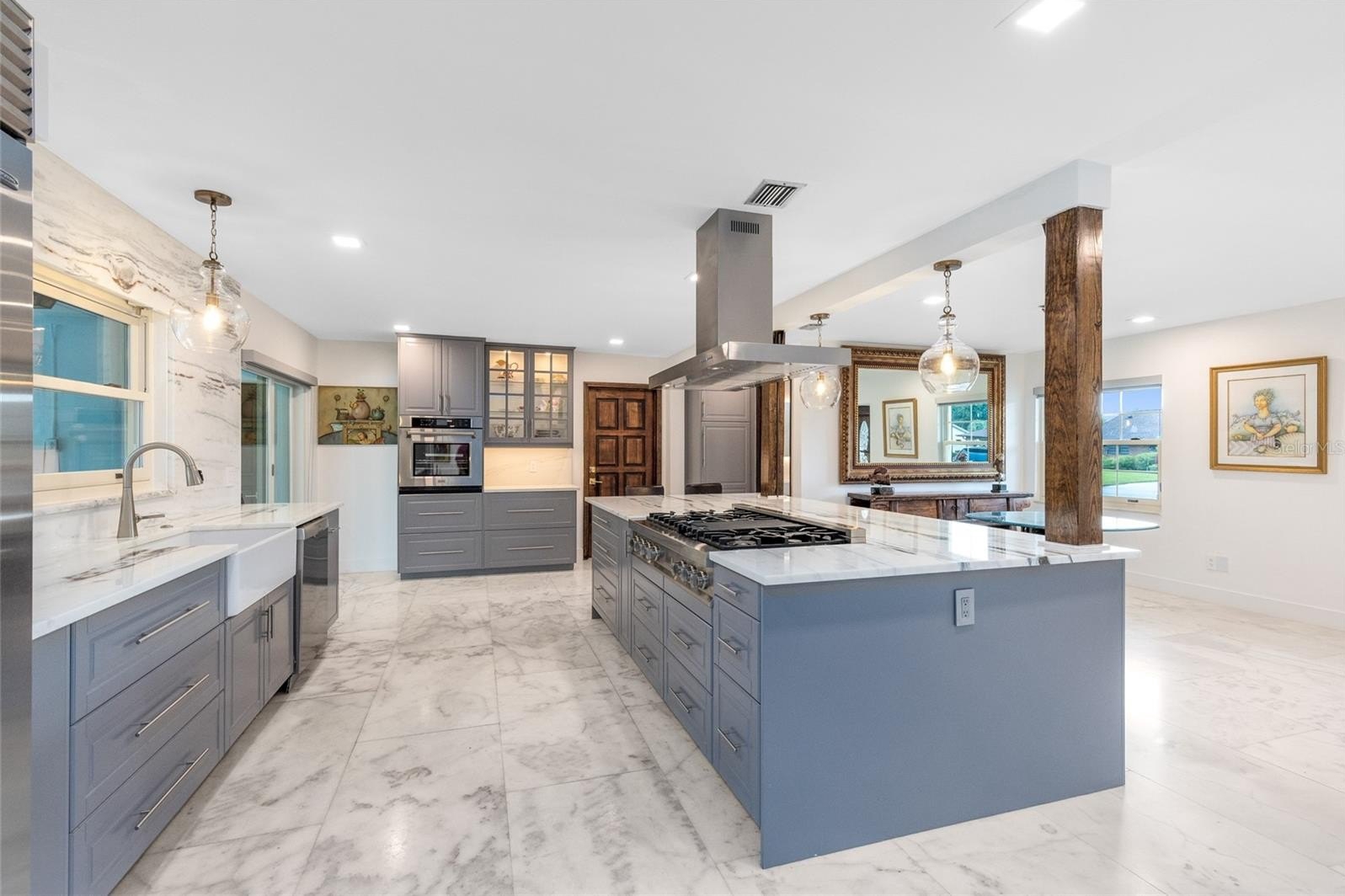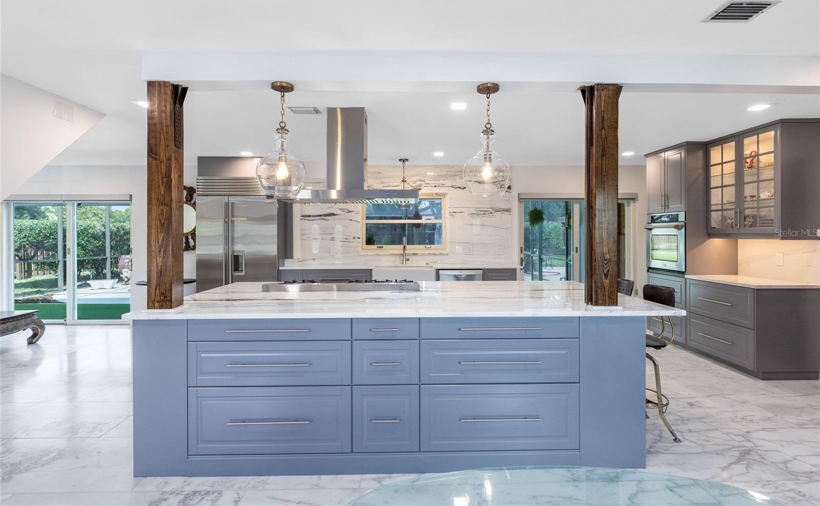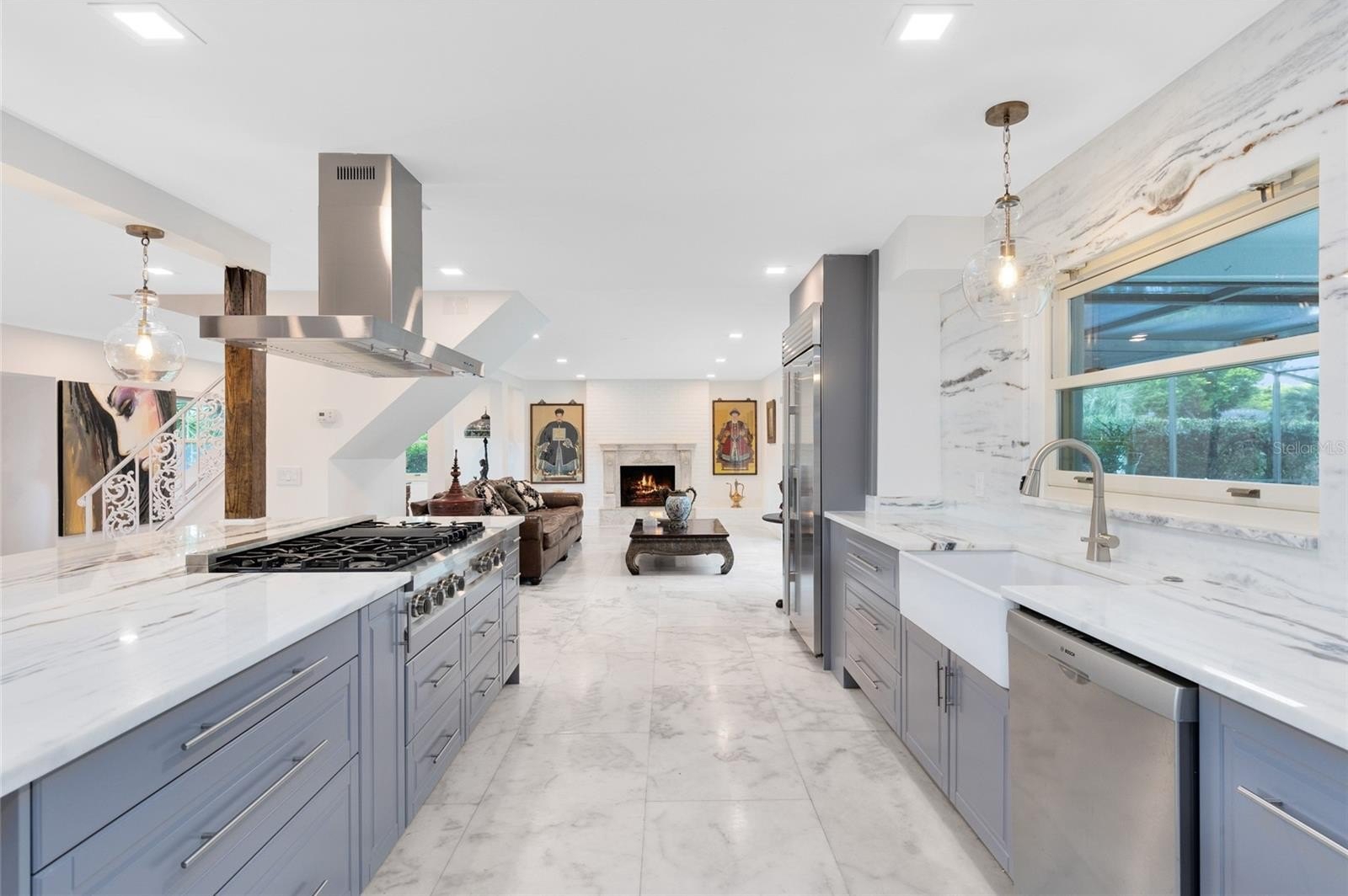 The kitchen is a showpiece, centered by a generous marble waterfall island with bar seating. Custom gray cabinetry, marble counters, a full-height slab backsplash, a farmhouse sink, and statement pendants create a sleek, functional workspace that flows effortlessly to the living and dining rooms and out to the pool, creating a natural hub for both everyday living and gatherings.