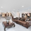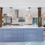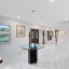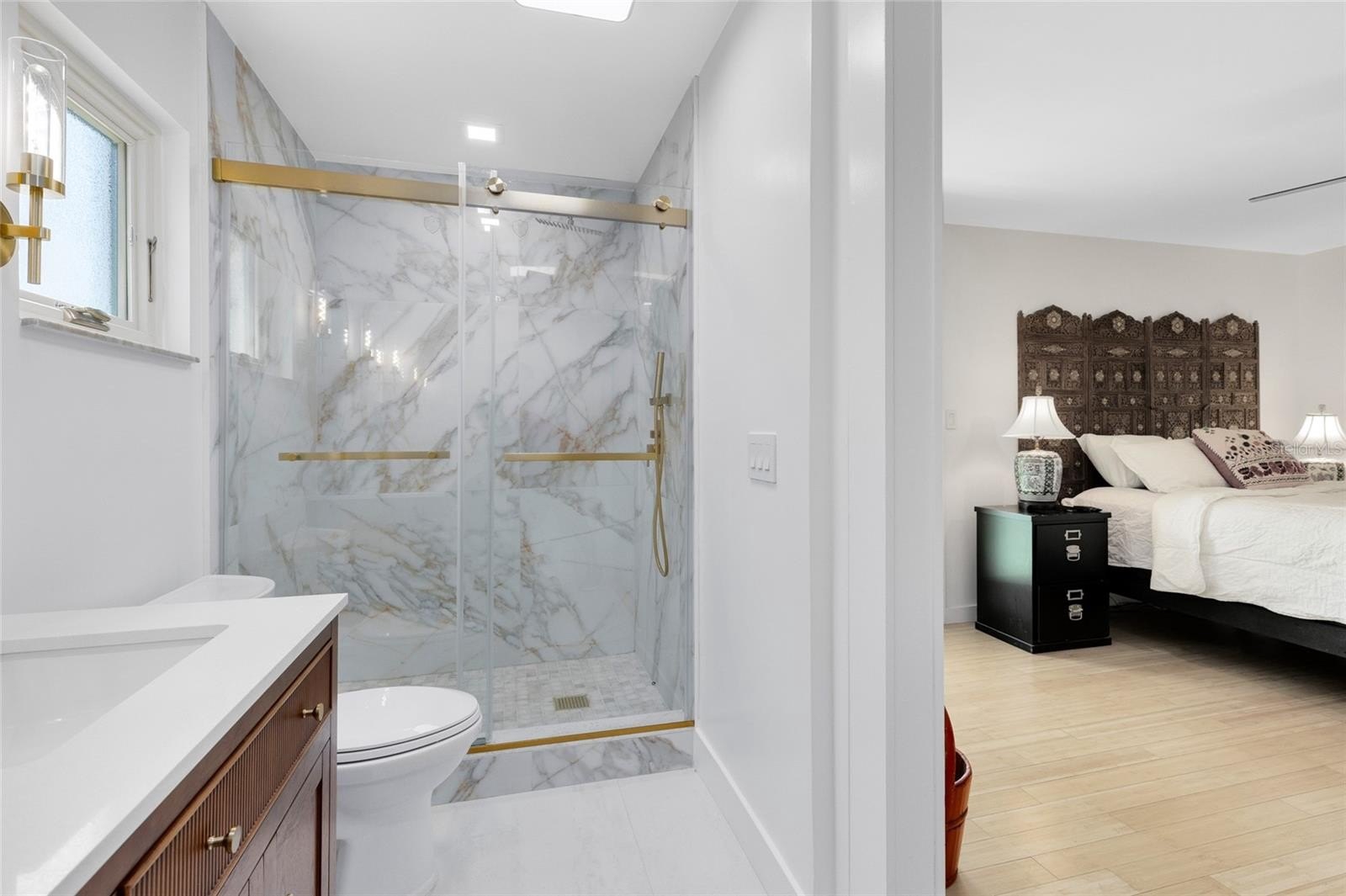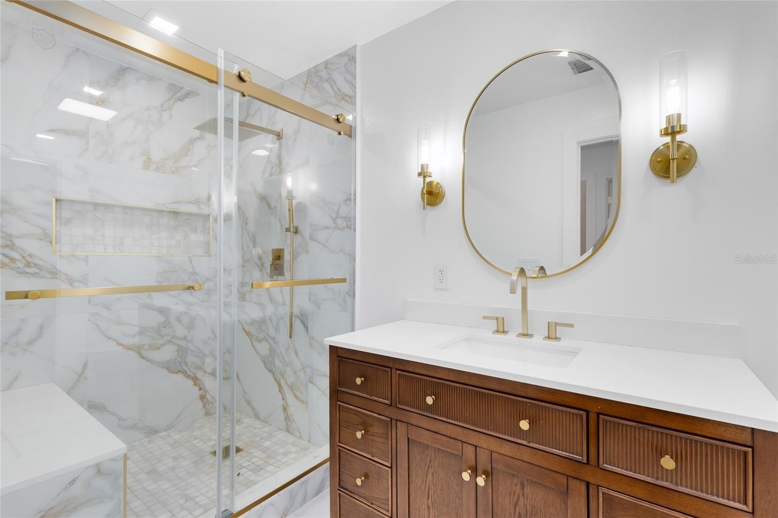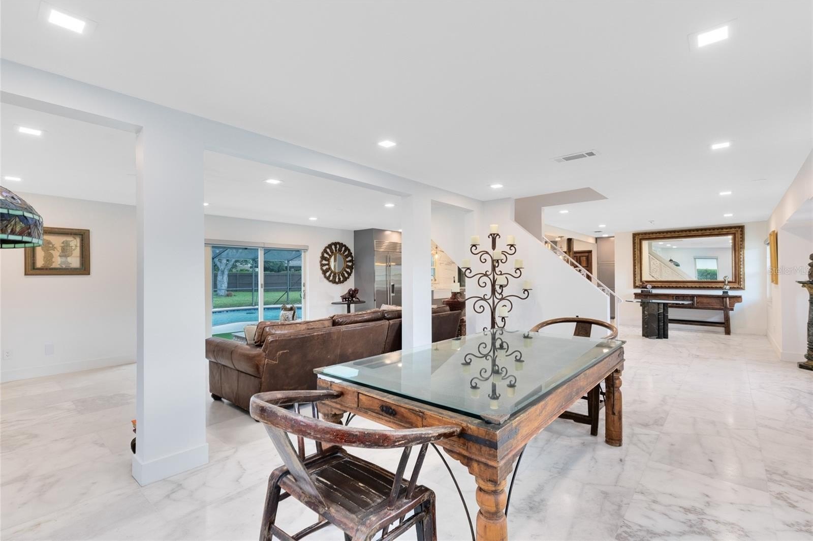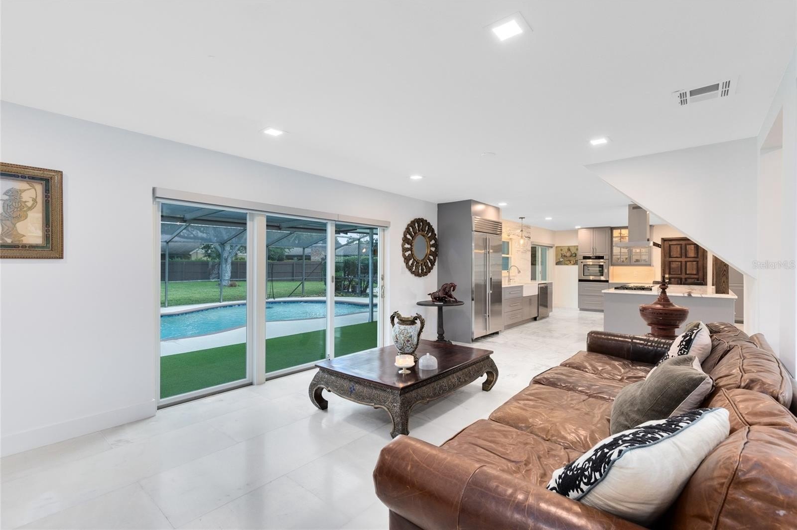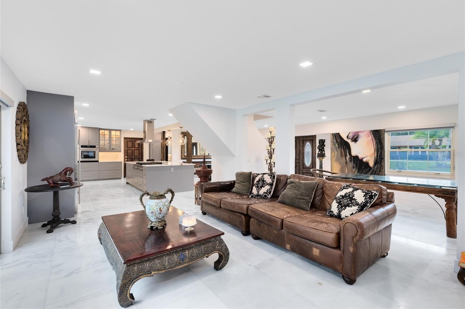The kitchen is a showpiece, centered by a generous marble waterfall island with bar seating. Custom gray cabinetry, marble counters, a full-height slab backsplash, a farmhouse sink, and statement pendants create a sleek, functional workspace that flows effortlessly to the living and dining rooms and out to the pool, creating a natural hub for both everyday living and gatherings.