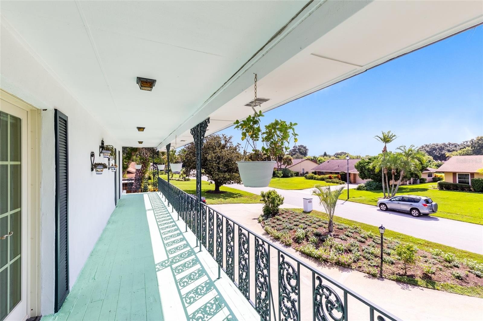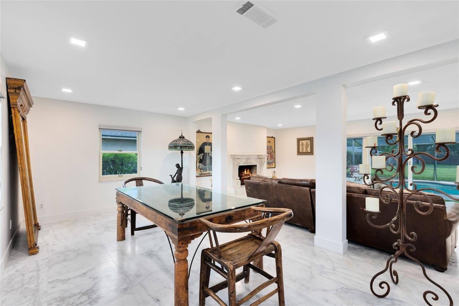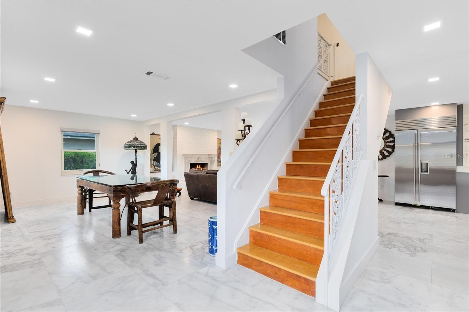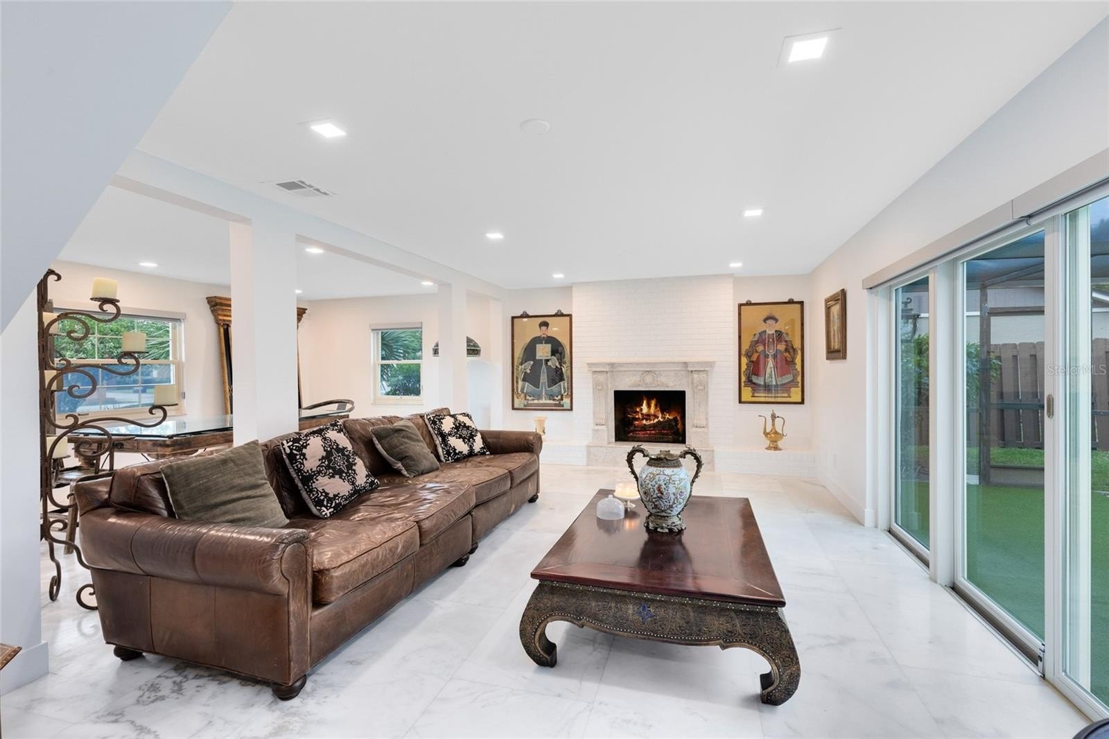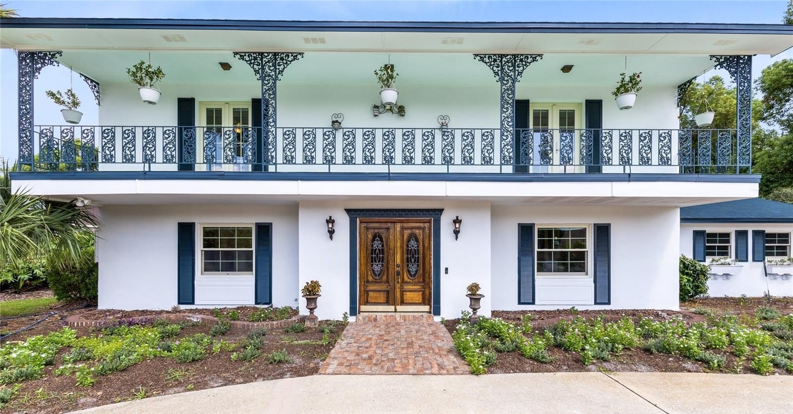 This two-story residence captures timeless charm with its New Orleans-inspired architecture, wrought iron balcony, and circular driveway. Inside, the home has been beautifully remodeled, blending modern upgrades with warm, inviting spaces. The first floor opens with an elegant foyer leading into the living room, where a wood-burning fireplace and sliding doors frame serene views of the lanai, pool, and lush backyard. The marble flooring extends throughout the main level, tying the living and dining spaces together for effortless entertaining.