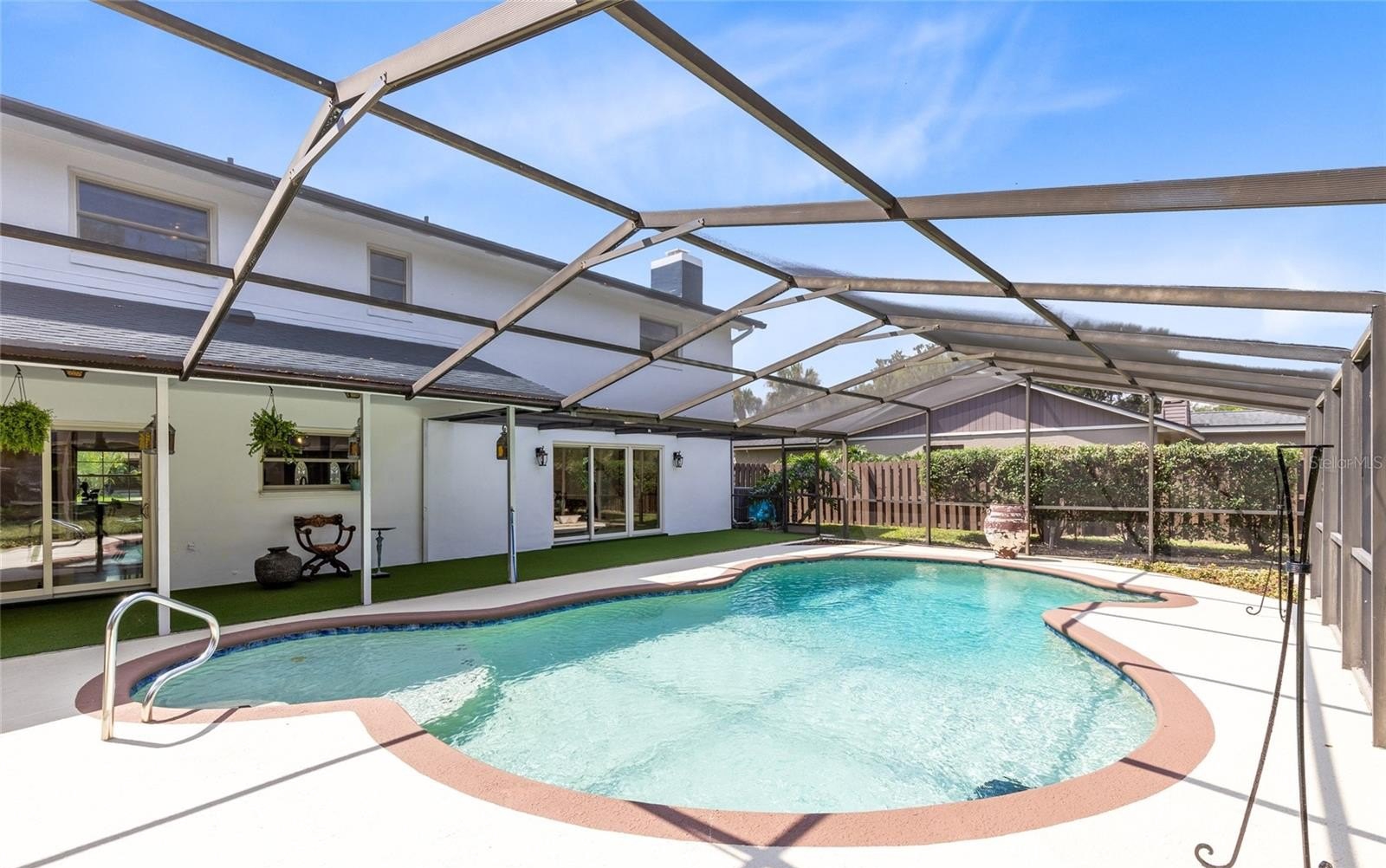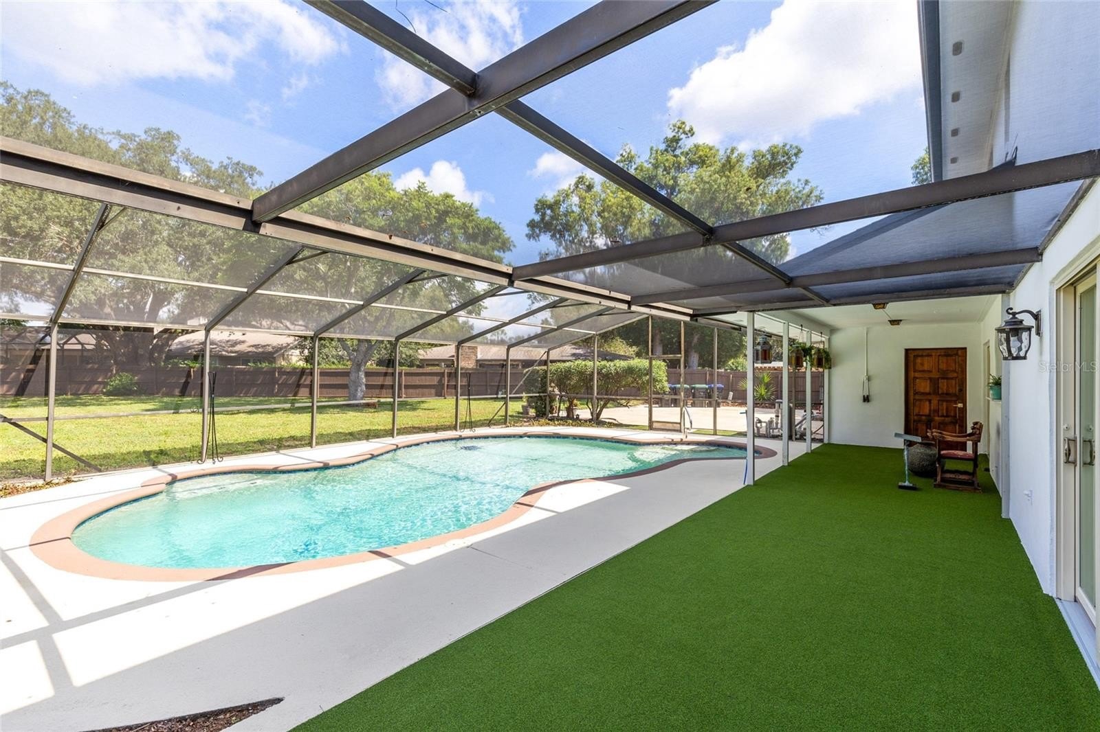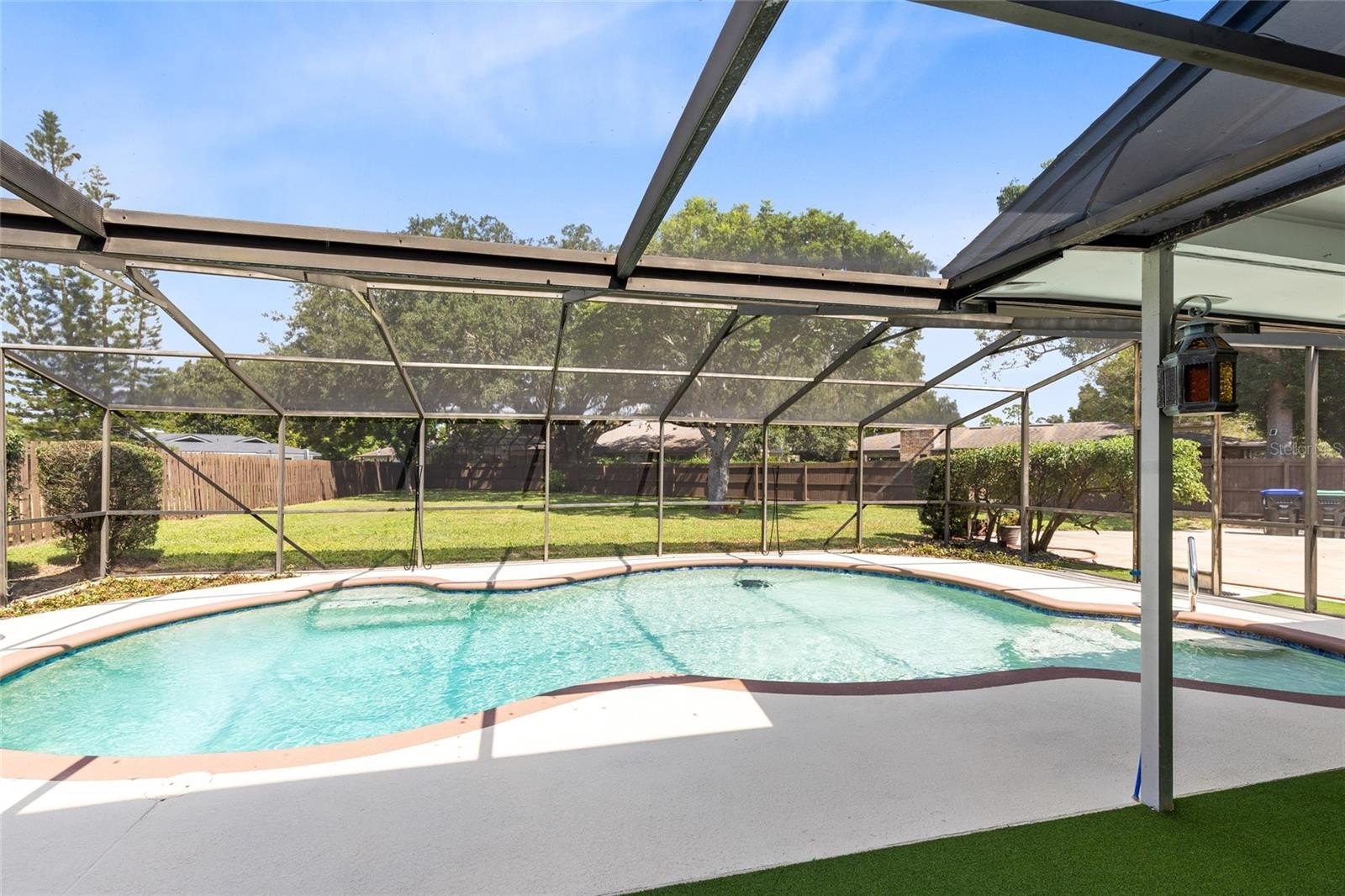 Step outside to discover a private retreat. The screened lanai opens to a sparkling pool with a newly installed saltwater system, complemented by a solar heating system with warranty and a resurfaced pool deck. Surrounded by mature landscaping and a fully fenced yard, the outdoor space feels secluded while offering plenty of room for entertaining or play. A private irrigation well helps keep the grounds lush and green.