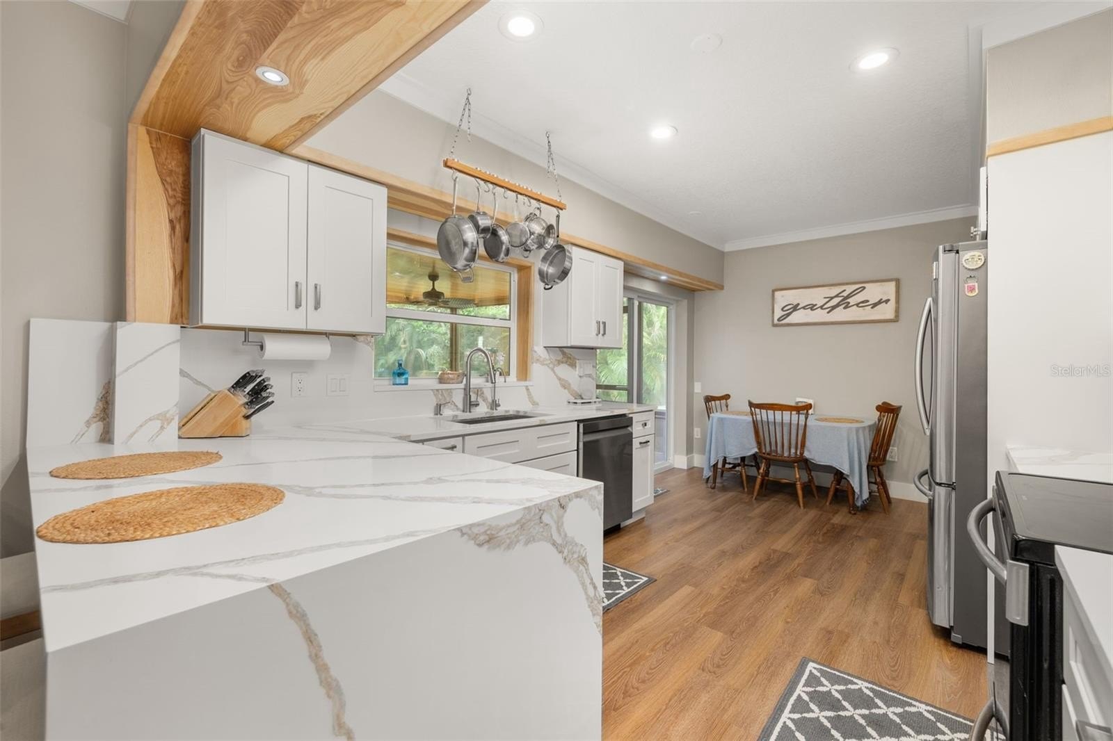 The recently upgraded kitchen is a chef's dream, equipped with a state-of-the-art induction range, sleek quartz counter tops with waterfall, and modern cabinetry—perfect for preparing meals and hosting gatherings. Just off the kitchen area is the outdoor living space featuring an enclosed lanai and outdoor kitchen. The over-sized backyard is beautifully landscaped and fenced, giving complete privacy and creating your very own private oasis—ideal for enjoying Florida’s beautiful weather, hosting barbecues, or relaxing with family and friends.