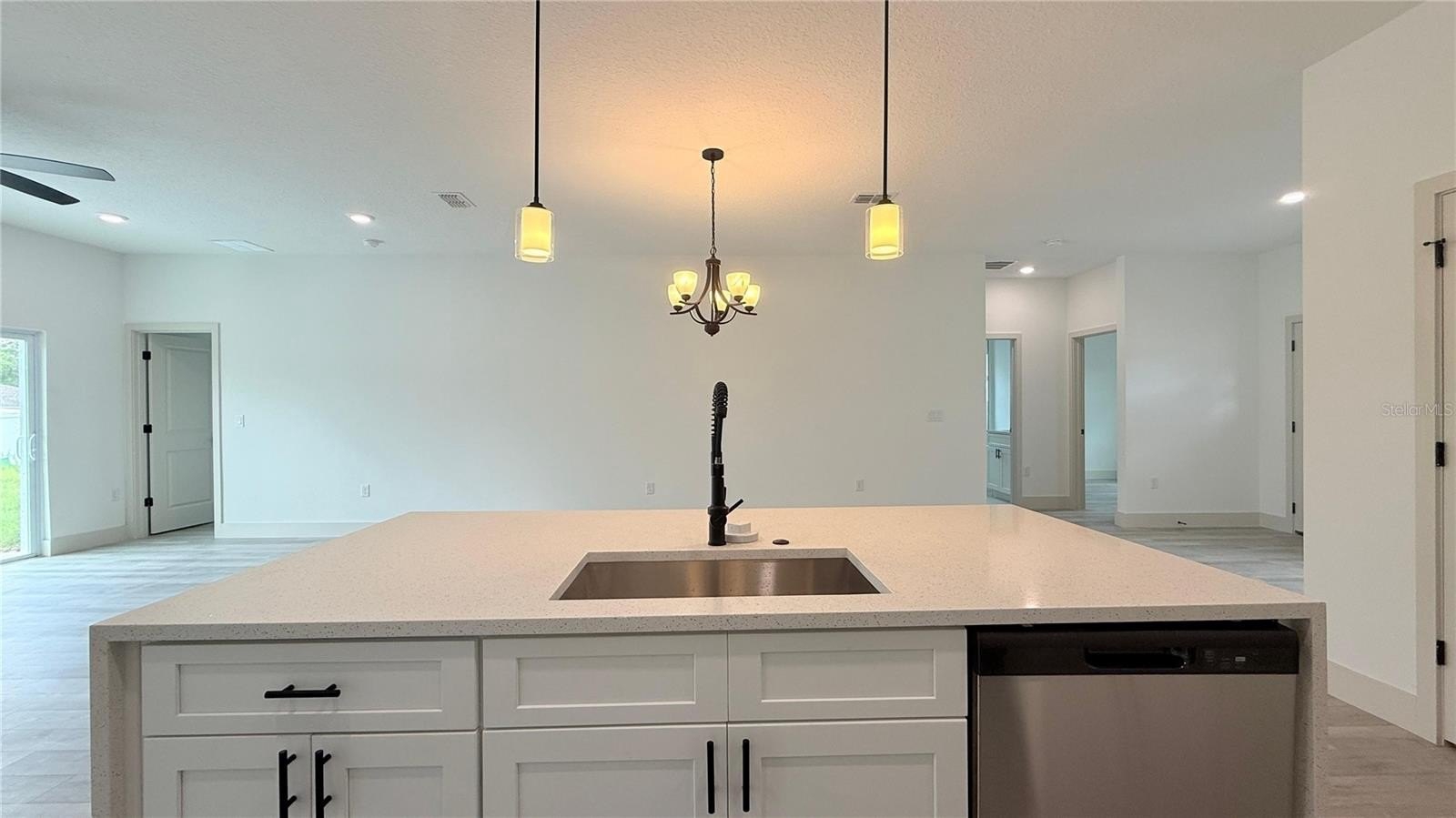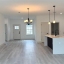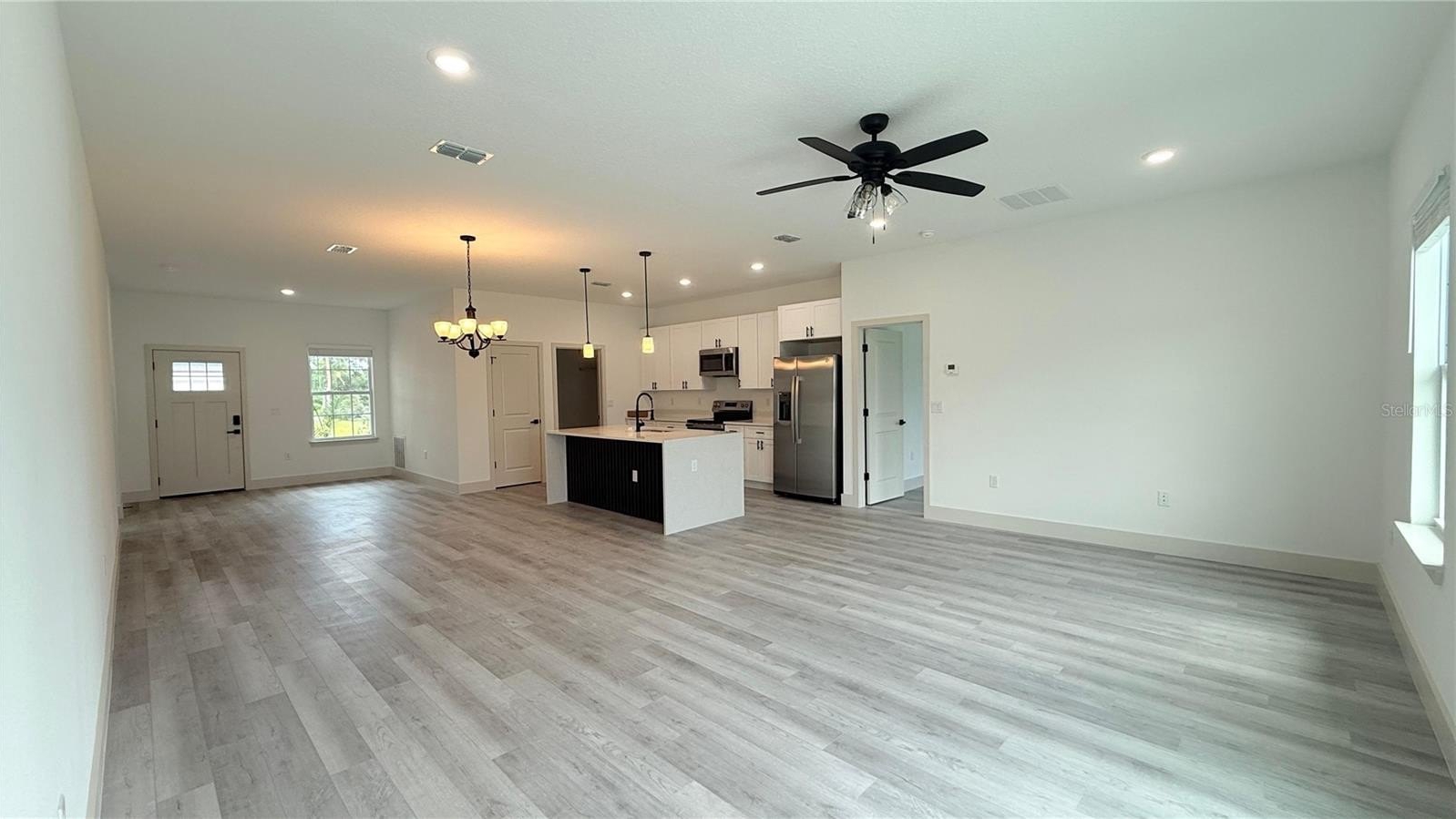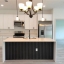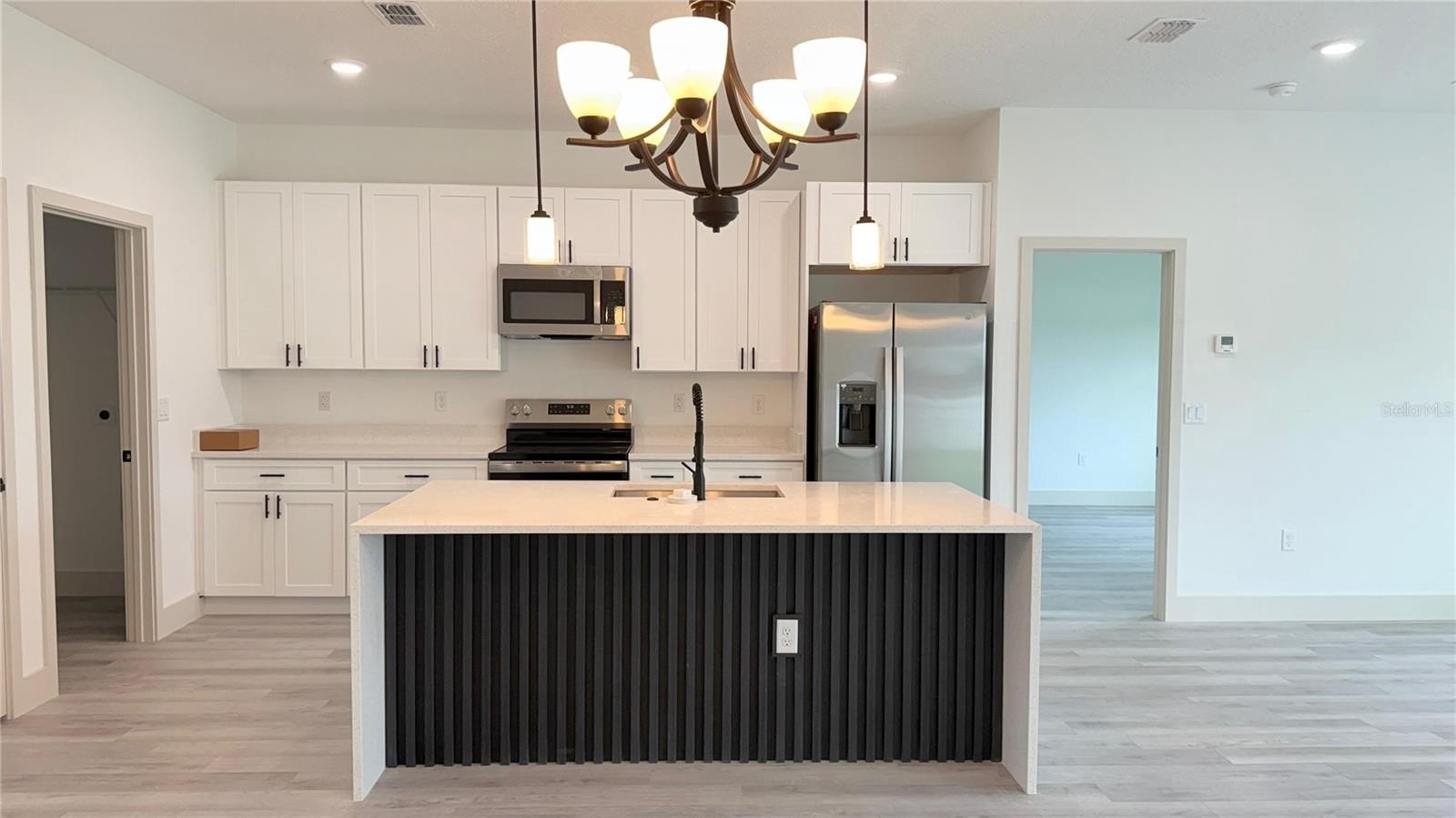 The open-concept kitchen is a showstopper with a WATERFALL QUARTZ ISLAND with a striking dark slatted wood accent and comes fully equipped with stainless steel appliances—refrigerator, range, microwave, dishwasher, and disposal.