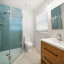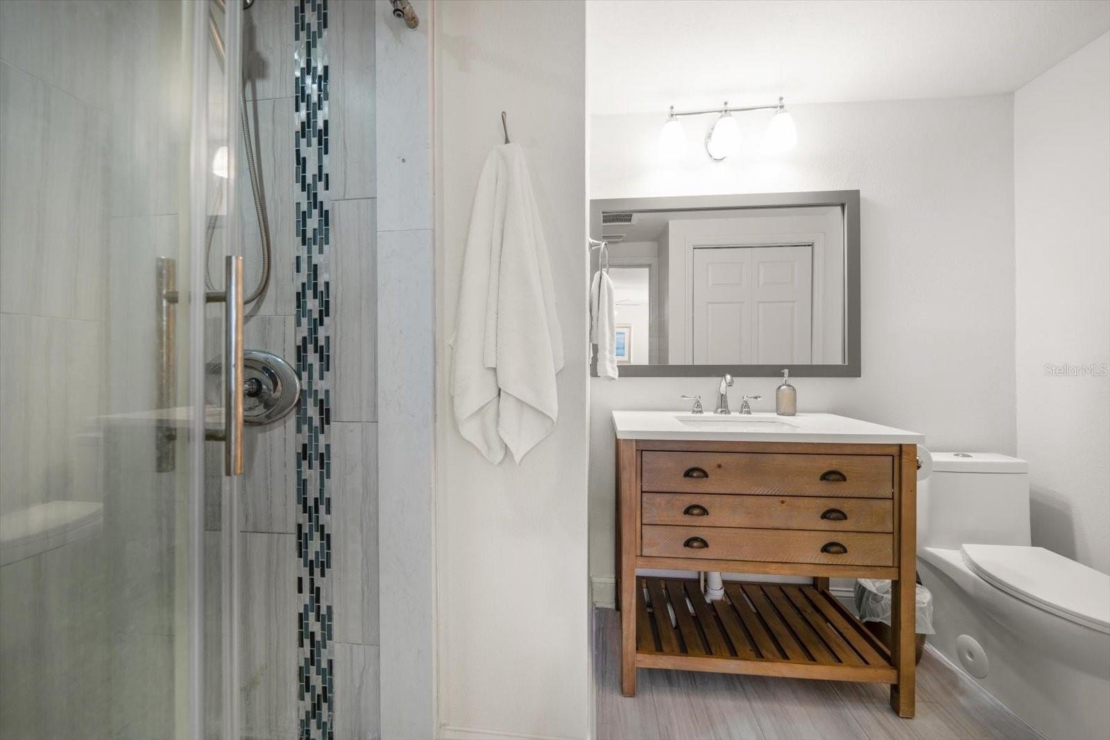 The updated kitchen is designed for function and style, showcasing white shaker cabinets, quartz countertops, stainless steel appliances, and a breakfast nook. The dining area connects seamlessly, making it ideal for entertaining. The primary suite offers a bright retreat with a custom-tiled walk-in shower and quartz vanity. Additional bedrooms provide generous closet space and comfort for family or guests.