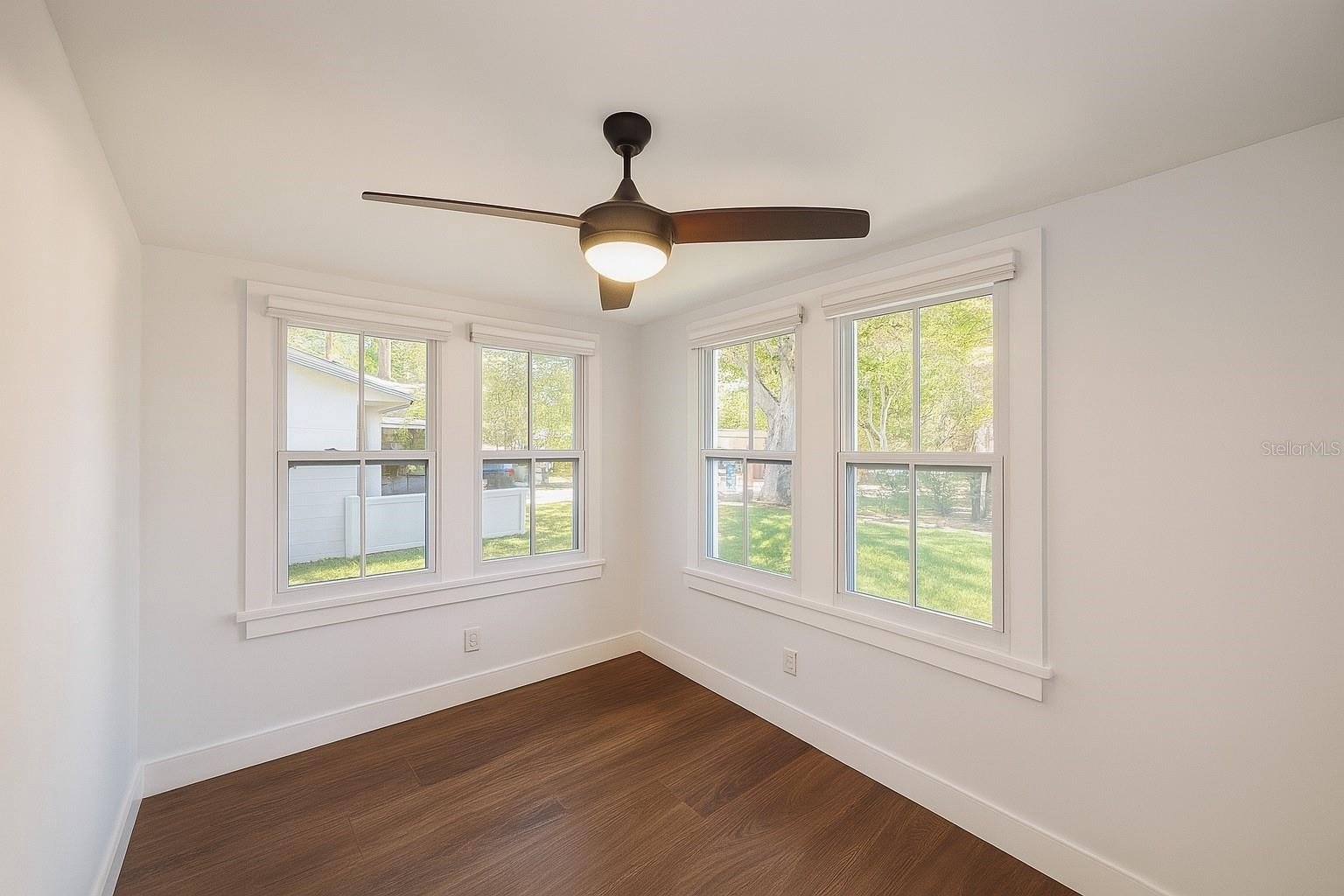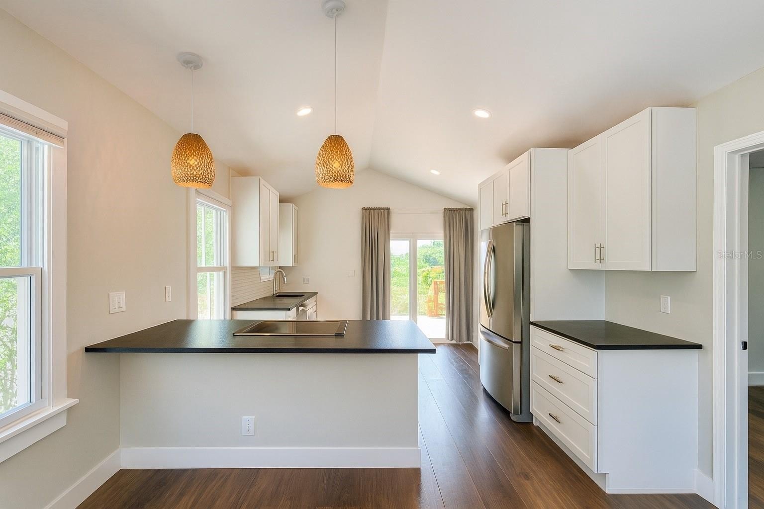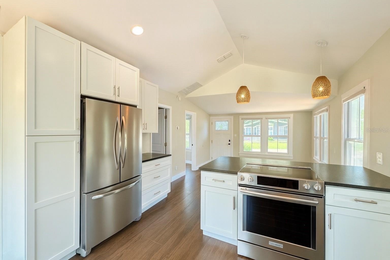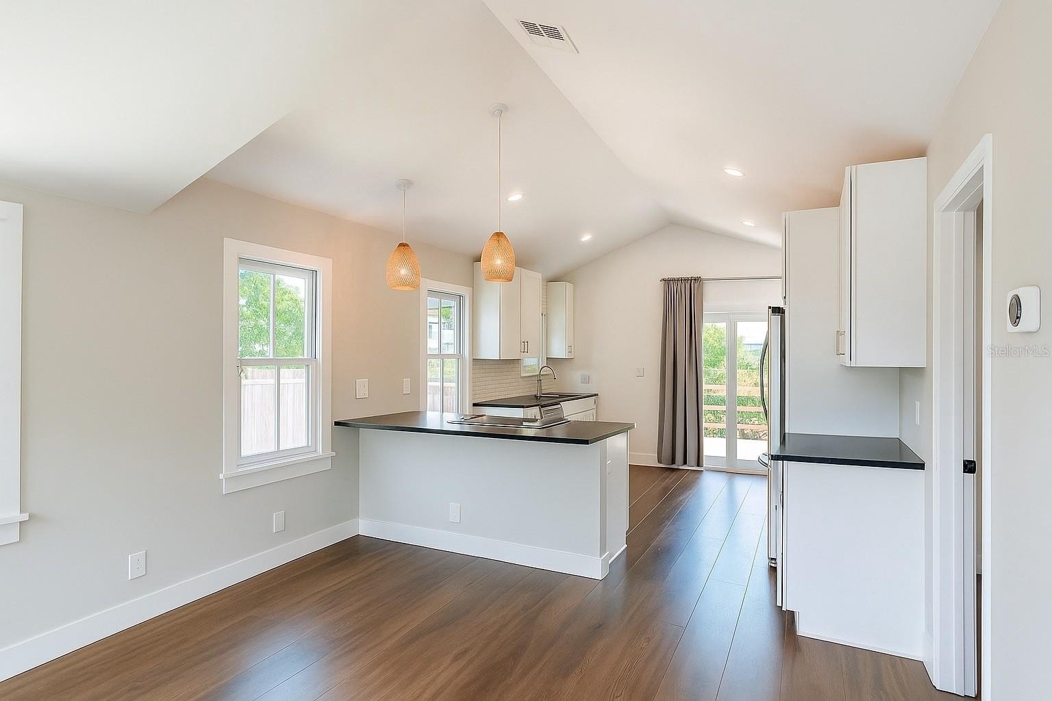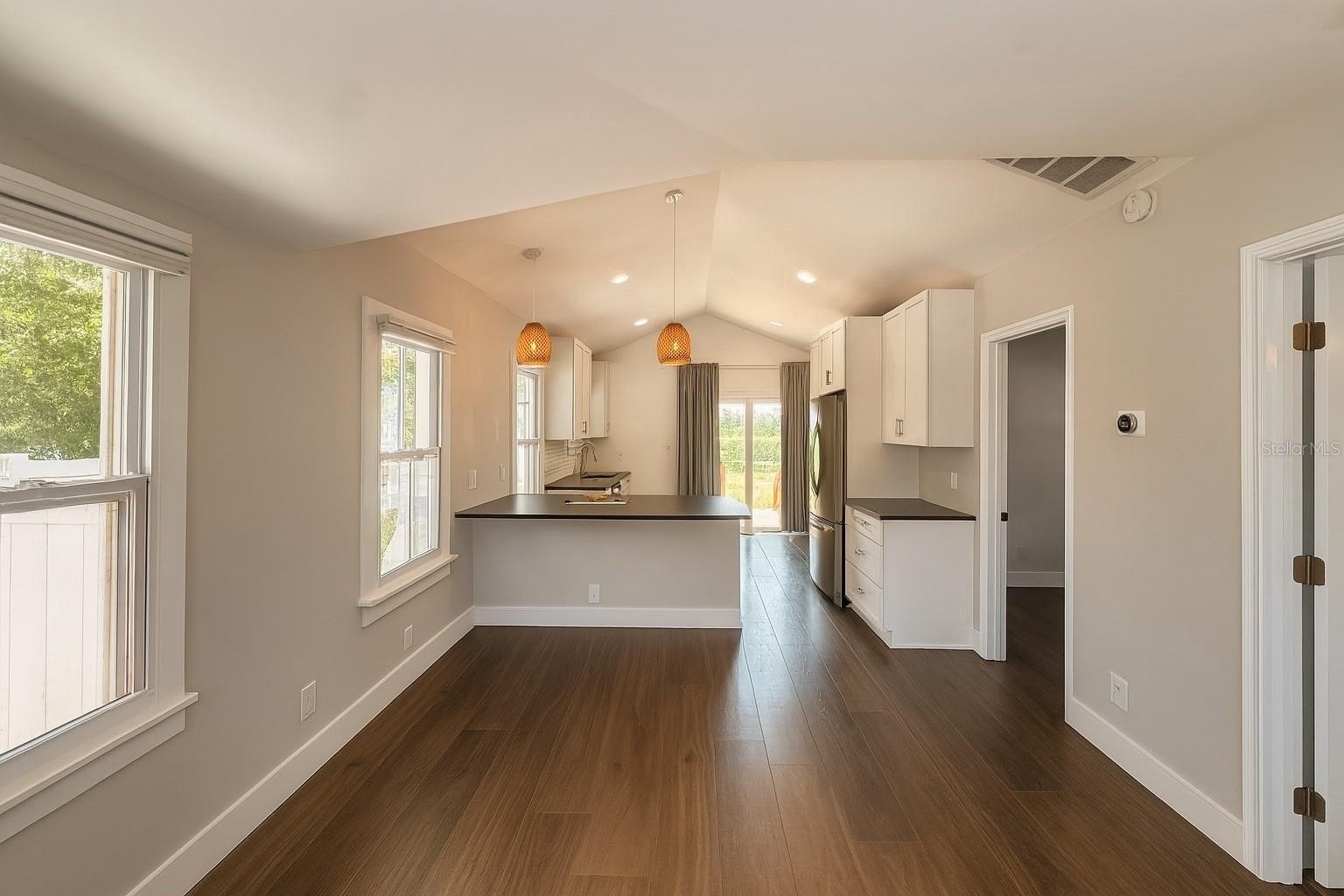 bright and airy interior, freshly updated with soaring vaulted ceilings, luxury vinyl plank flooring, and plenty of natural sunlight pouring through updated windows.