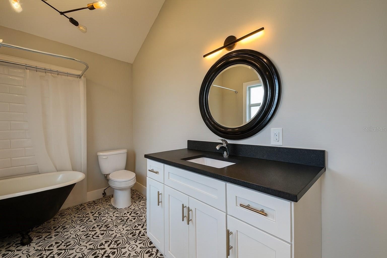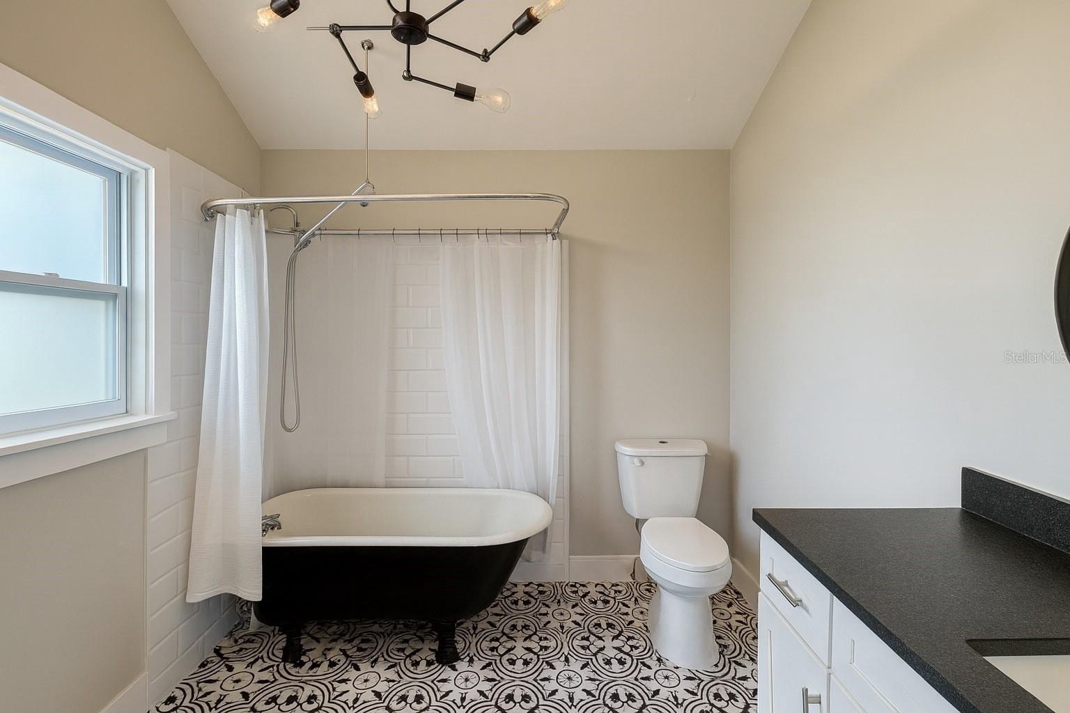 The oversized bathroom is a true standout, boasting a vintage claw-foot tub with shower, offering both charm and comfort in one stylish space.