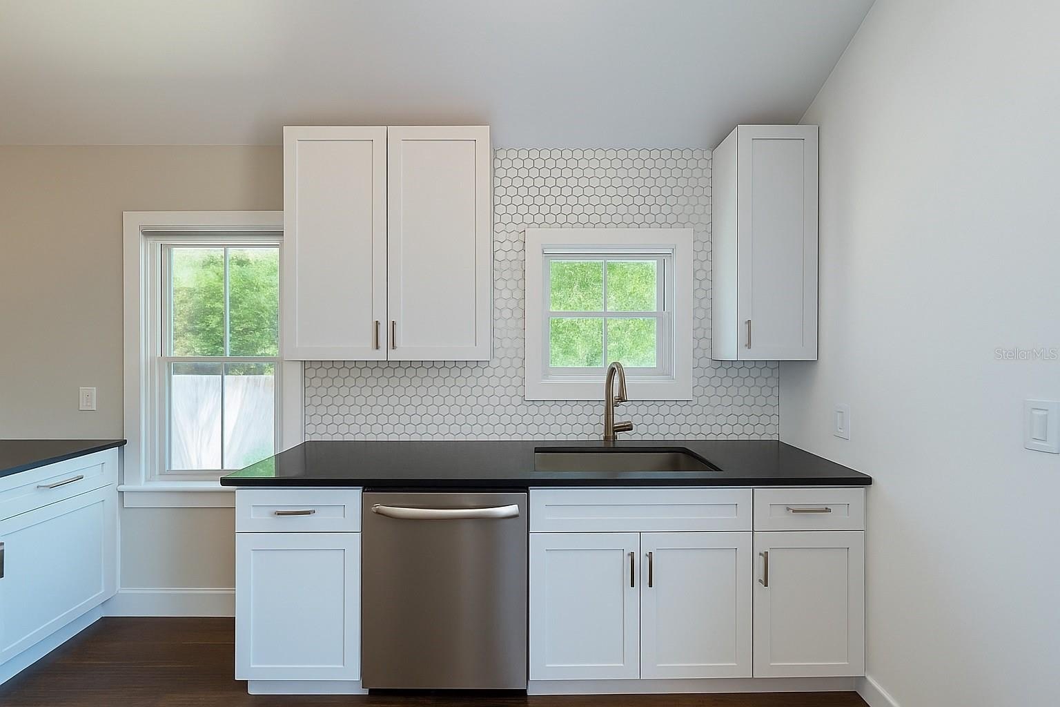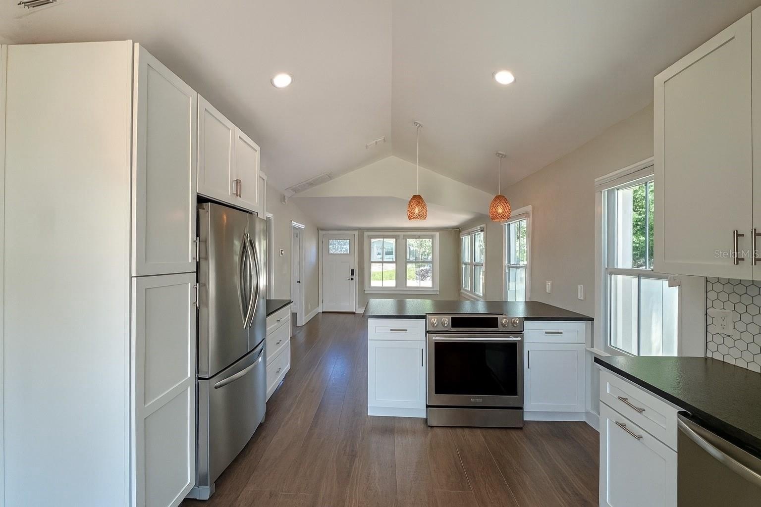 At the heart of the home is a beautifully remodeled kitchen featuring generous counter space, ample cabinetry, sleek stainless steel appliances, a modern tile backsplash, and