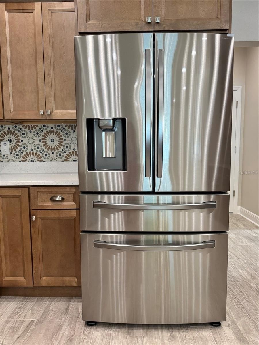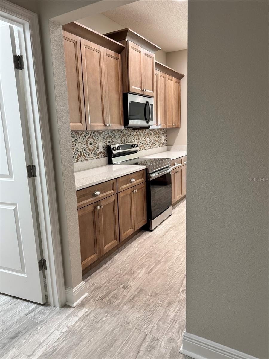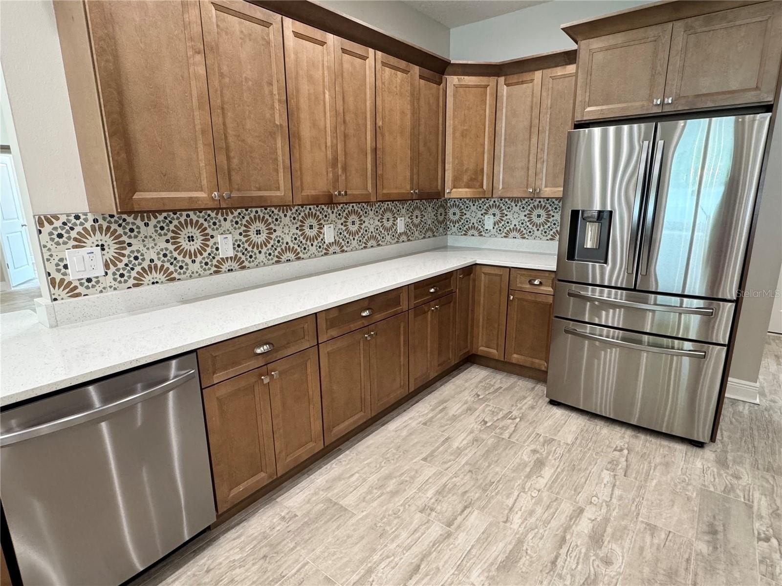 Gourmet Kitchen: Enjoy cooking in your upgraded chef’s kitchen with custom wood cabinetry, sleek stainless steel appliances, sparkling quartz countertops, and an eye-catching tile backsplash.