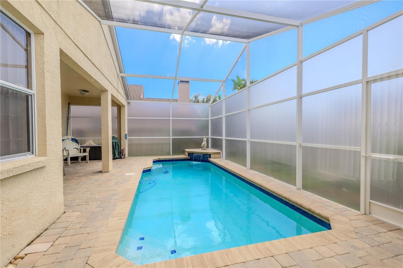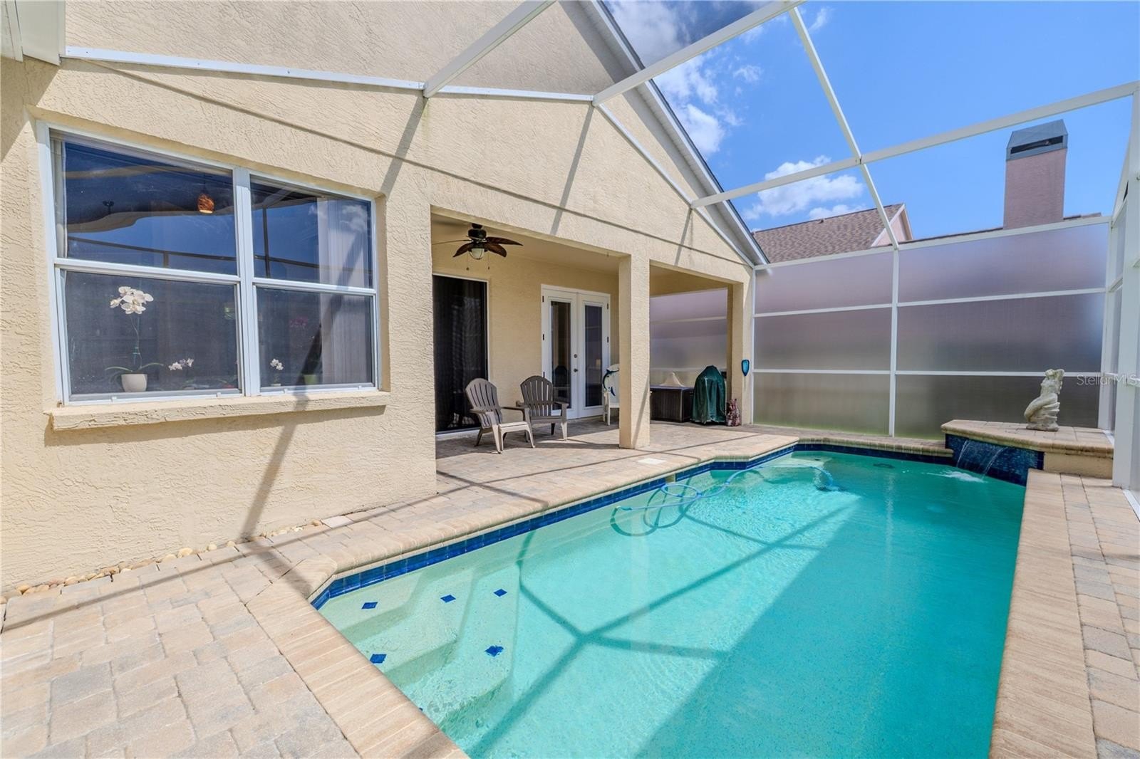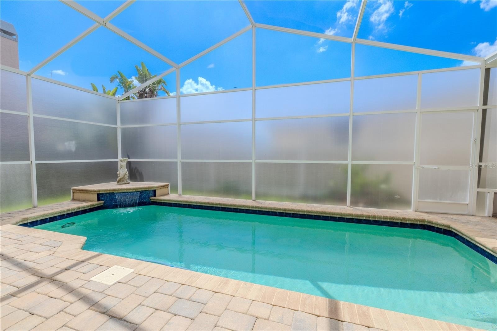 Step outside to your screened-in lanai—your own private oasis. The covered patio is paved and perfect for entertaining, complete with dual ceiling fans and plenty of room for outdoor dining or relaxing by the pool. The pool itself is surrounded by privacy panels and features a tranquil water feature, making it feel like a secluded getaway all year long.