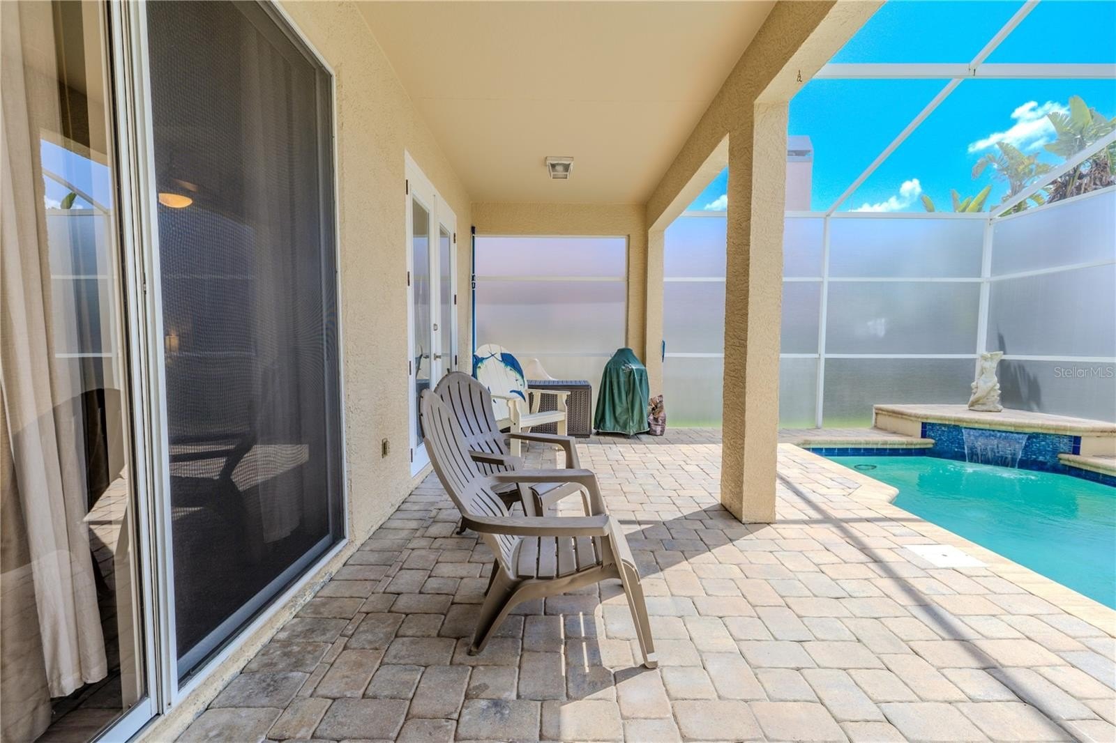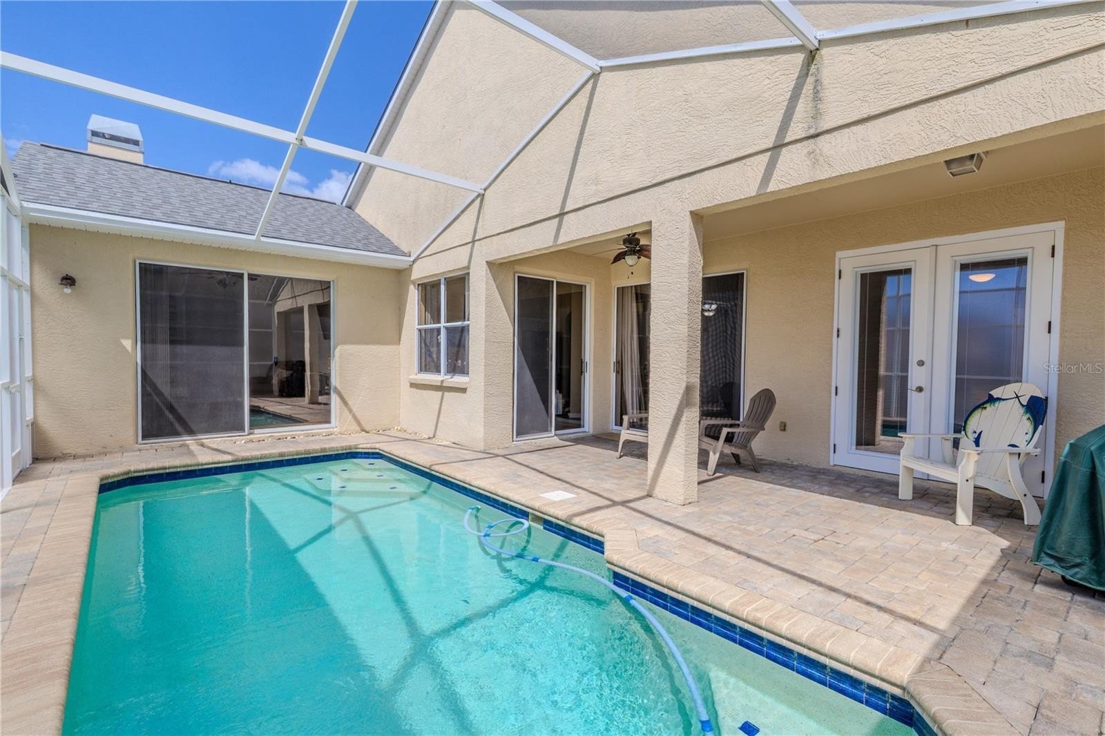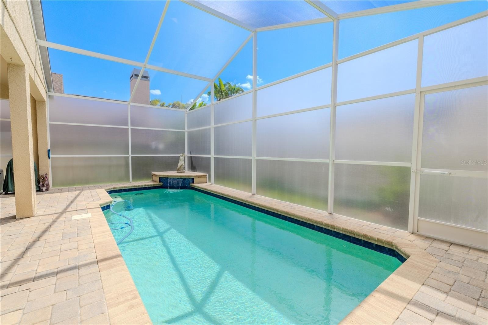 Step outside to your screened-in lanai—your own private oasis. The covered patio is paved and perfect for entertaining, complete with dual ceiling fans and plenty of room for outdoor dining or relaxing by the pool. The pool itself is surrounded by privacy panels and features a tranquil water feature, making it feel like a secluded getaway all year long.