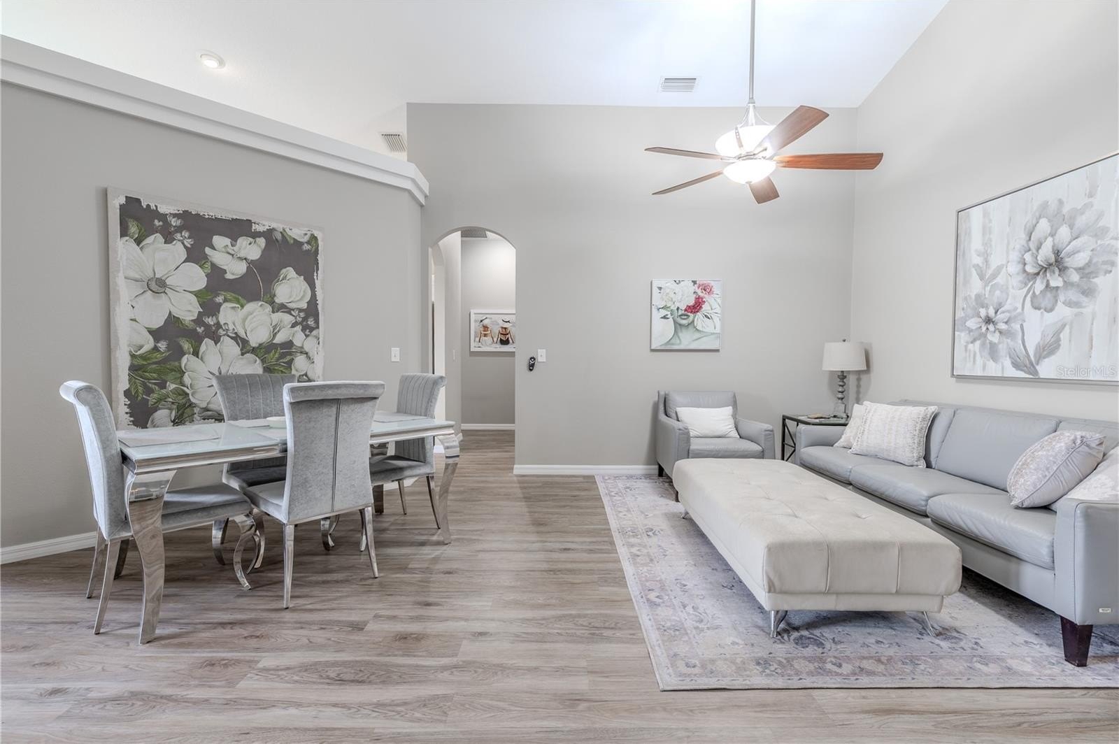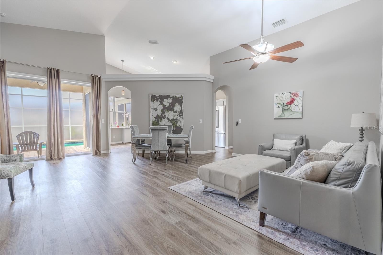 The formal living and dining rooms are bathed in soft, neutral tones, with high ceilings, elegant details, and large sliding glass doors that let natural light pour in while offering a beautiful view of the pool. The dining room sits perfectly between the living room and kitchen—ideal for hosting friends or holiday dinners.