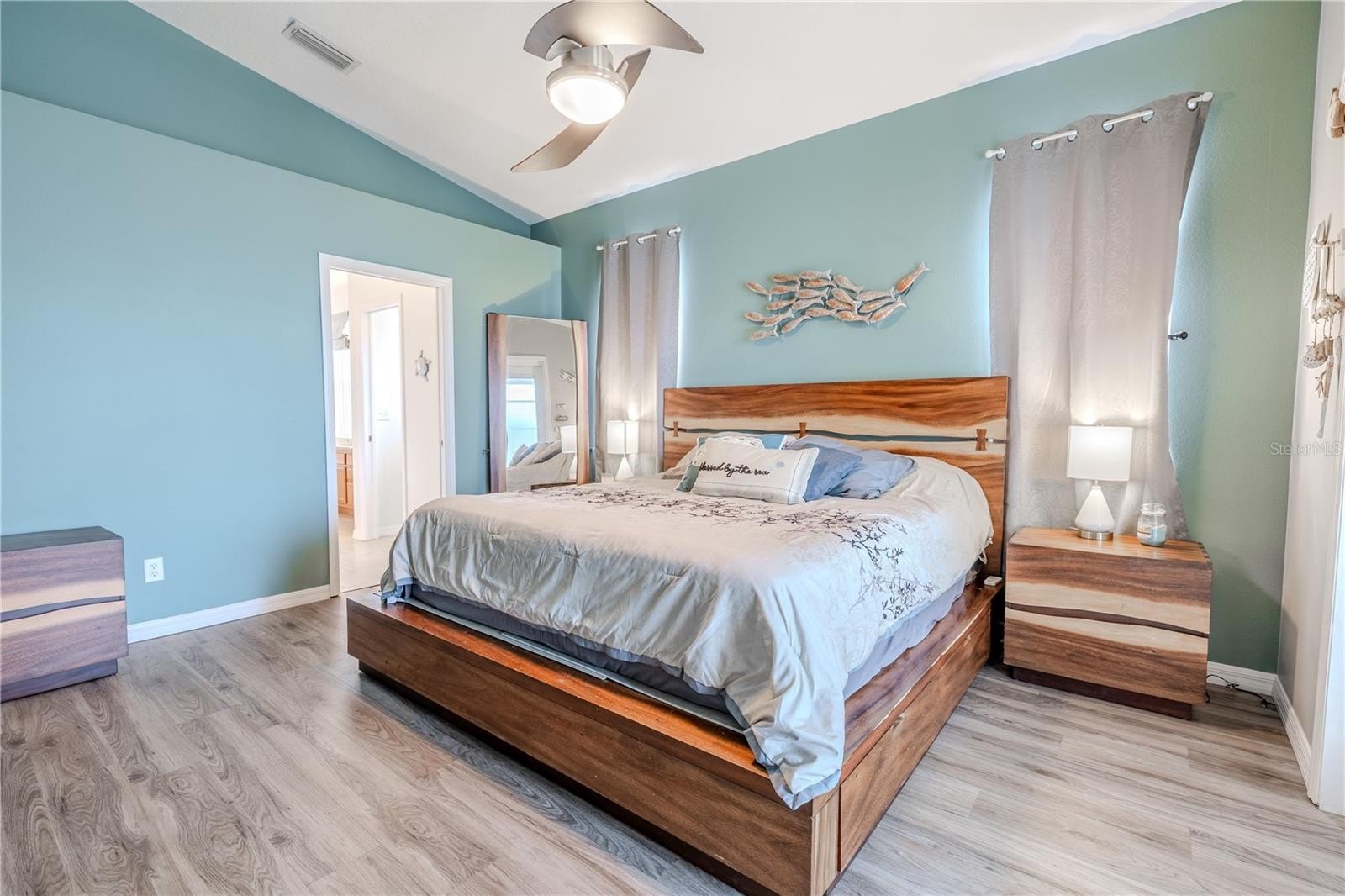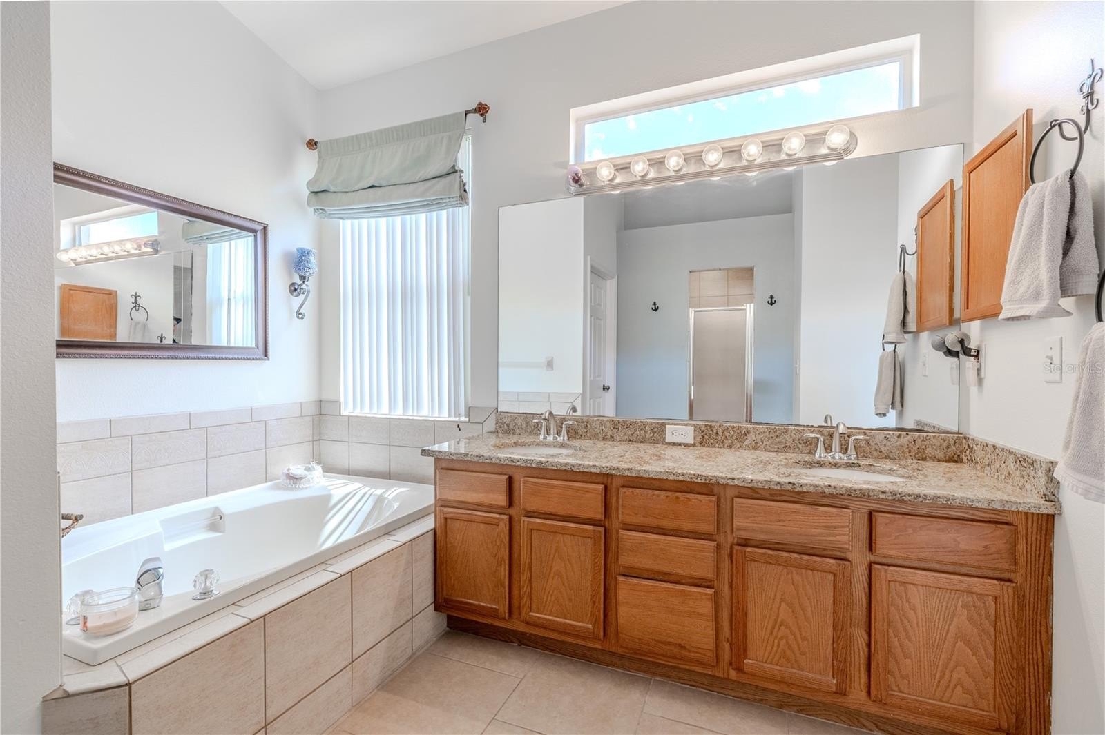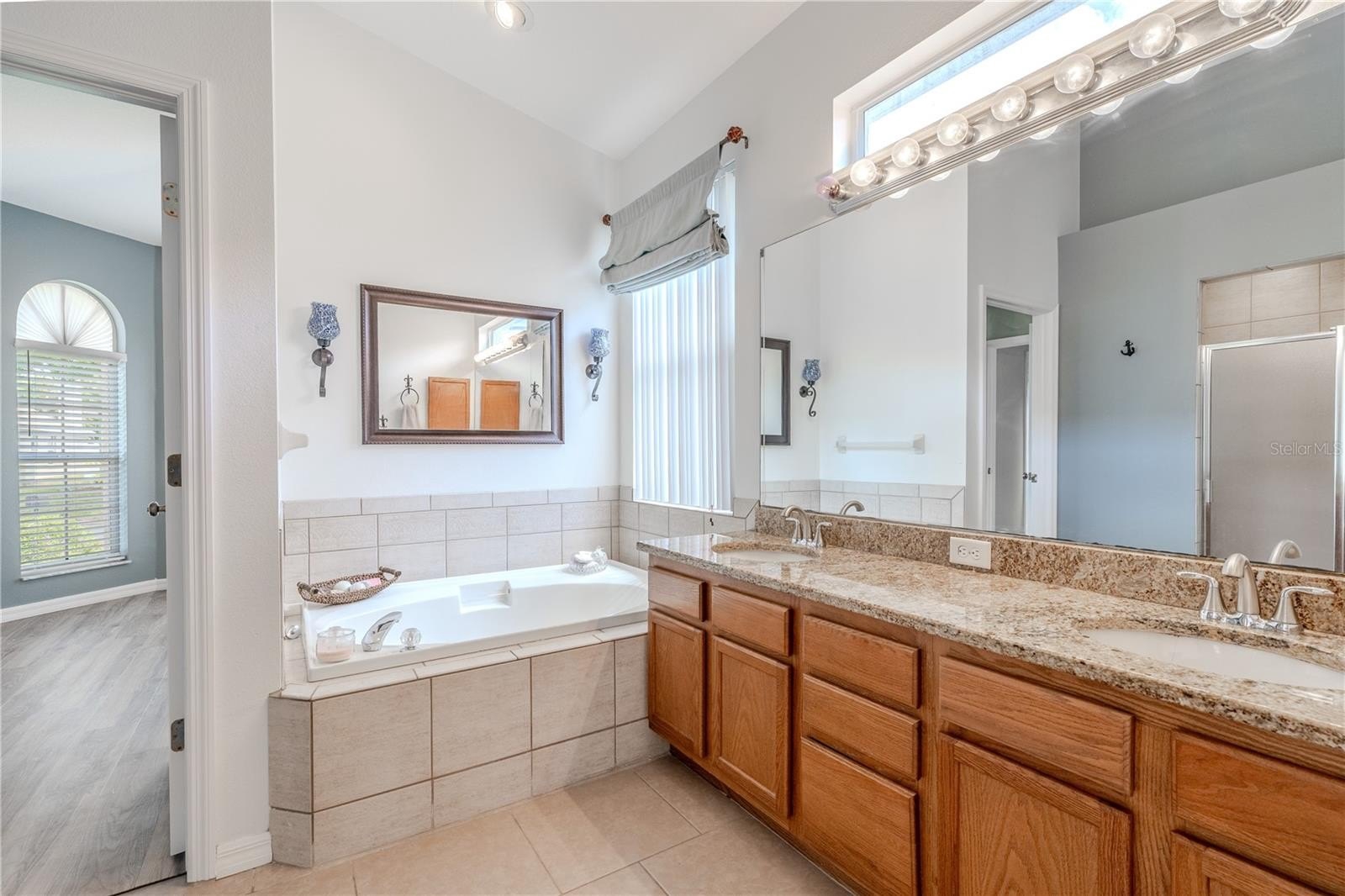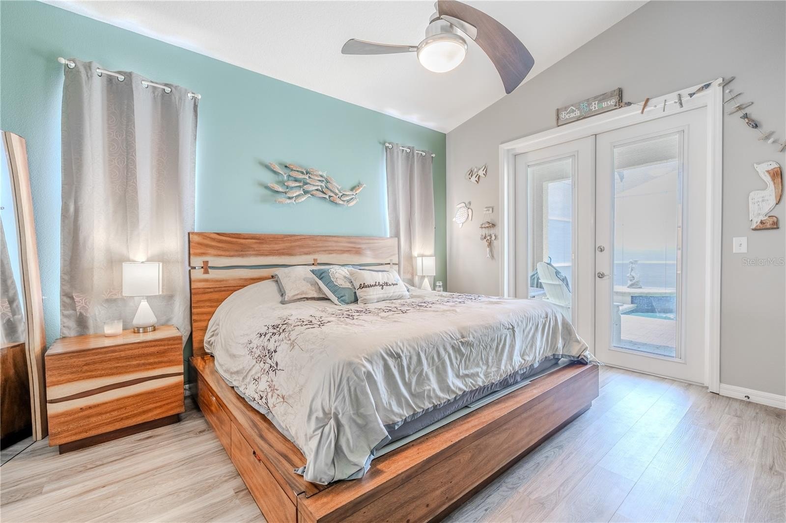 The split floor plan offers privacy, with the spacious primary suite tucked away at the back of the home. It features high ceilings, vinyl flooring, a modern ceiling fan, and French doors that open to the lanai and pool. The en-suite bath feels like a personal spa, complete with dual vanities, granite countertops, a garden soaking tub, walk-in shower, private water closet, and plenty of storage.