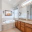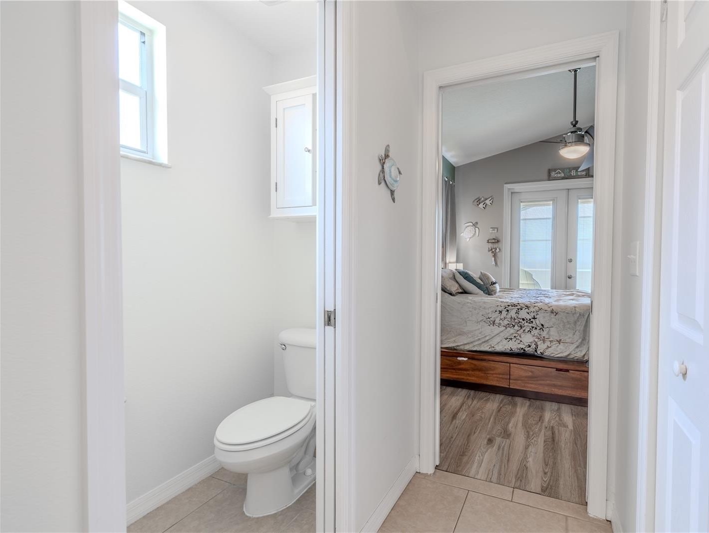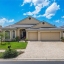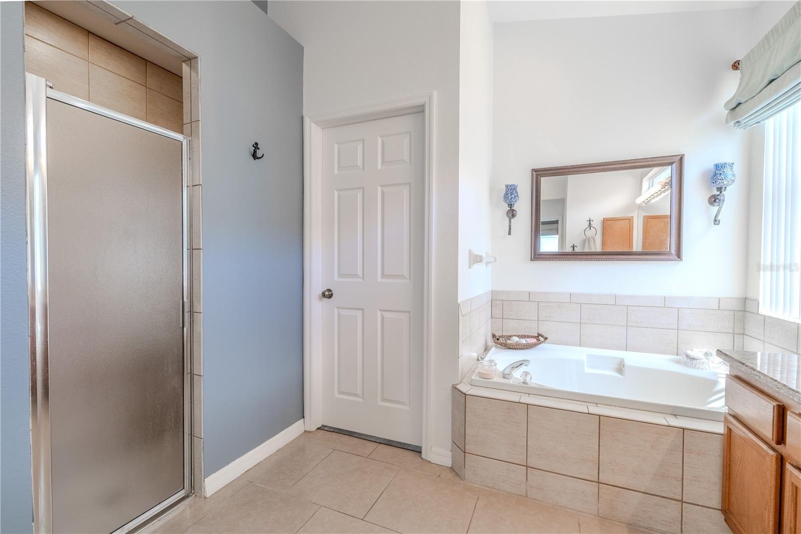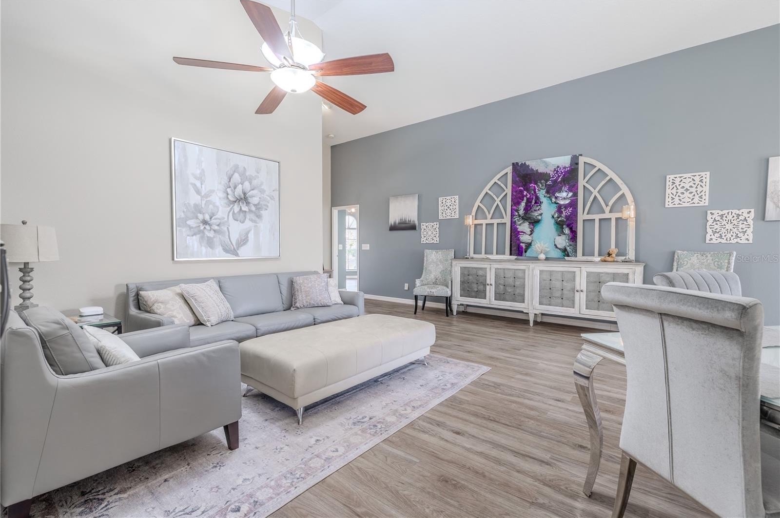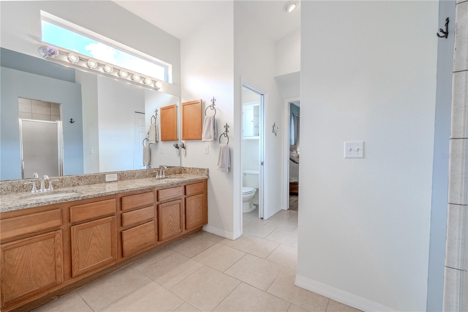 The split floor plan offers privacy, with the spacious primary suite tucked away at the back of the home. It features high ceilings, vinyl flooring, a modern ceiling fan, and French doors that open to the lanai and pool. The en-suite bath feels like a personal spa, complete with dual vanities, granite countertops, a garden soaking tub, walk-in shower, private water closet, and plenty of storage.