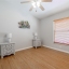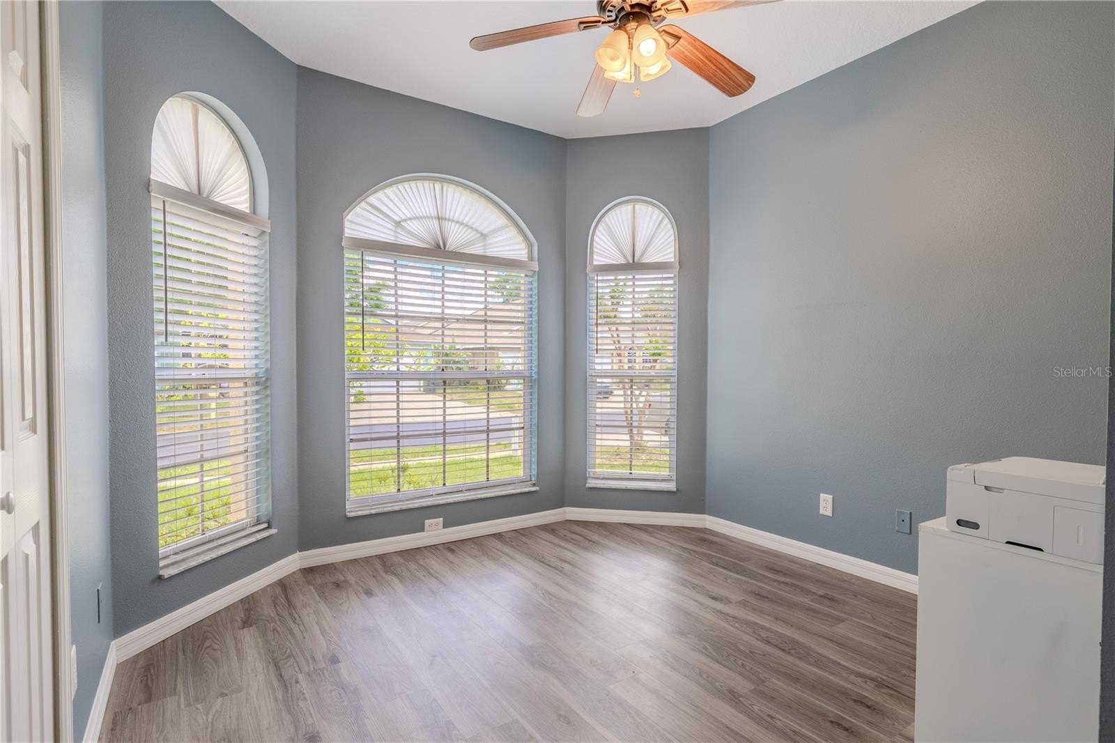 The versatile fourth bedroom shines with natural light streaming through a trio of arched windows with elegant fanlights. With high ceilings, vinyl flooring, and a built-in closet, it’s the kind of space that instantly feels special—whether used for work, guests, or play.