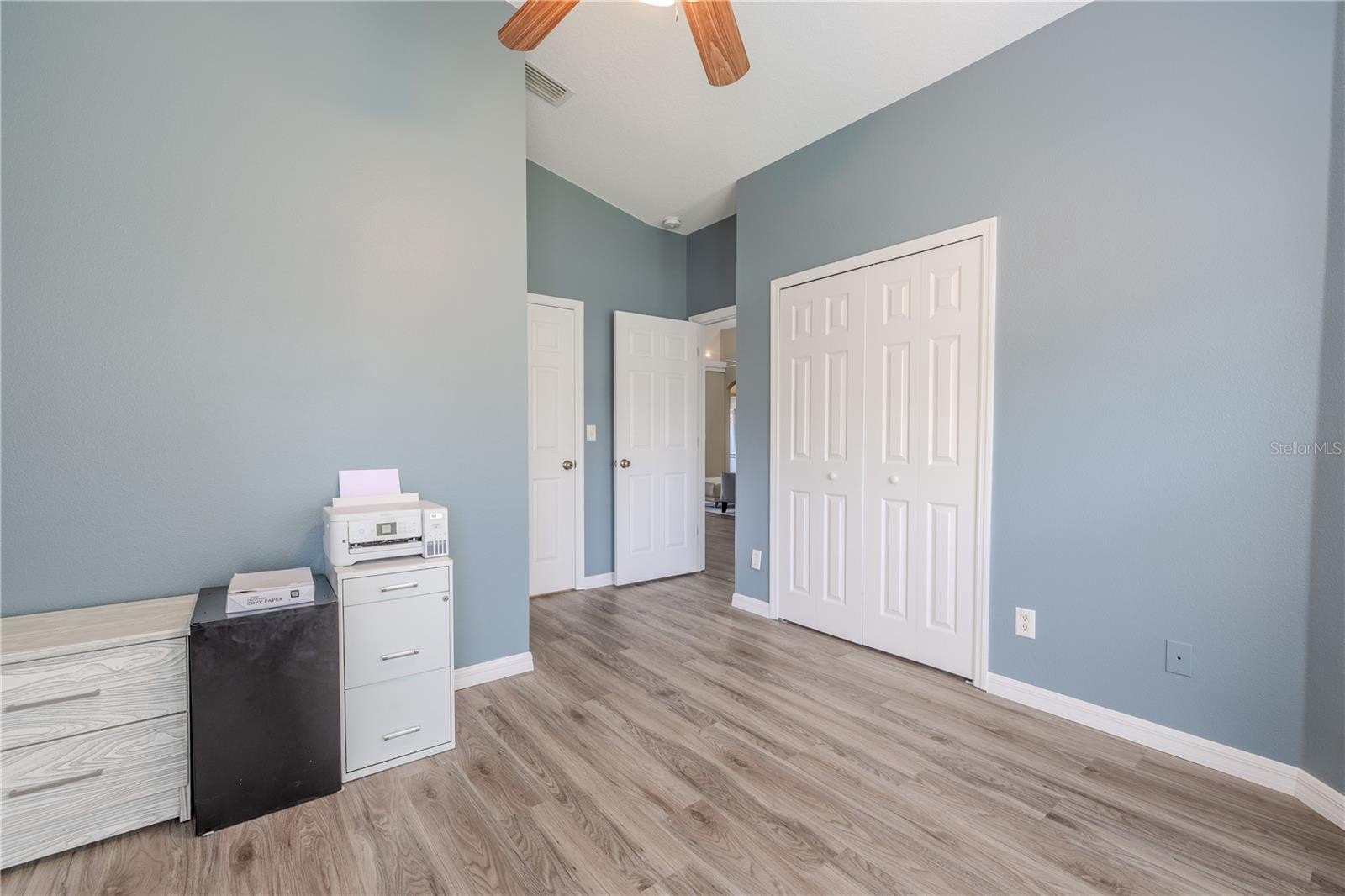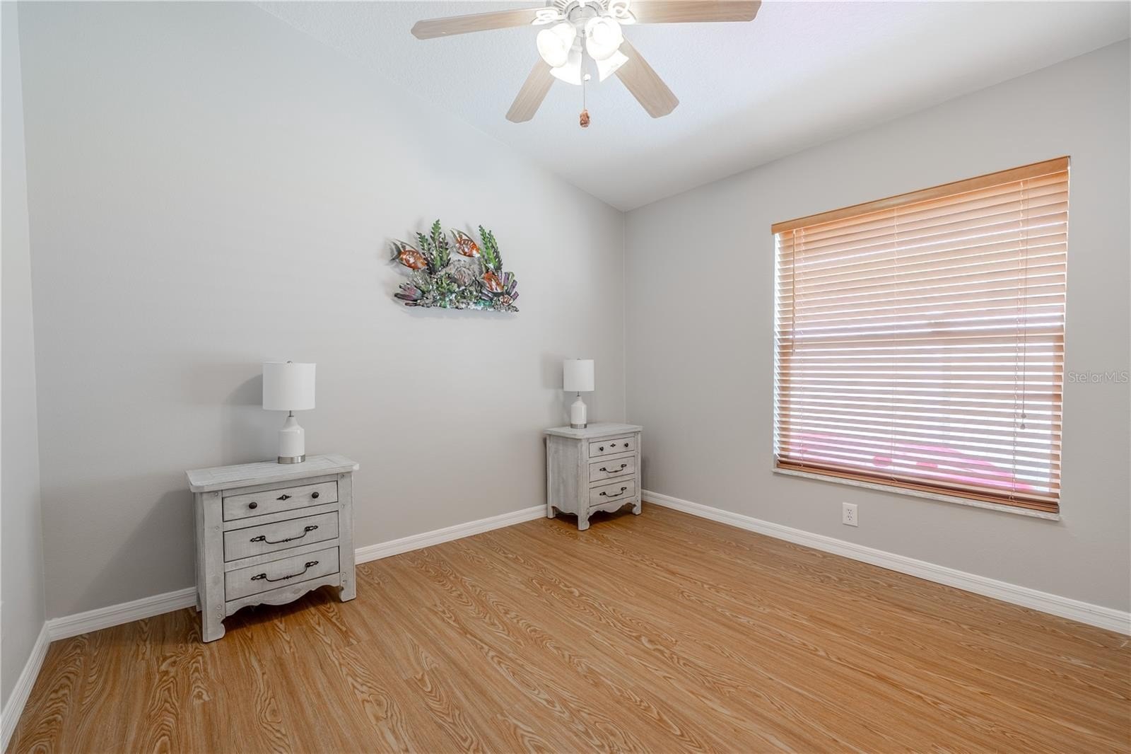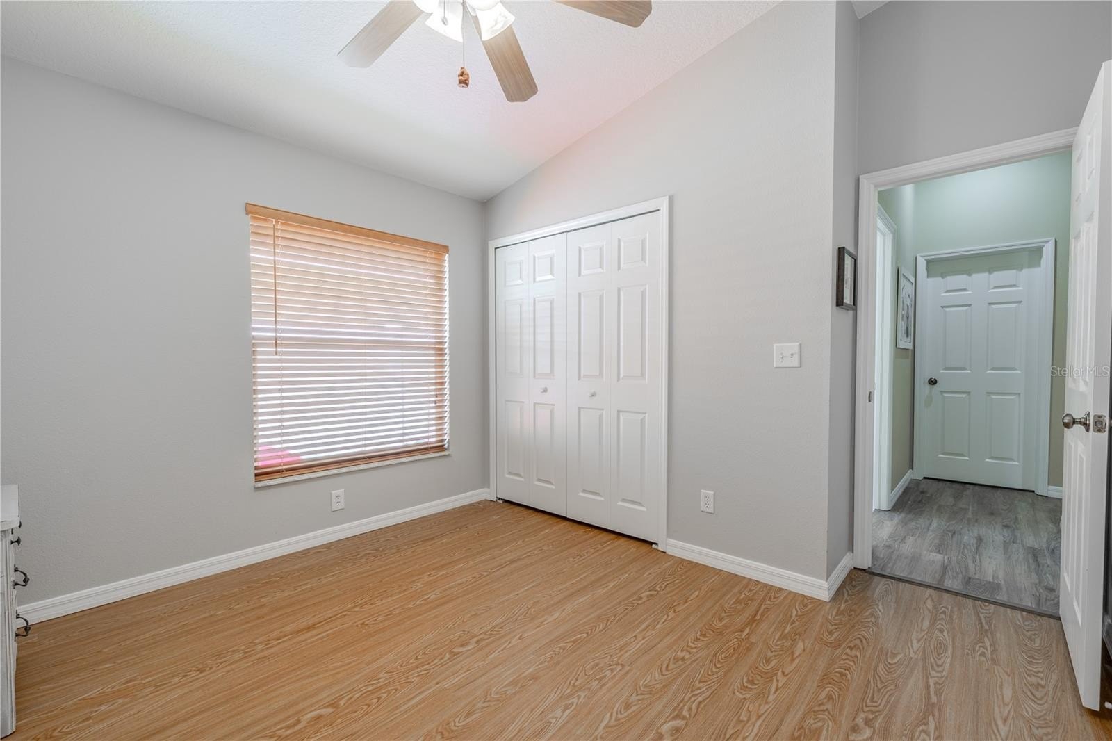 Bedrooms 2 and 3 also feature vinyl floors, built-in closets, and ceiling fans with light kits.