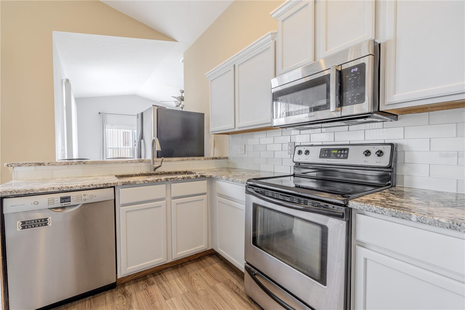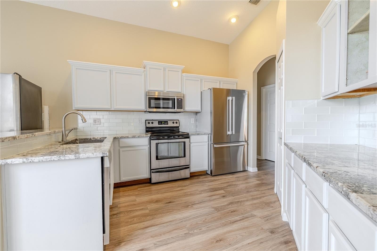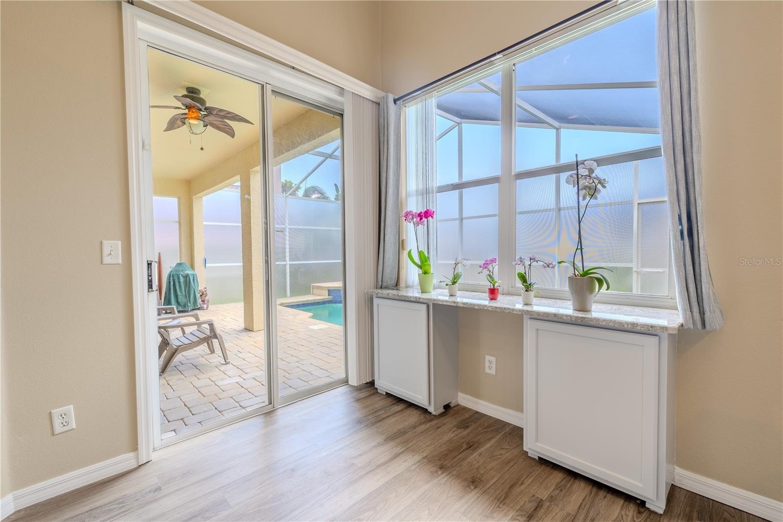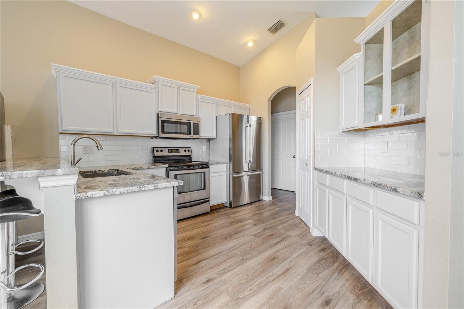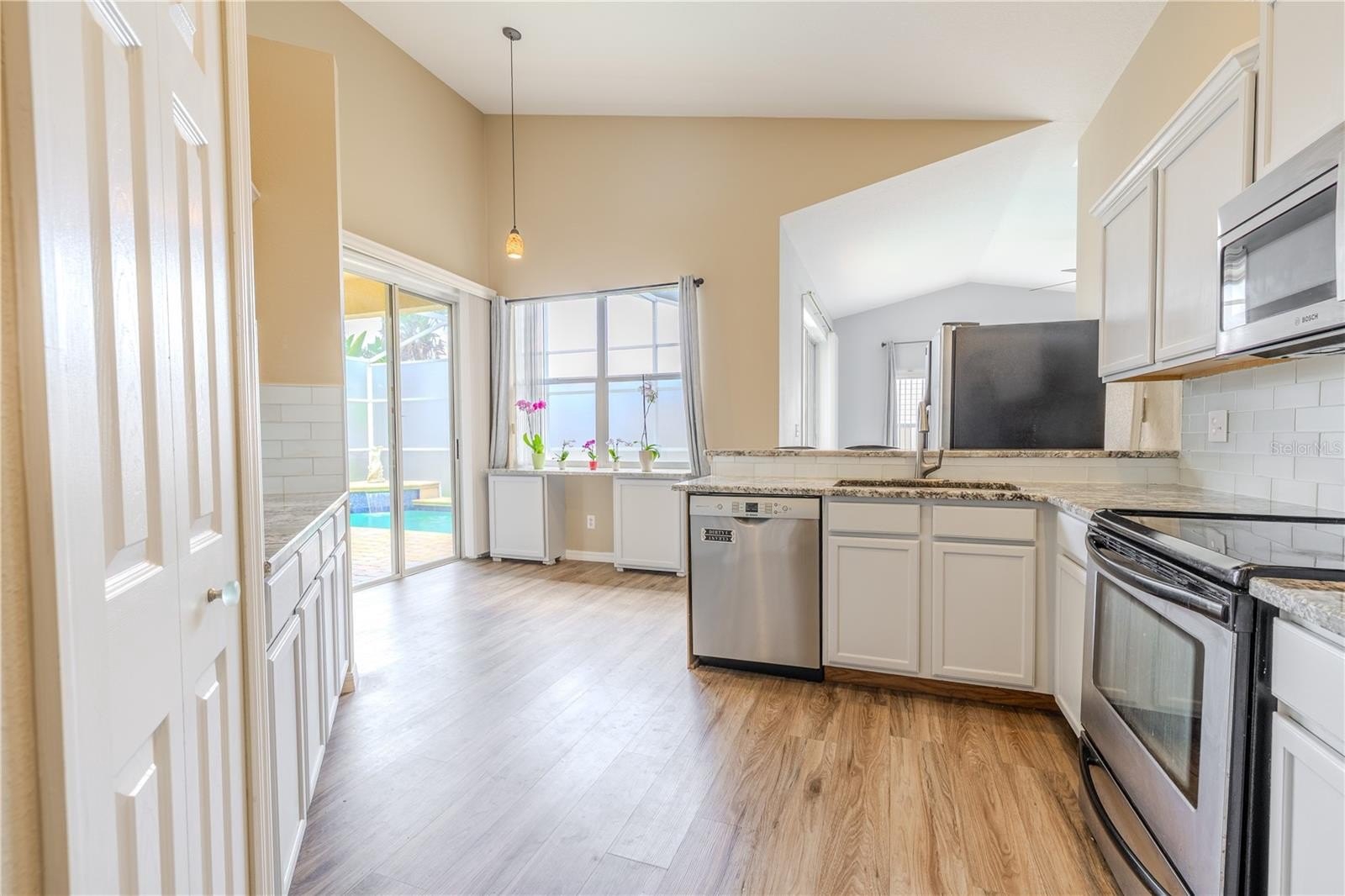 The kitchen ifeatures a full suite of stainless steel appliances including a French door refrigerator, range, microwave, and dishwasher. You’ll love the warm wood cabinetry, granite counters, recessed lighting, closet pantry, and a dedicated coffee bar area with open shelving. There’s even a cozy breakfast nook that overlooks the pool and opens to the lanai.