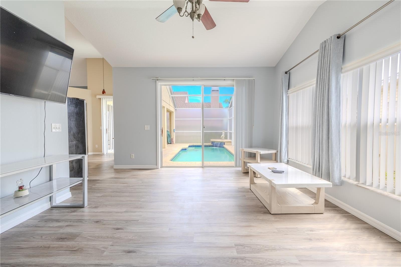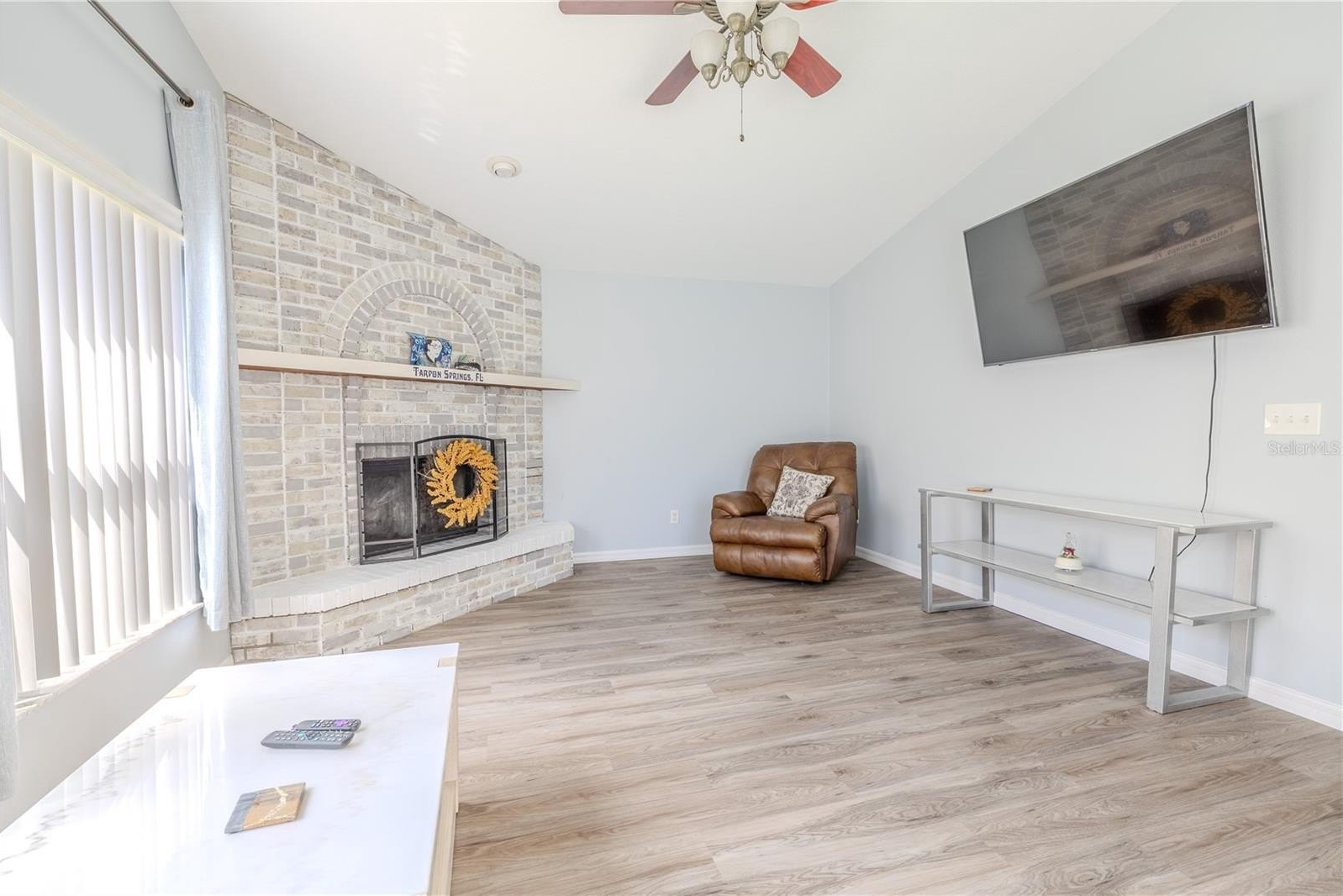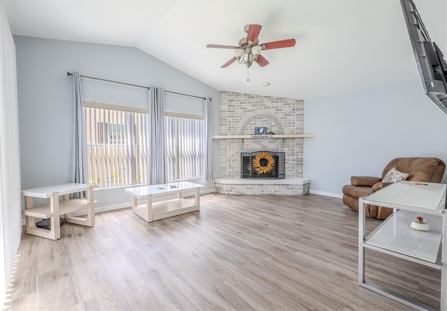 Just off the kitchen is the inviting family room—open and airy with vinyl flooring, a neutral palette, vaulted ceilings, and a wood-burning fireplace with brick surround and hearth. Large windows and another set of sliders keep it light and breezy while connecting indoor living to the outdoor oasis.
