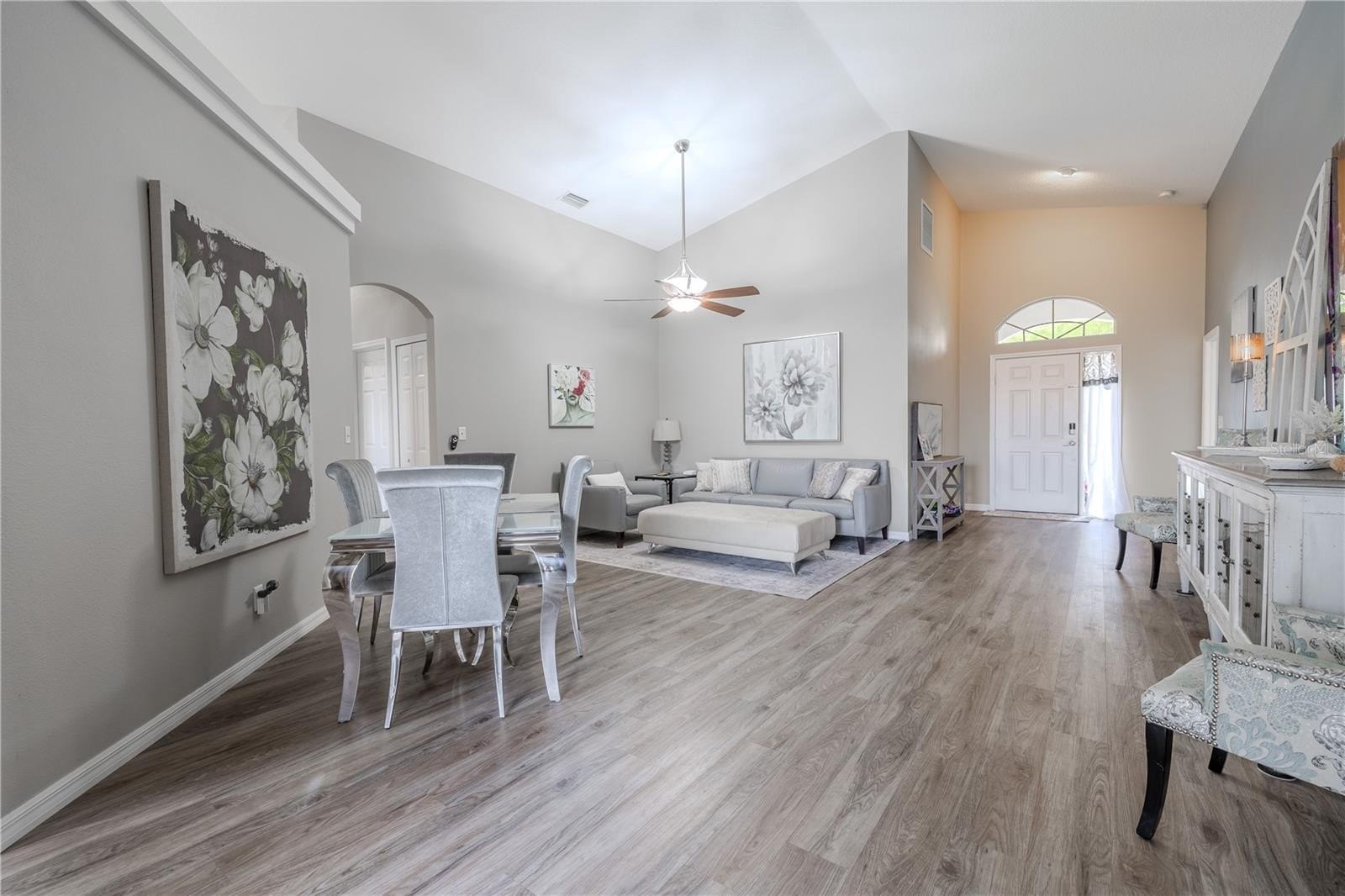 The home’s curb appeal sets the tone with its pavered driveway, manicured landscaping, arched windows, and charming covered entryway. Step inside and you’ll find a bright, spacious interior with soaring ceilings, architectural touches, and an open flow that makes everyday living – and entertaining – a breeze.