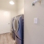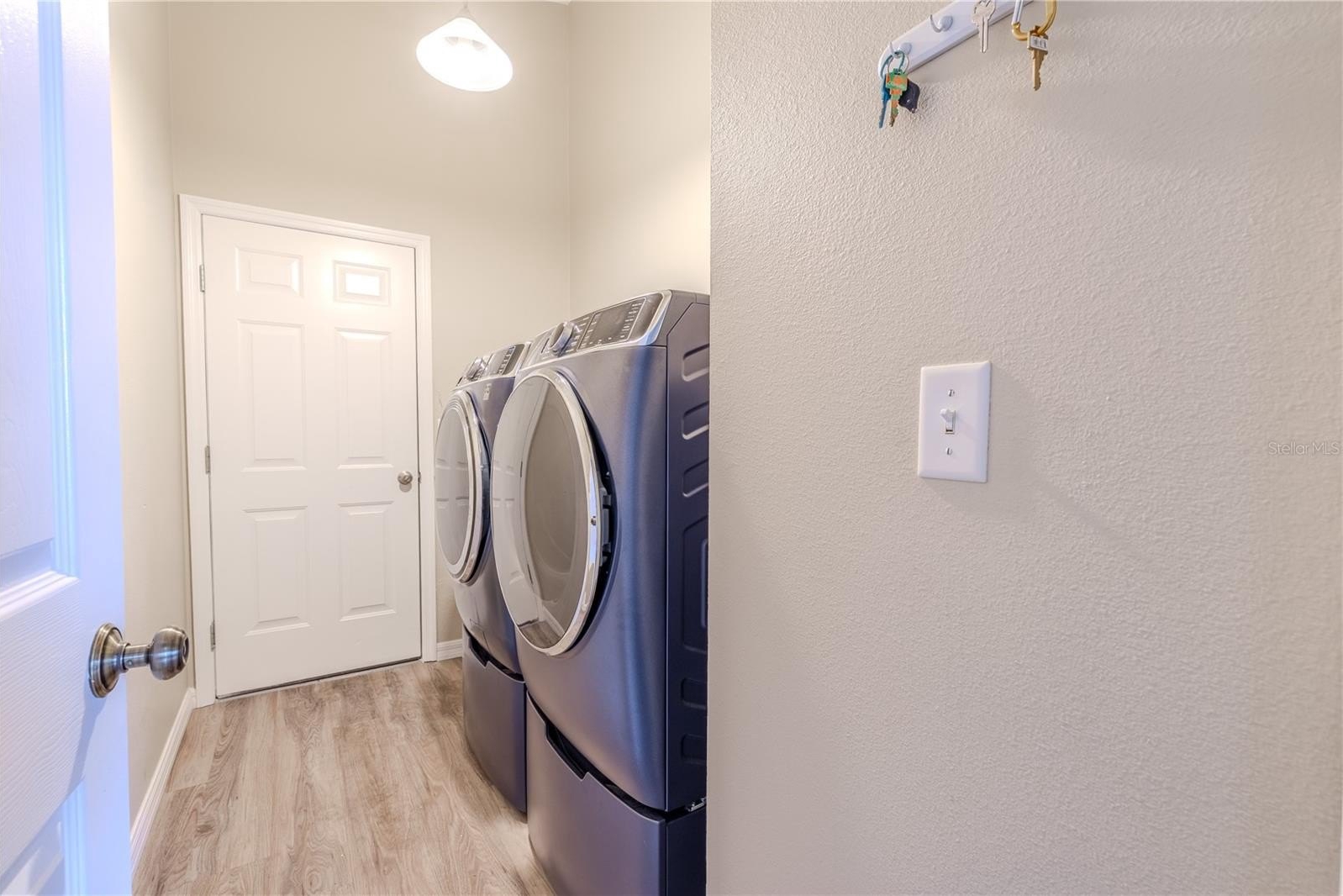 The laundry room offers convenience with a front-load washer and dryer, vinyl flooring, and access to the spacious 3-car garage.