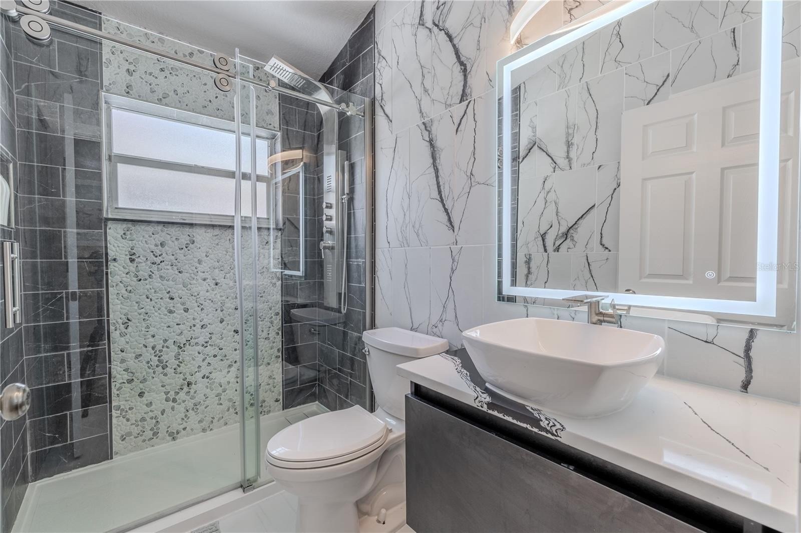 Bathroom 2 is a showstopper—fully updated with a spa-inspired design that includes a river rock-accented walk-in shower, rainfall shower tower, charcoal tile, a vessel sink, quartz vanity, and an LED backlit mirror for that perfect glow.