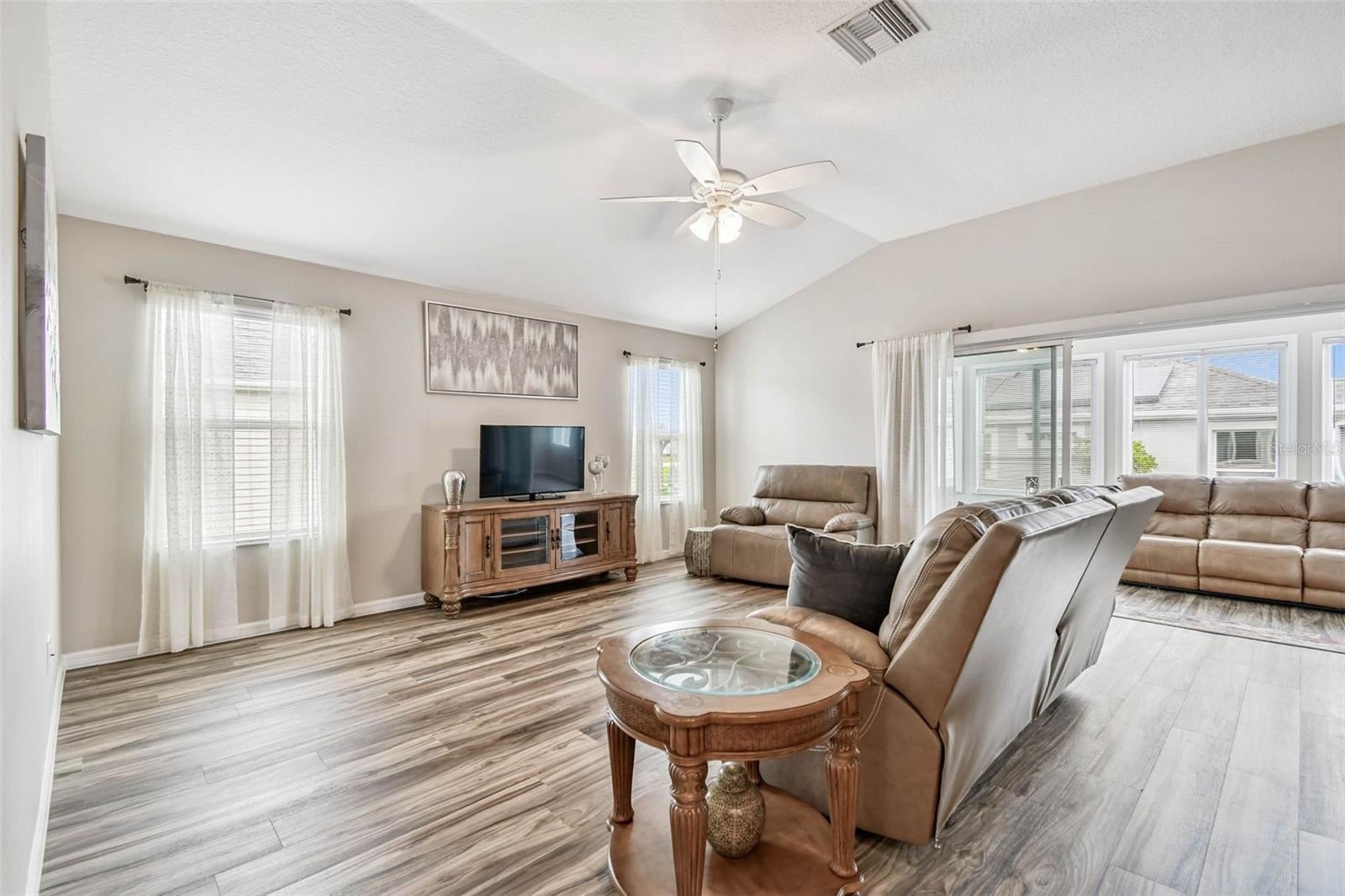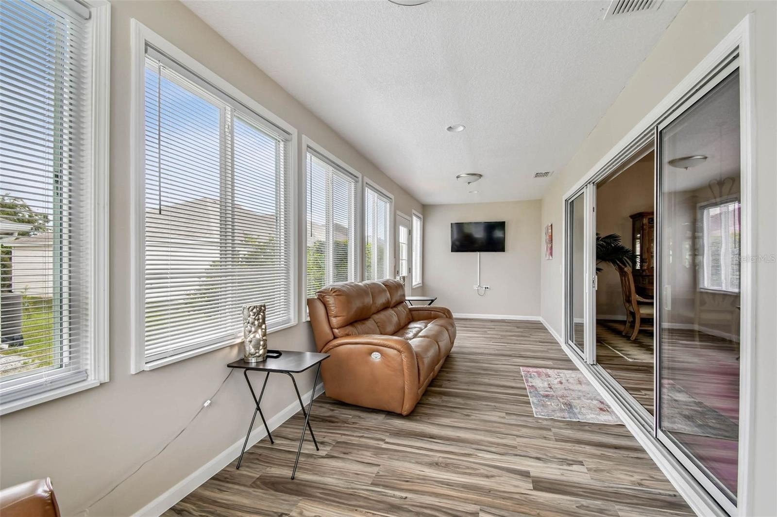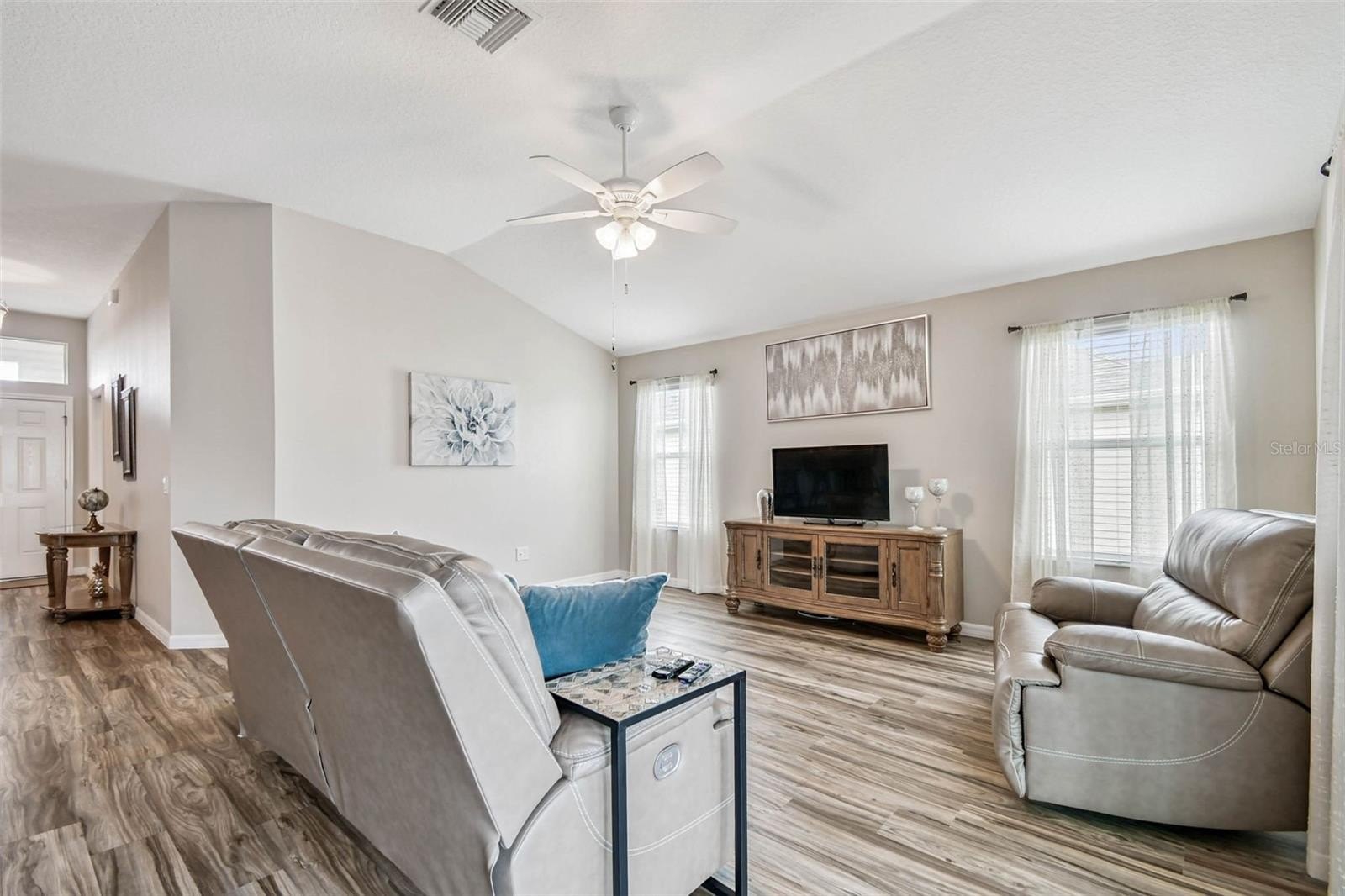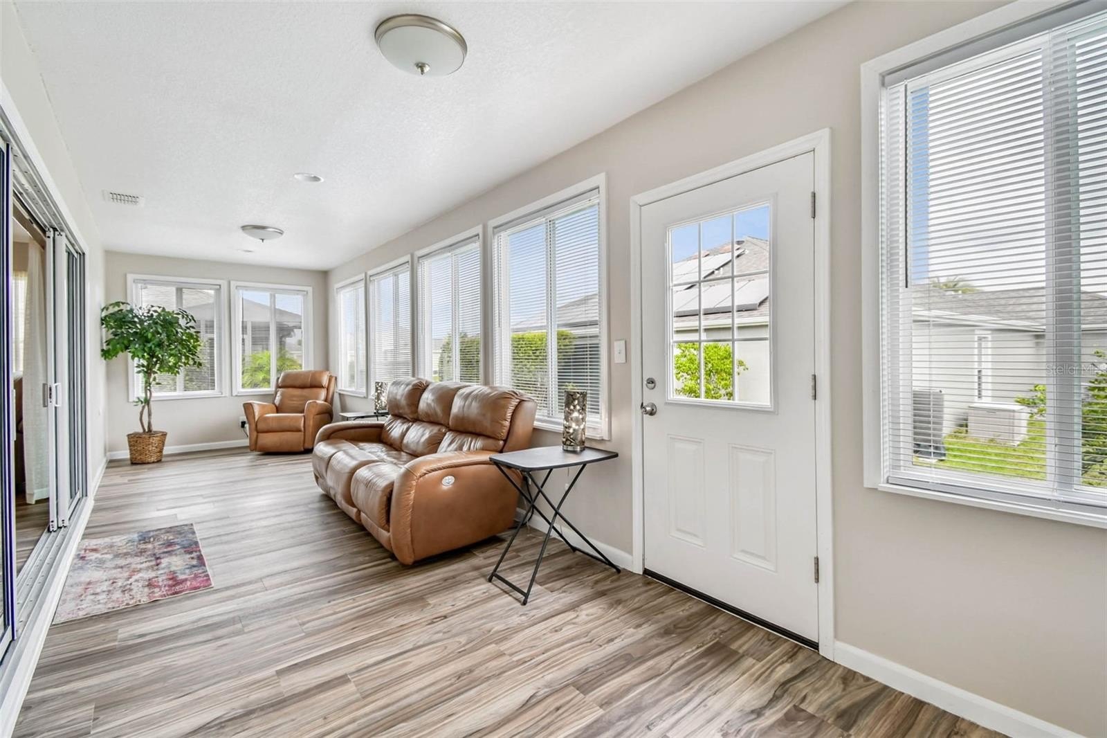 Curb appeal shines with an expanded driveway, rock beds, concrete curbing, gutters, mature upgraded landscaping, Zoysia sod, and a covered front entry. Inside, luxury vinyl flooring runs throughout with carpet only in the primary suite. The open floor plan extends into an enclosed and finished 28' x 9' temperature-controlled lanai—ideal for an office, exercise area, or den.