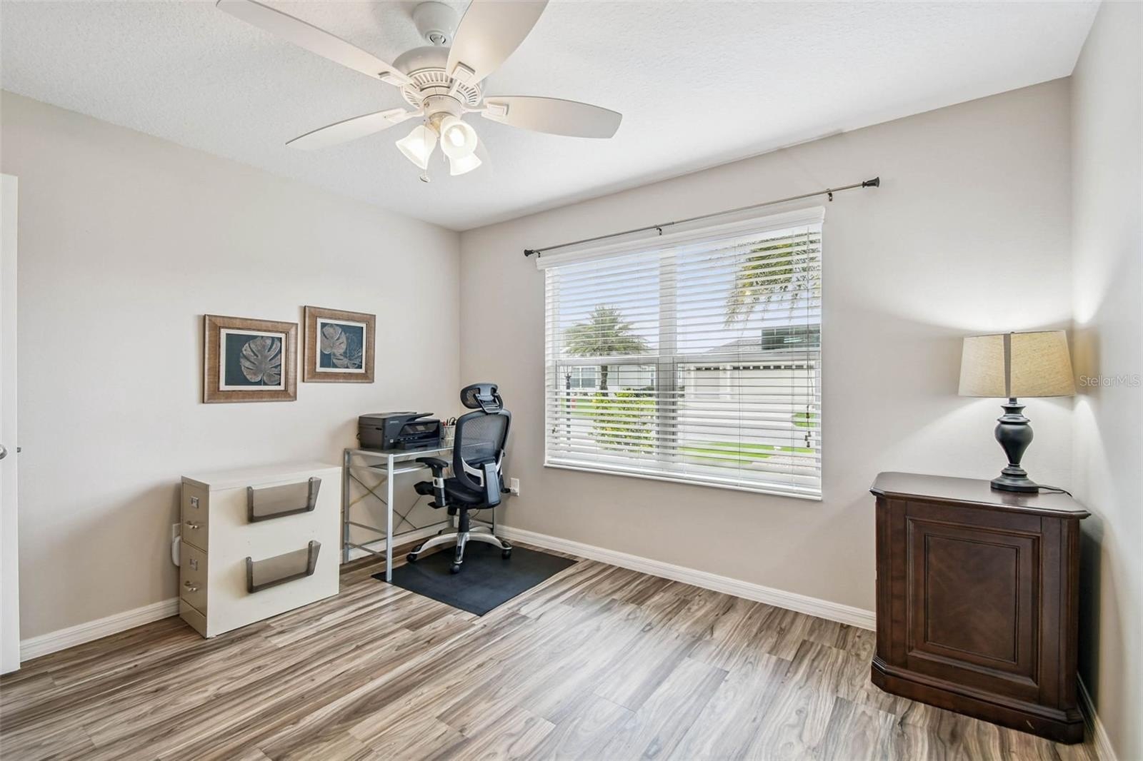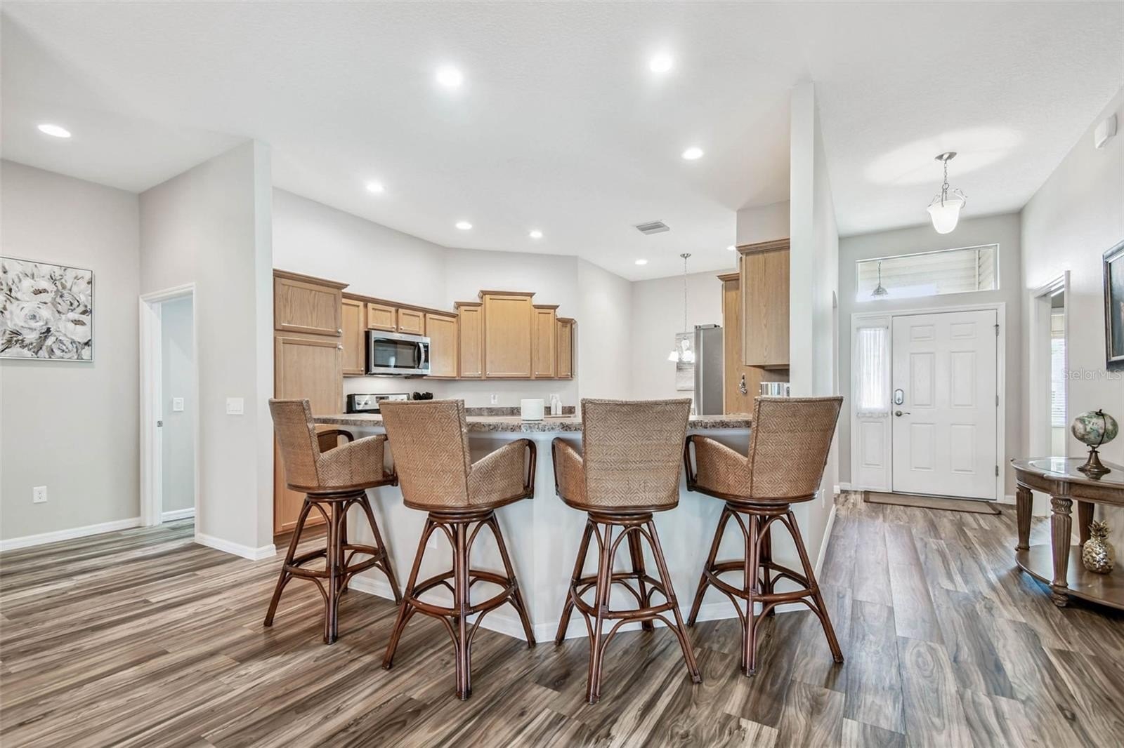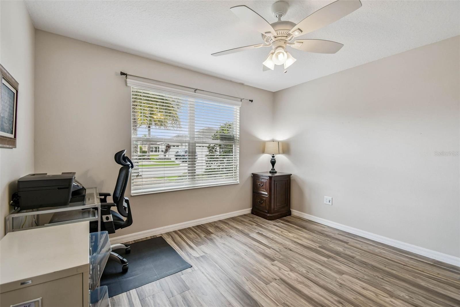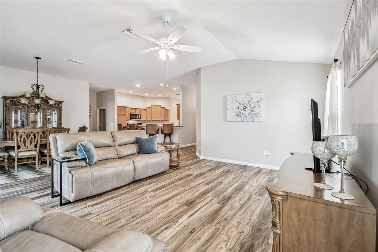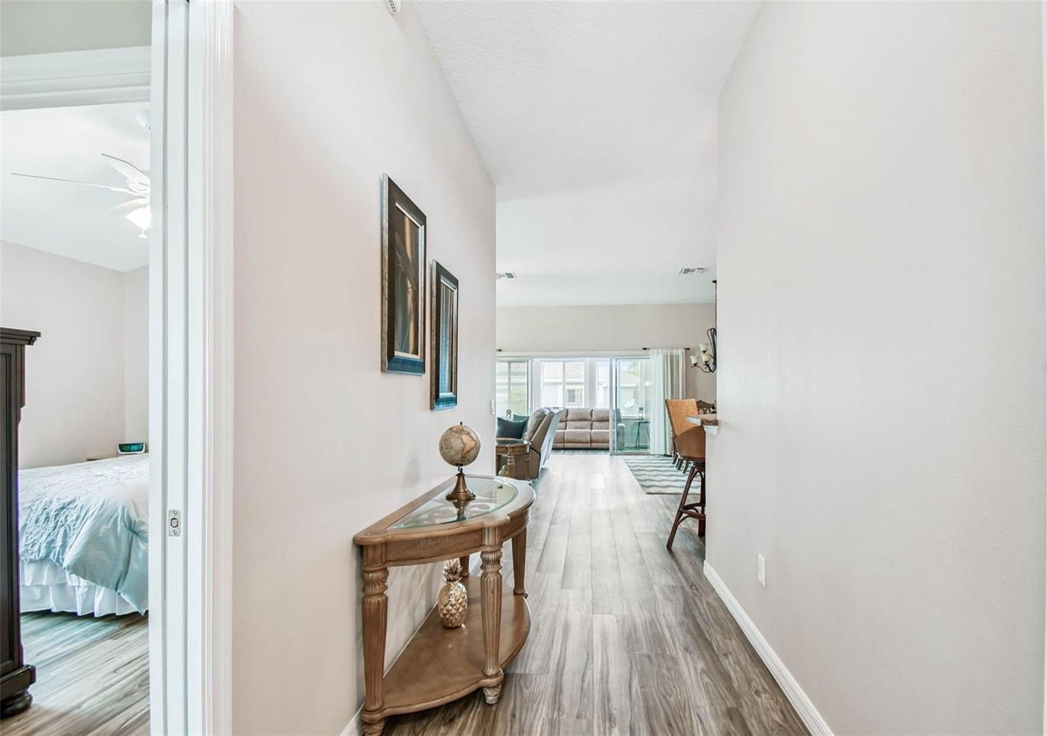 Curb appeal shines with an expanded driveway, rock beds, concrete curbing, gutters, mature upgraded landscaping, Zoysia sod, and a covered front entry. Inside, luxury vinyl flooring runs throughout with carpet only in the primary suite. The open floor plan extends into an enclosed and finished 28' x 9' temperature-controlled lanai—ideal for an office, exercise area, or den.