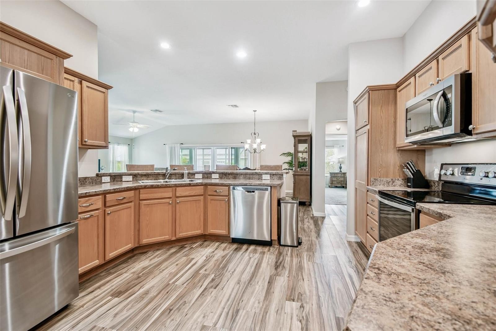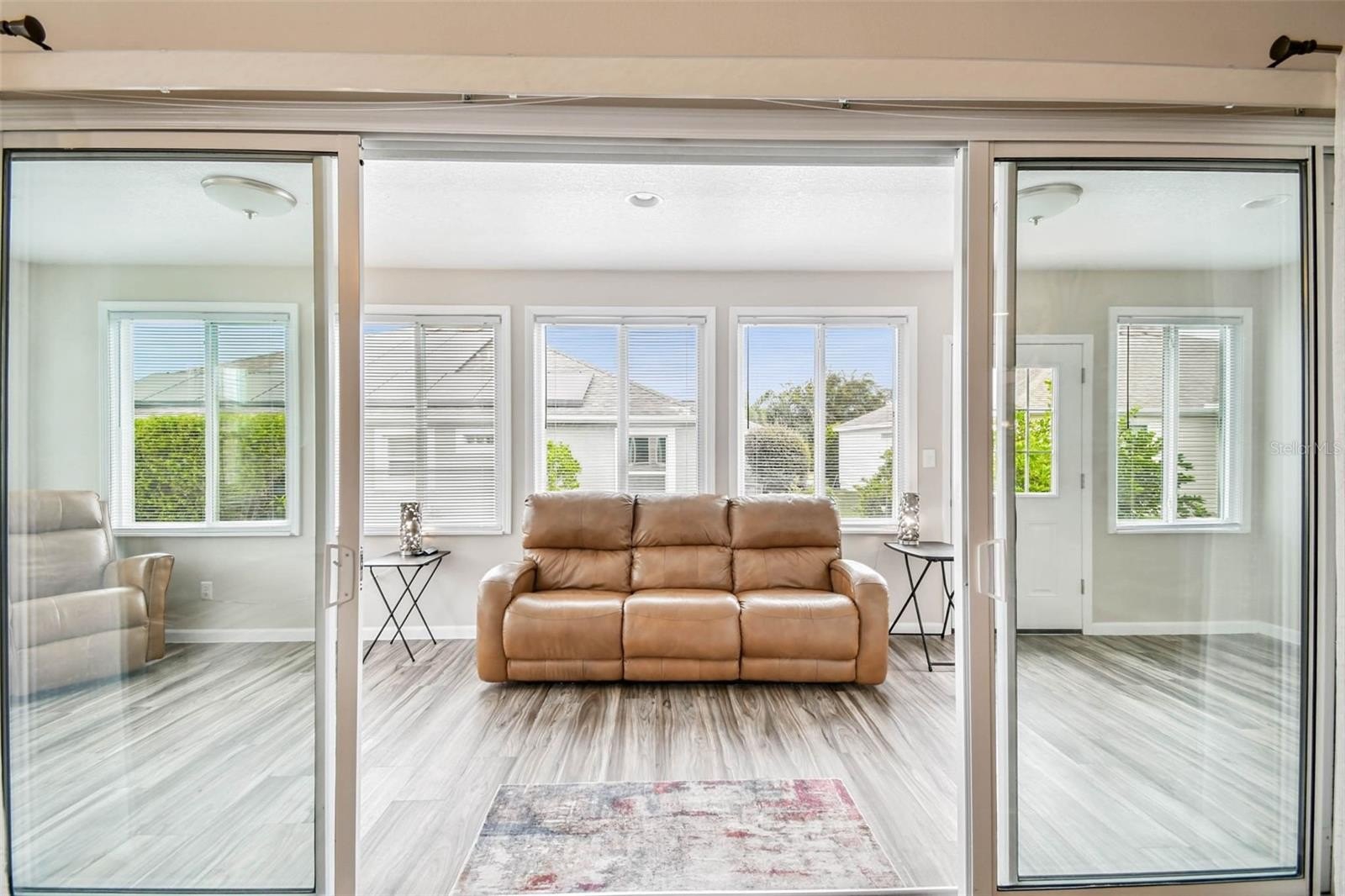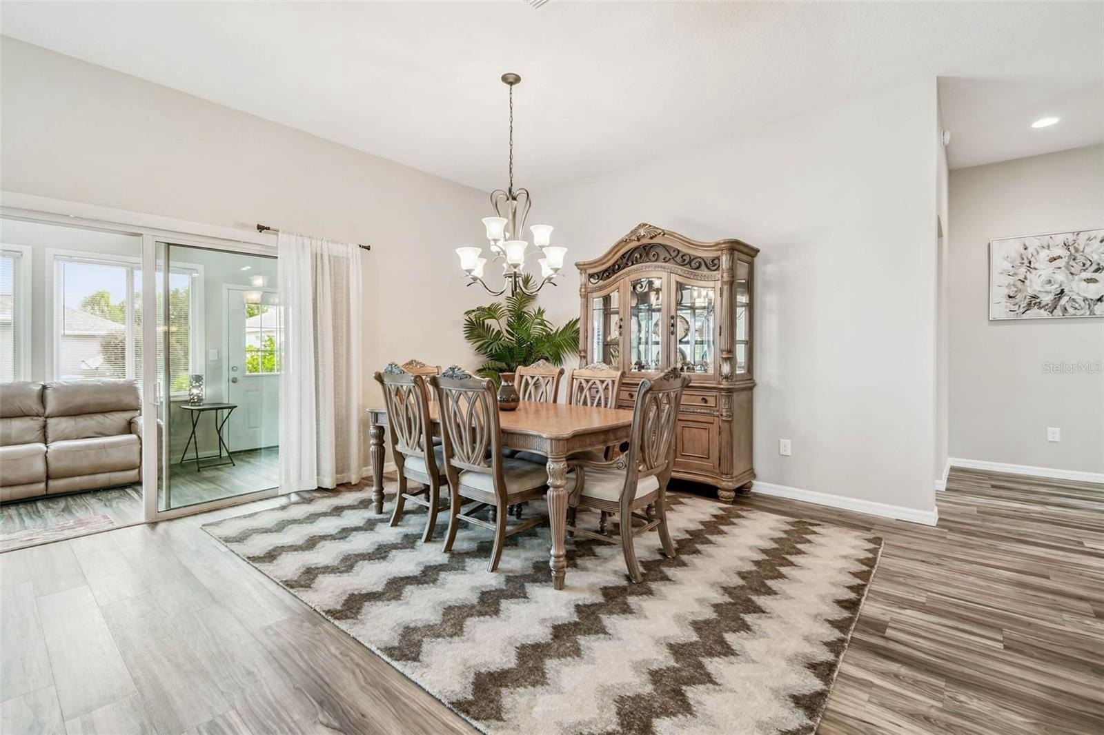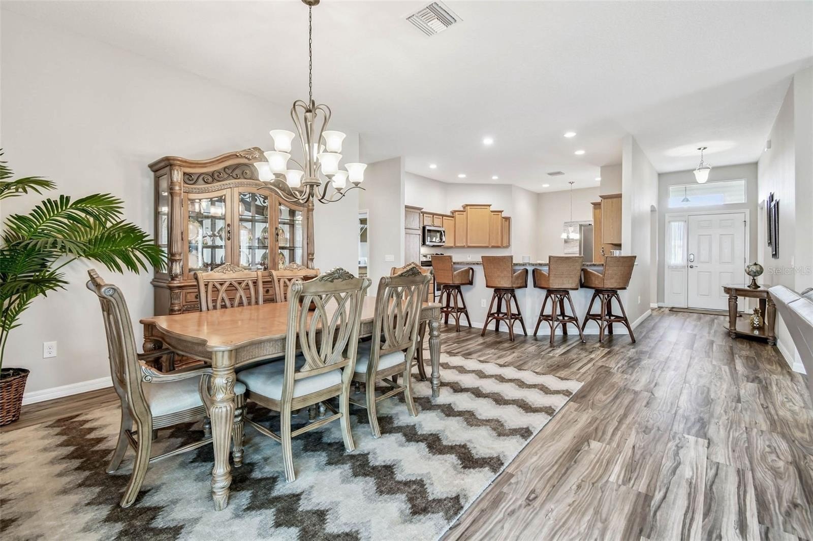Curb appeal shines with an expanded driveway, rock beds, concrete curbing, gutters, mature upgraded landscaping, Zoysia sod, and a covered front entry. Inside, luxury vinyl flooring runs throughout with carpet only in the primary suite. The open floor plan extends into an enclosed and finished 28' x 9' temperature-controlled lanai—ideal for an office, exercise area, or den.