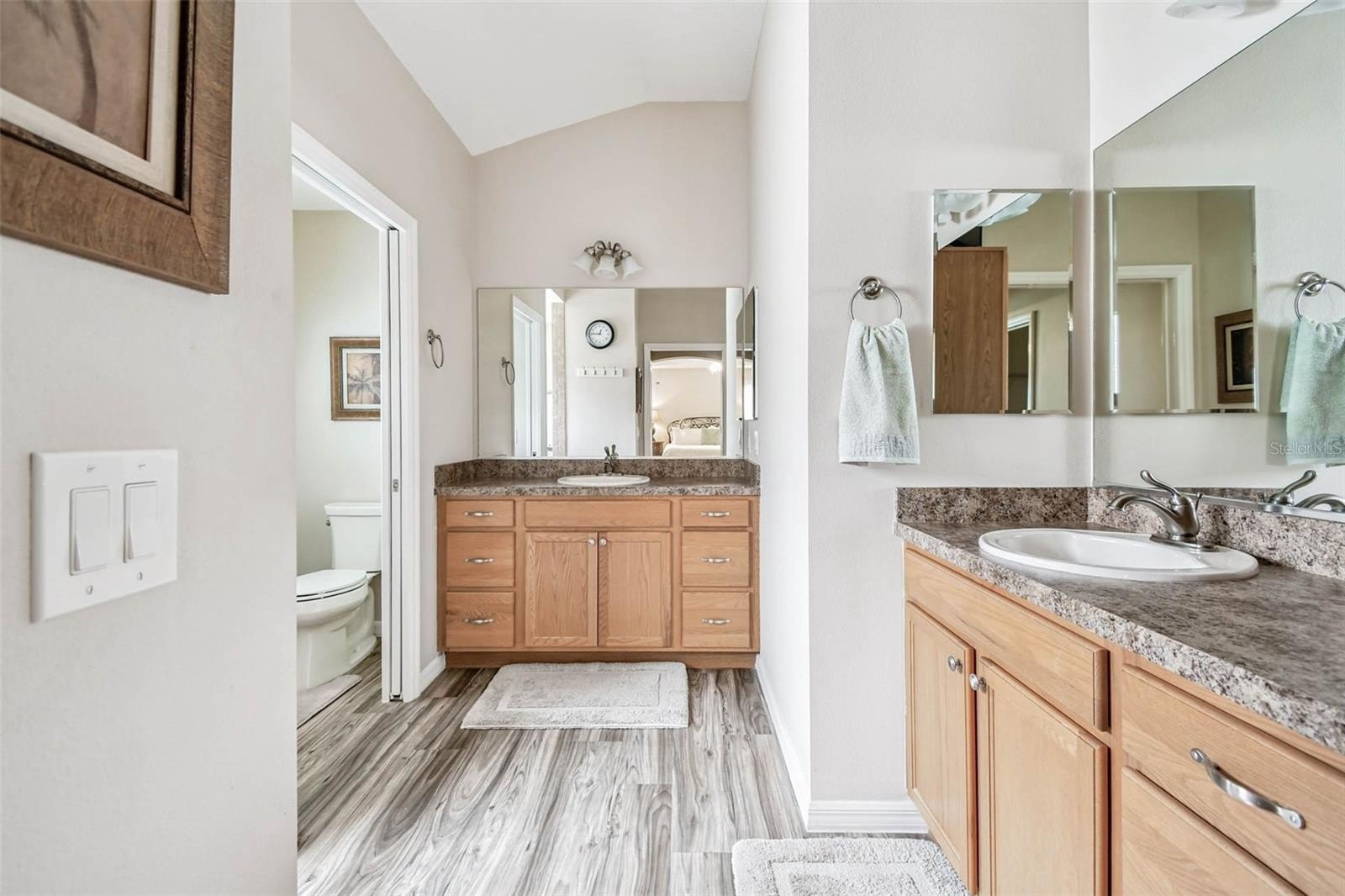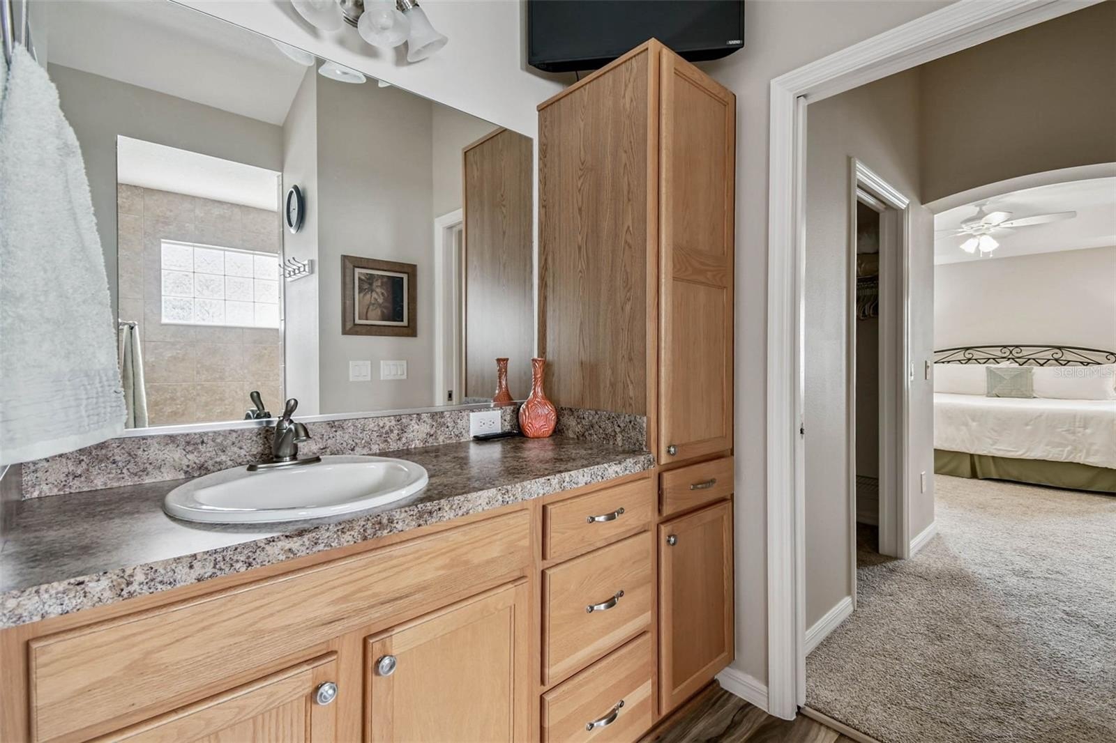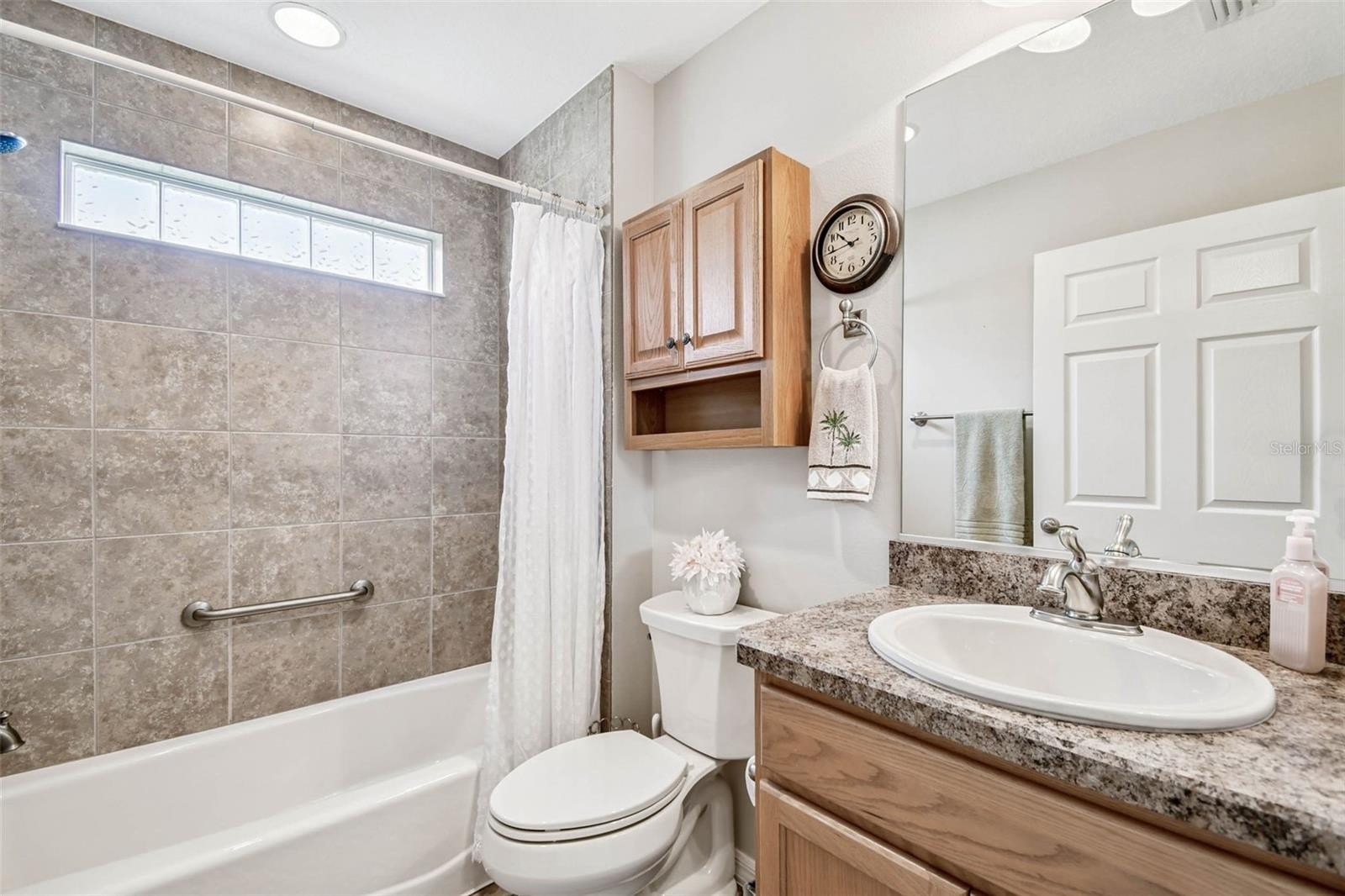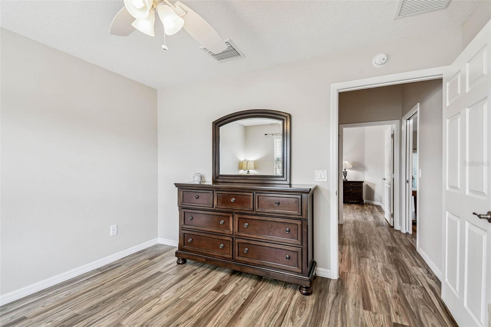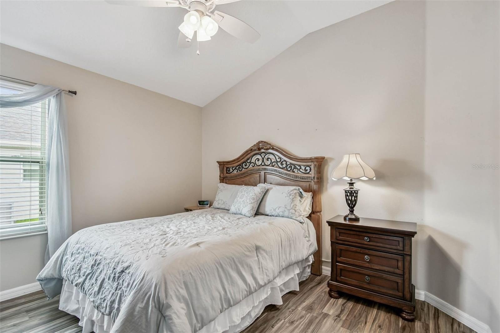 Curb appeal shines with an expanded driveway, rock beds, concrete curbing, gutters, mature upgraded landscaping, Zoysia sod, and a covered front entry. Inside, luxury vinyl flooring runs throughout with carpet only in the primary suite. The open floor plan extends into an enclosed and finished 28' x 9' temperature-controlled lanai—ideal for an office, exercise area, or den.