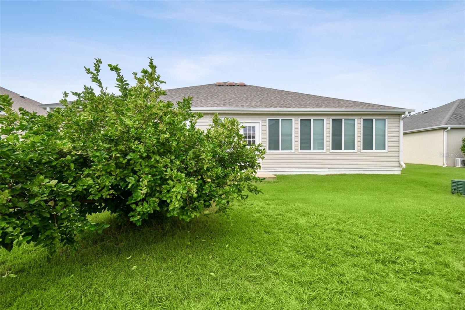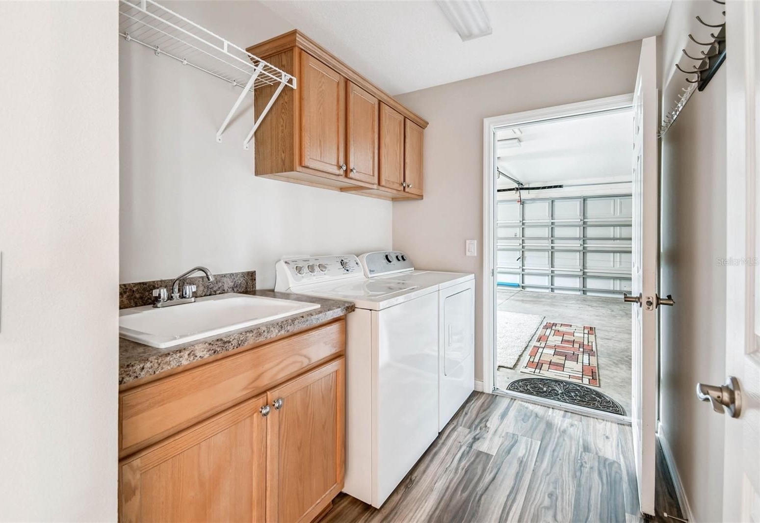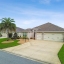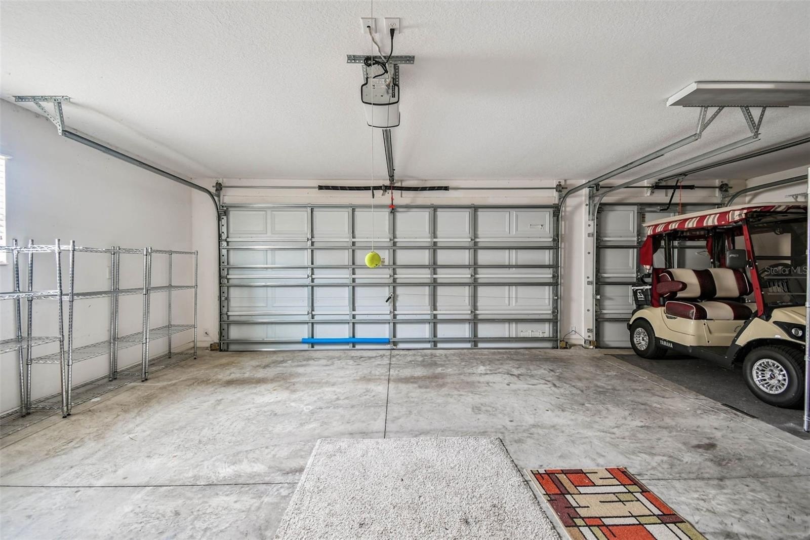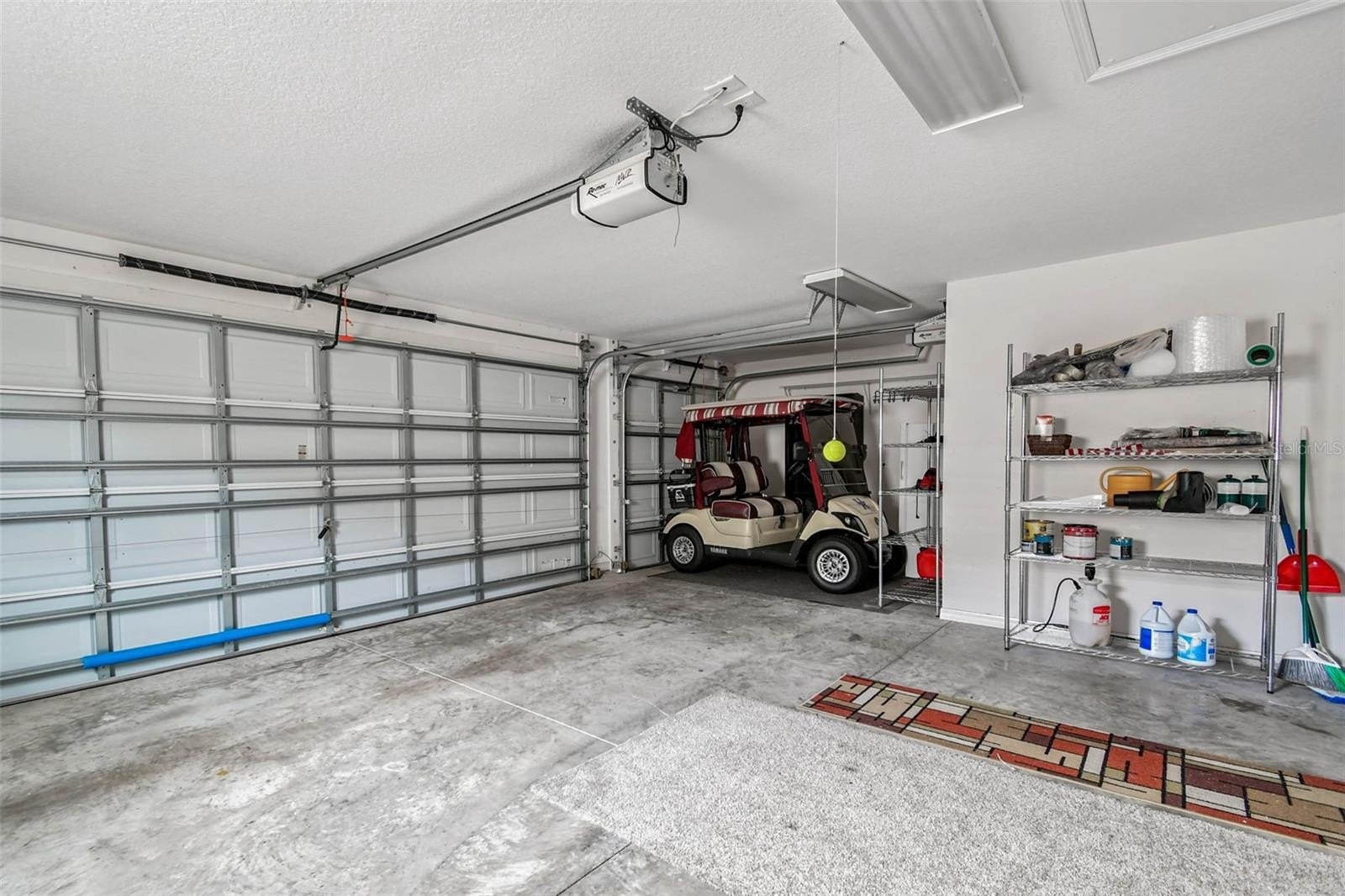 The oversized garage has room for two cars, a golf cart (golf cart negotiable), a freezer, attic stairs, and generous storage. The laundry room is fully equipped with a wash sink and cabinetry. A stackable sliding door opens the living space into the lanai, and the split-bedroom plan enhances privacy for family and guests. An irrigation system keeps the lush landscaping thriving year-round.