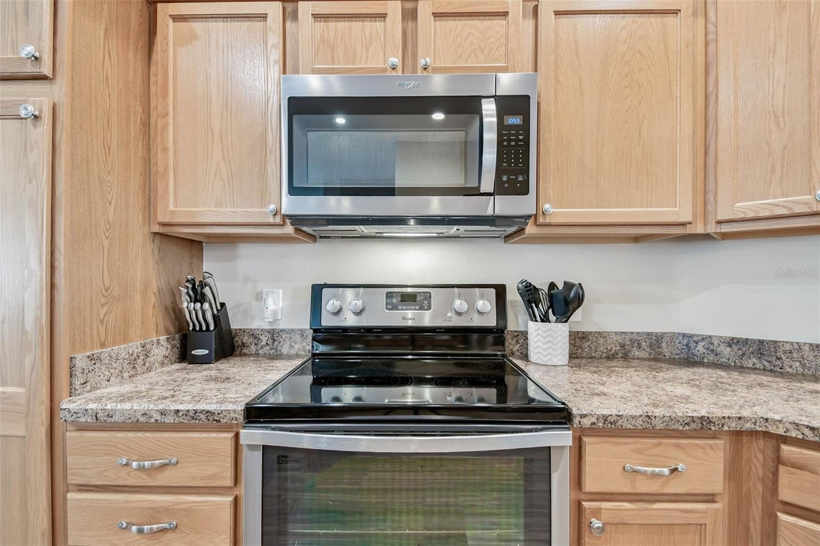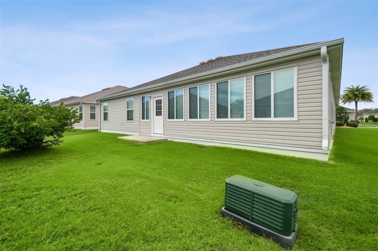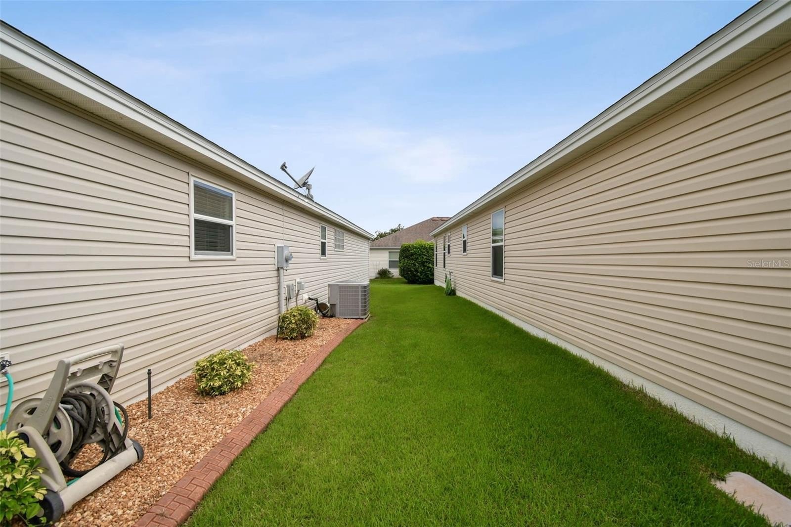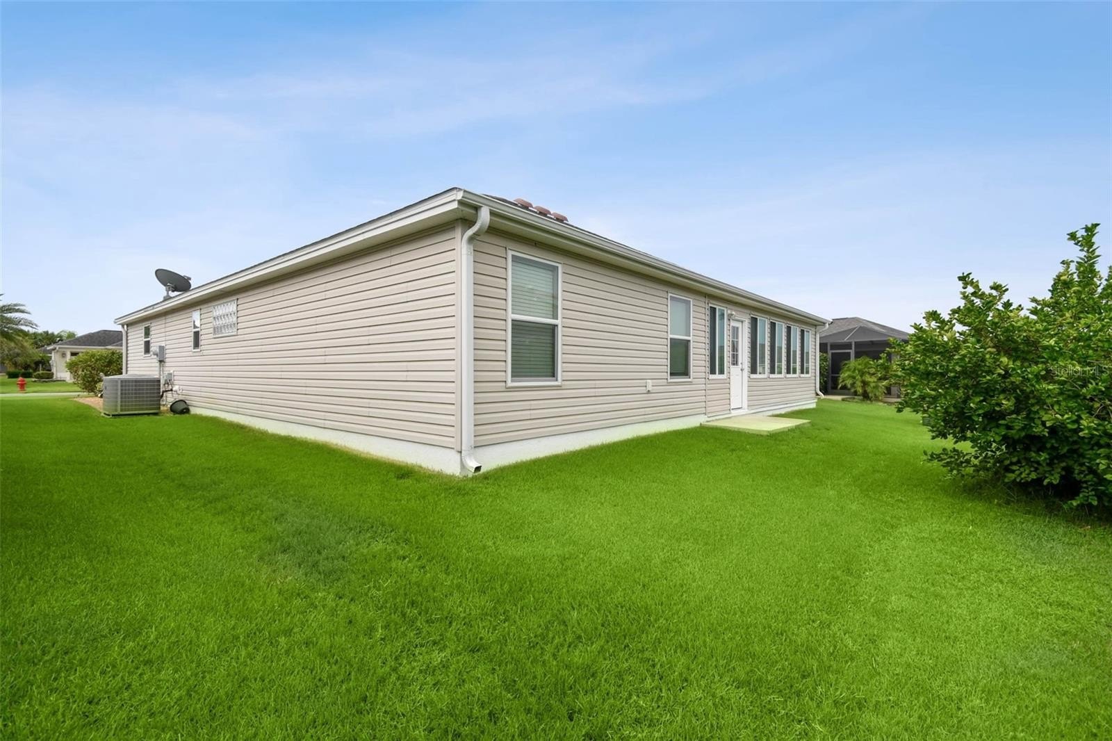 The oversized garage has room for two cars, a golf cart (golf cart negotiable), a freezer, attic stairs, and generous storage. The laundry room is fully equipped with a wash sink and cabinetry. A stackable sliding door opens the living space into the lanai, and the split-bedroom plan enhances privacy for family and guests. An irrigation system keeps the lush landscaping thriving year-round.