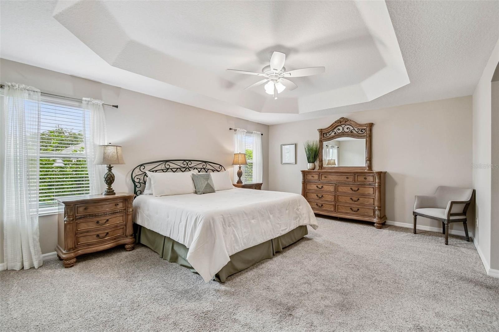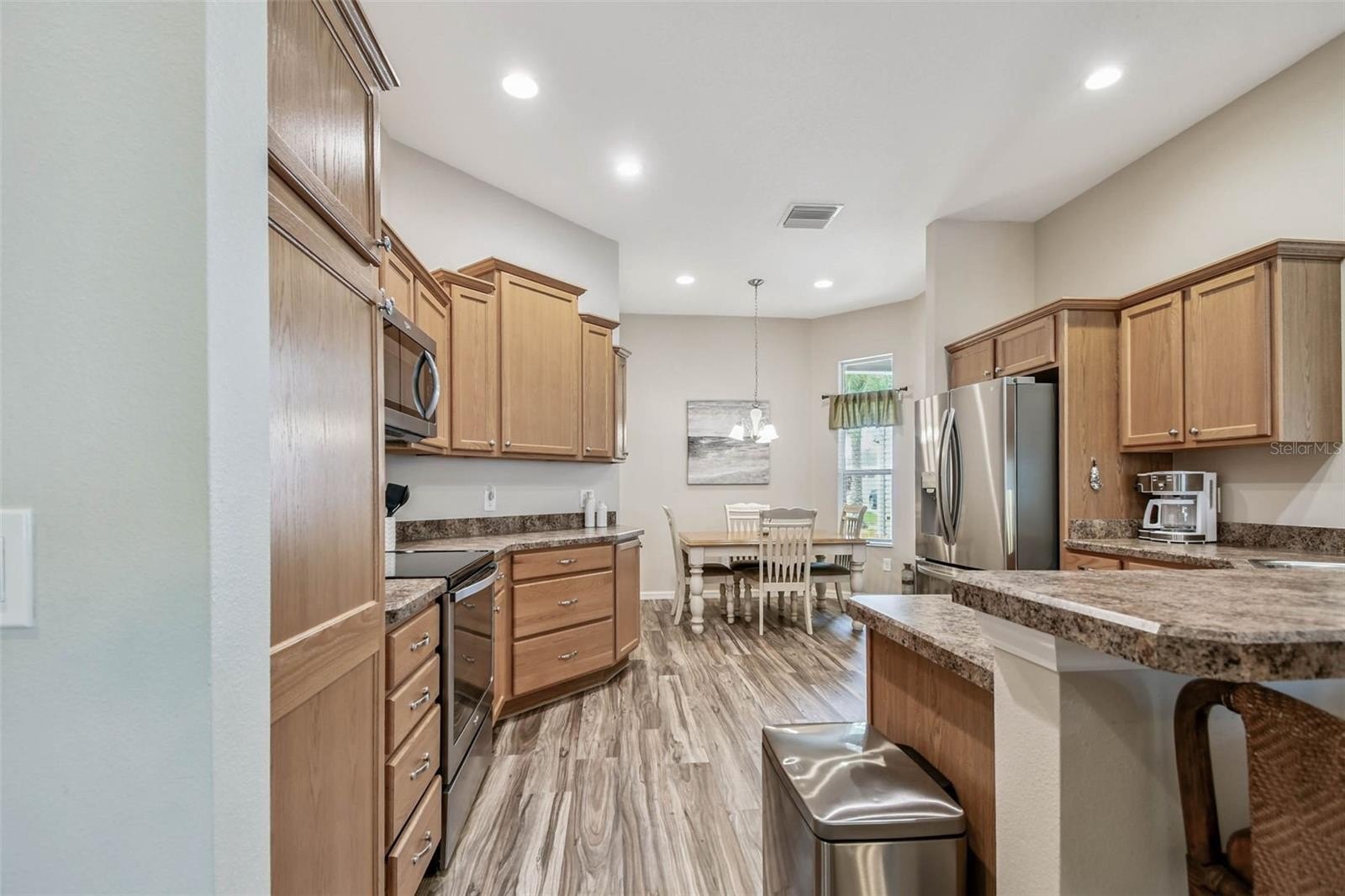The kitchen offers a large breakfast bar, stainless steel appliances, a French door refrigerator with dual ice makers, pull-out shelving, and a bright breakfast nook. The spacious primary suite features a tray ceiling, his-and-hers walk-in closets, and an ensuite bath with dual vanities, a Roman-style shower with decorative tile, and a private water closet. A pocket door separates the guest wing for added privacy, with two guest bedrooms—one perfectly suited as an office or flex space. The guest bath includes a tub/shower combo and natural light.