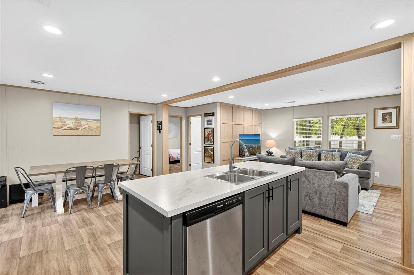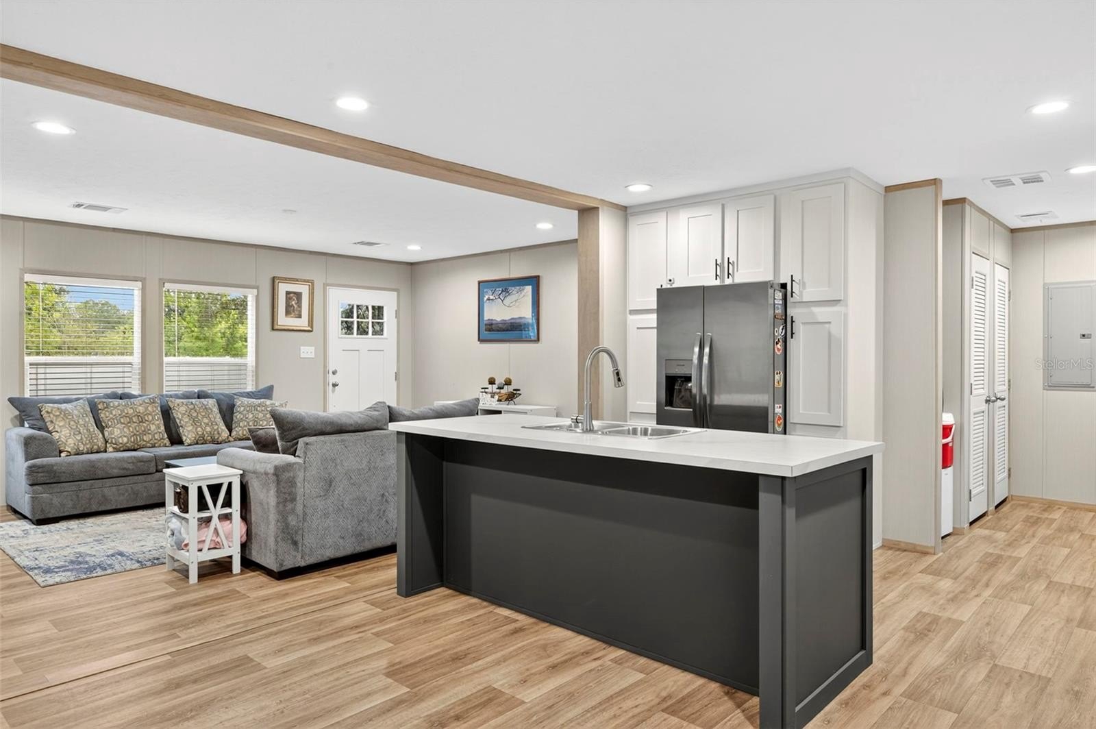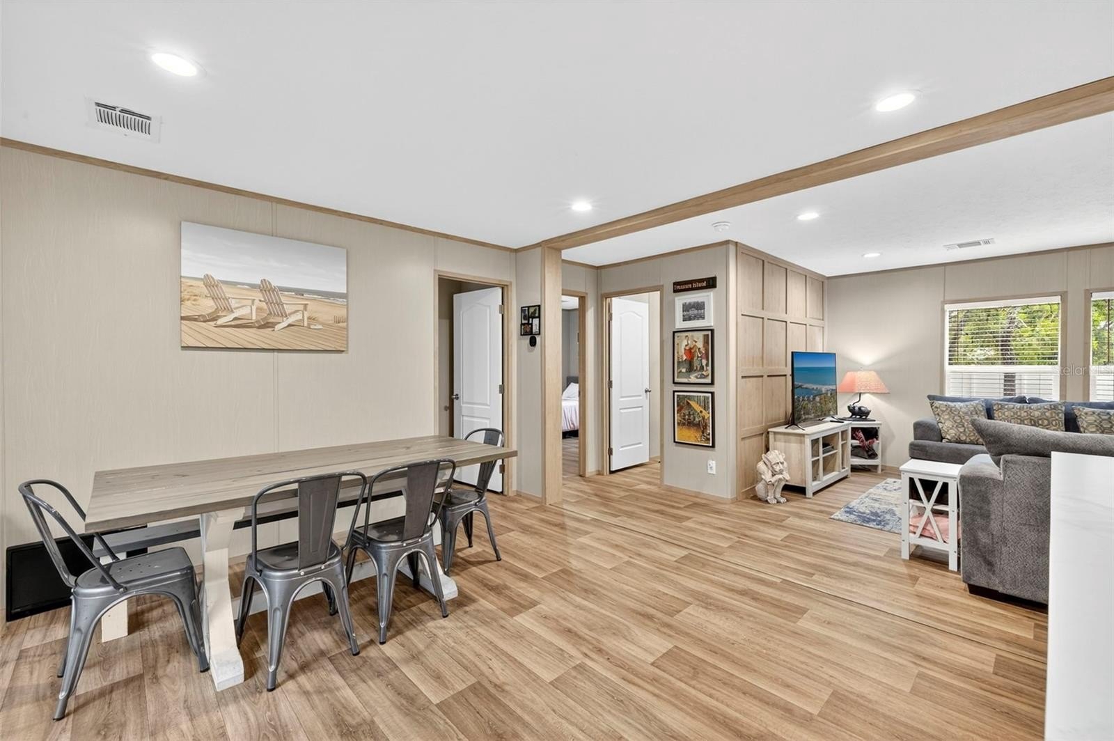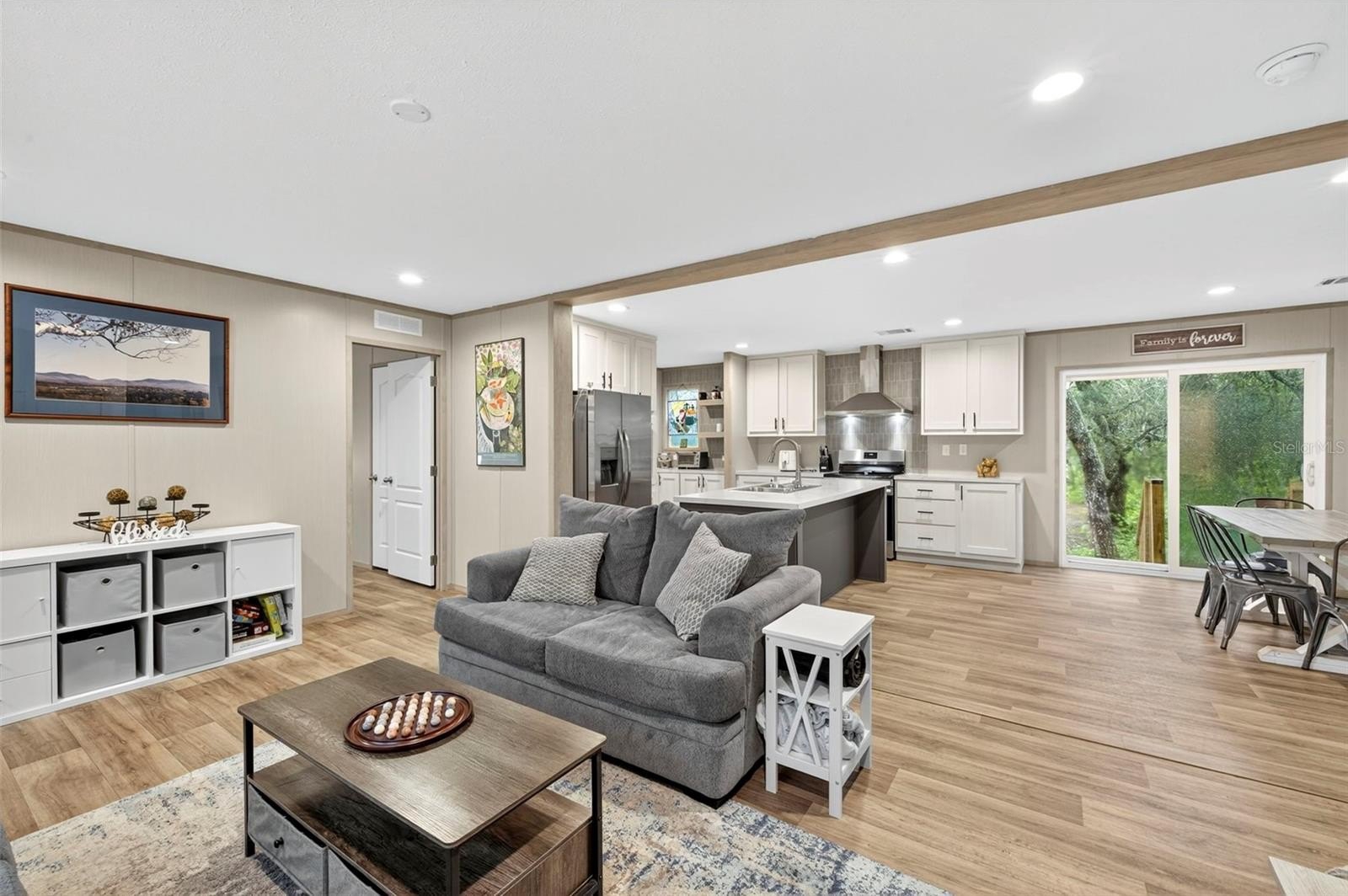 The home is a 2024 Clayton De Soto model featuring an open layout with luxury vinyl flooring throughout. Recessed lighting and a bright, functional design create a comfortable atmosphere. The kitchen includes an island with seating for three, stainless steel appliances, and ample cabinet space around the refrigerator and cooktop. Sliding doors open from the dining area to the backyard, perfect for indoor-outdoor living.
